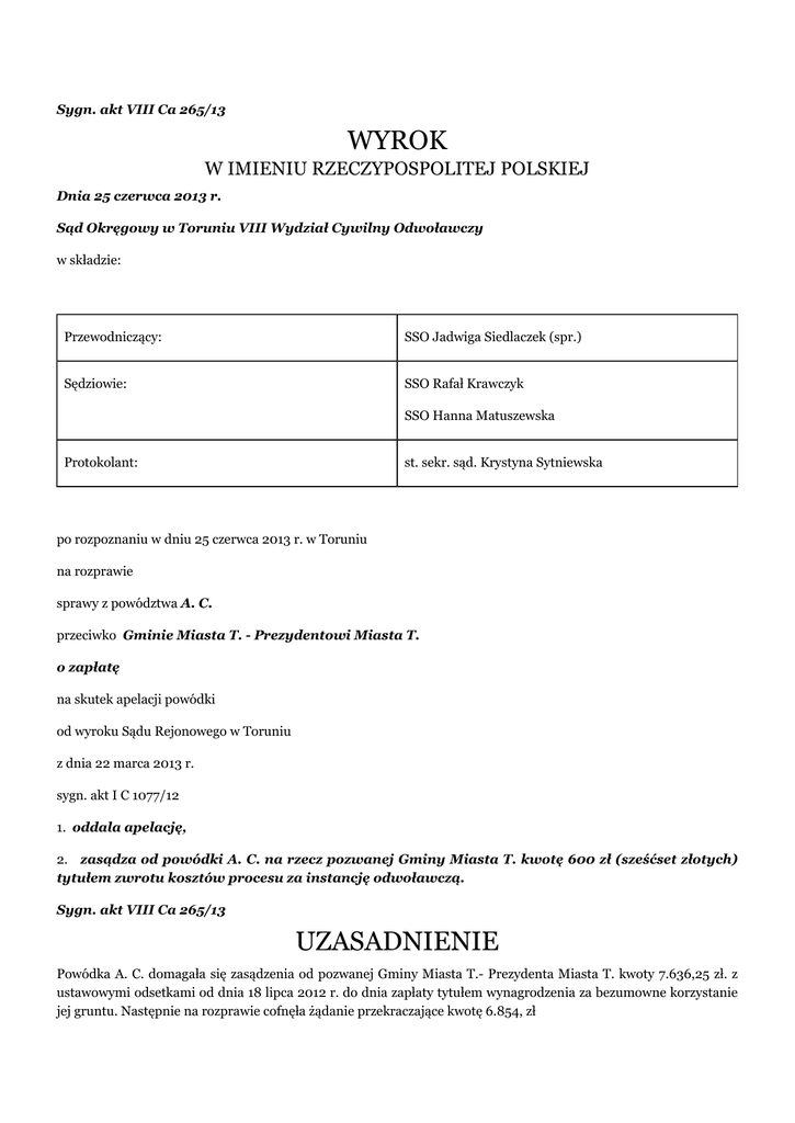 Sygn. akt VIII Ca 265/13 WYROK W IMIENIU RZECZYPOSPOLITEJ POLSKIEJ Dnia 25 czerwca 2013 r. Sąd Okręgowy w Toruniu VIII Wydział Cywilny Odwoławczy w składzie: Przewodniczący: SSO Jadwiga Siedlaczek (spr.) Sędziowie: SSO Rafał Krawczyk SSO Hanna Matuszewska Protokolant: st. sekr. sąd. Krystyna Sytniewska po rozpoznaniu w dniu 25 czerwca 2013 r. w Toruniu na rozprawie sprawy z powództwa A. C. przeciwko Gminie Miasta T. - Prezydentowi Miasta T. o zapłatę na skutek apelacji powódki od wyroku Sądu Rejonowego w Toruniu z dnia 22 marca 2013 r. sygn. akt I C 1077/12 1. oddala apelację, 2. zasądza od powódki A. C. na rzecz pozwanej Gminy Miasta T. kwotę 600 zł (sześćset złotych) tytułem zwrotu kosztów procesu za instancję odwoławczą. Sygn. akt VIII Ca 265/13 UZASADNIENIE Powódka A. C. domagała się zasądzenia od pozwanej Gminy Miasta T.- Prezydenta Miasta T. kwoty 7.636,25 zł. z ustawowymi odsetkami od dnia 18 lipca 2012 r. do dnia zapłaty tytułem wynagrodzenia za bezumowne korzystanie jej gruntu. Następnie na rozprawie cofnęła żądanie przekraczające kwotę 6.854, zł Wyrokiem z dnia 22 marca 2013 r. Sąd Rejonowy w Toruniu oddalił powództwo oraz zasądził od powódki A. C. na rzecz Gminy Miasta T. kwotę 1.200 zł tytułem kosztów procesu. Podstawą tego orzeczenia były następujące ustalenia faktyczne i oceny prawne: A. i S. C. byli współwłaścicielami nieruchomości położonej w T. przy ul. (...) KW nr (...) . Gmina Miasta T. zamierzała podjąć się realizacji inwestycji drogowej pod nazwą „Przebudowa ulicy (...) w T. na odcinku od ul. (...) do granic administracyjnych miasta”. Sporządzono projekt podziału nieruchomości poprzez wydzielenie m.in. działki nr (...), o powierzchni 149 m( 2) pod budowę drogi publicznej. Na podstawie operatu szacunkowego z dnia 6 czerwca 2007 r. za przedmiotową działkę zaproponowano odszkodowanie w kwocie 15.628,00 zł. Odszkodowanie w w/w wysokości zostało zaakceptowane przez właścicieli i Gmina Miasta T. przystąpiła do czynności zmierzających do zawarcia aktu notarialnego. W dniu 26 lipca 2007 r. zmarł współwłaściciel działki, która miała być wykupiona na poszerzenie drogi. Spadek po zmarłym S. C. w całości nabyła A. C.. Gmina Miasta T. zaproponowała A. C. termin zawarcia aktu notarialnego, ta zaś wycofała się z pierwotnych ustaleń co do kwoty odszkodowania. W marcu 2009 r. A. C. wyraziła zgodę na wejście na teren działki (...), a kwestia odpłatności w dalszym ciągu pozostawała sporna. Pismem z dnia 12 kwietnia 2011 r. wyznaczono A. C. 2-miesięczny termin do zawarcia umowy przenoszącej prawo własności nieruchomości położonej w T. przy ul. (...), oznaczonej działką nr (...) pod rygorem wszczęcia postępowania wywłaszczeniowego. W zakreślonym do tego terminie A. C. nie zawarła z Gminą Miasta T. aktu notarialnego. Natomiast z racji tego, że zamierzony cel inwestycyjny został zrealizowany w całości, to brak było ustawowych przesłanek do orzeczenia wywłaszczenia nieruchomości. W 2011 r. został wykonany nowy operat szacunkowy w związku ze zmianą przepisów dotyczących wyceny nieruchomości i operatów szacunkowych. Tym razem wartość rynkowa działki nr (...) została ustalona na kwotę 54.900,00 zł. W takim stanie rzeczy A. C. przedstawiono nową ofertę nabycia nieruchomości za kwotę 54.900,00 zł. A. C. przystała na w/w kwotę. W dniu 28 grudnia 2012 r. Gmina Miasta T. złożyła przed notariuszem oświadczenie, że w terminie do końca dnia 28 grudnia 2012 r. złoży do depozytu pieniężnego Kancelarii kwotę 54.900,00 zł. na poczet ceny sprzedaży działki nr (...). Ostatecznie w dniu 12 lutego 2013 r. doszło do nabycia przez Gminę Miasta T. nieruchomości położonej w T. przy ul. (...) stanowiącą działkę nr (...). Do czasu uregulowania stanu prawnego działki nr (...) Gmina Miasta T. nie płaciła A. C. za korzystanie z w/w działki. Tak więc powódka w okresie od marca 2009 r. do dnia wytoczenia powództwa była właścicielem działki nr (...), w tym czasie działka była wykorzystywana przez Gminę. Istota sporu sprowadzała się do ustalenia, czy pozwana był zobowiązany do zapłaty wynagrodzenia za korzystanie z nieruchomości, a jeżeli tak to w jakiej wysokości. W ocenie Sądu Rejonowego powództwo znajdowało swą podstawę w przepisach o ochronie własności (art. 224- 225 k.c.). Nie można uznać, iż pomiędzy stronami w sposób dorozumiany doszło do zawarcia umowy użyczenia, a zatem w niniejszej sprawie mają zastosowanie przepisy dotyczące ochrony własności. Z tych względów w ocenie Sądu powództwo, co do zasady zasługiwało na uwzględnienie. Natomiast co do wysokości roszczenia Sąd I instancji wskazał, że ciężar dowodu spoczywał na stronie powodowej. Pozwana zakwestionowała zarówno zasadę jak i wysokość roszczenia, zaś powódka działająca przez profesjonalnego pełnomocnika, przedstawiła żadnych dowodów na poparcie kwoty dochodzonej kwoty. Bez wątpienia takim środkiem dowodowym byłby wniosek o powołanie biegłego w zakresie szacowania nieruchomości. Powódka złożyła apelację od powyższego wyroku, zarzucając sprzeczność istotnych ustaleń sądu z treścią zebranego w sprawie materiału (art. 233 § 1 k.p.c.) tj. 1) uznanie, że powódka nie przedstawiła żadnych dowodów na poparcie kwoty dochodzonego roszczenia, a nadto uznaniem, że bez wątpienia takim dowodem mogłaby być opinia biegłego z zakresu wyceny nieruchomości 2) uznanie, że pozwana kwestionowała wysokość roszczenia stanowiącego wynagrodzenie za korzystanie z rzeczy Wniosła o zmianę zaskarżonego wyroku i uwzględnienie powództwa oraz zasądzenie na jej rzecz kosztów postępowania. W odpowiedzi na apelację pozwana wniosła o jej oddalenie oraz o zasądzenie od powódki na jej rzecz kosztów postępowania apelacyjnego. Sąd Okręgowy zważył, co następuje: Apelacja nie zasługiwała na uwzględni