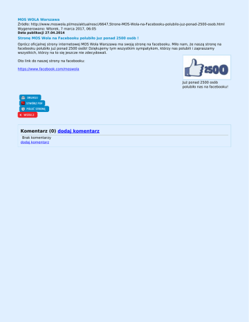 MOS WOLA Warszawa Źródło: http://www.moswola.pl/mos/aktualnosci/6647,Strone-MOS-Wola-na-Facebooku-polubilo-juz-ponad-2500-osob.html Wygenerowano: Wtorek, 7 marca 2017, 06:05 Data publikacji 27.04.2014 Stronę MOS Wola na Facebooku polubiło juz ponad 2500 osób ! Oprócz oficjalnej strony internetowej MOS Wola Warszawa ma swoją stronę na facebooku. Miło nam, że naszą stronę na facebooku polubiło już ponad 2500 osób! Dziękujemy tym wszystkim sympatykom, którzy nas polubili i zapraszamy wszystkich, którzy na to się jeszcze nie zdecydowali. Oto link do naszej strony na facebooku: https://www.facebook.com/moswola Już ponad 2500 osób polubiło nas na facebooku! Komentarz (0) dodaj komentarz Brak komentarzy dodaj komentarz