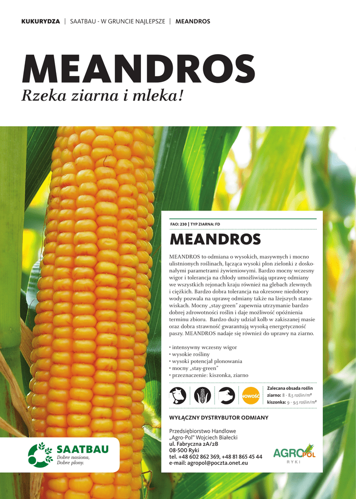 KUKURYDZA | SAATBAU - W GRUNCIE NAJLEPSZE | MEANDROS MEANDROS Rzeka ziarna i mleka! FAO: 230 TYP ZIARNA: FD MEANDROS MEANDROS to odmiana o wysokich, masywnych i mocno ulistnionych roślinach, łącząca wysoki plon zielonki z doskonałymi parametrami żywieniowymi. Bardzo mocny wczesny wigor i tolerancja na chłody umożliwiają uprawę odmiany we wszystkich rejonach kraju również na glebach zlewnych i ciężkich. Bardzo dobra tolerancja na okresowe niedobory wody pozwala na uprawę odmiany także na lżejszych stanowiskach. Mocny „stay-green” zapewnia utrzymanie bardzo dobrej zdrowotności roślin i daje możliwość opóźnienia terminu zbioru. Bardzo duży udział kolb w zakiszanej masie oraz dobra strawność gwarantują wysoką energetyczność paszy. MEANDROS nadaje się również do uprawy na ziarno. • intensywny wczesny wigor • wysokie rośliny • wysoki potencjał plonowania • mocny „stay-green” • przeznaczenie: kiszonka, ziarno NOWOŚĆ Zalecana obsada roślin ziarno: 8 - 8,5 roślin/m² kiszonka: 9 - 9,5 roślin/m² WYŁĄCZNY DYSTRYBUTOR ODMIANY Dobre nasiona, Dobre plony. Przedsiębiorstwo Handlowe „Agro-Pol” Wojciech Białecki ul. Fabryczna 2A/2B 08-500 Ryki tel. +48 602 862 369, +48 81 865 45 44 e-mail: [email protected]