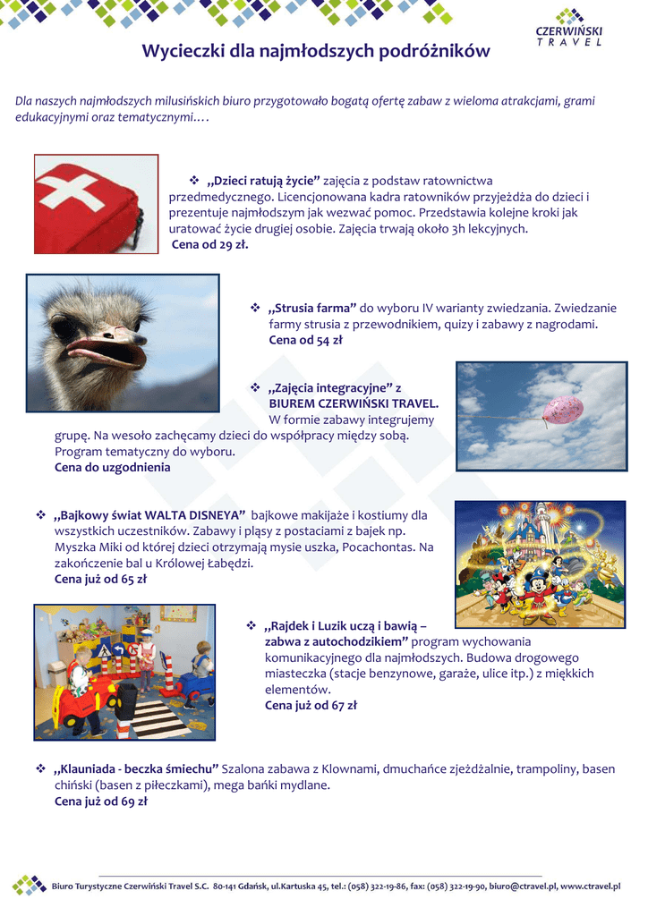 Wycieczki dla najmłodszych podróżników Dla naszych najmłodszych milusińskich biuro przygotowało bogatą ofertę zabaw z wieloma atrakcjami, grami edukacyjnymi oraz tematycznymi…. „Dzieci ratują życie” zajęcia z podstaw ratownictwa przedmedycznego. Licencjonowana kadra ratowników przyjeżdża do dzieci i prezentuje najmłodszym jak wezwać pomoc. Przedstawia kolejne kroki jak uratować życie drugiej osobie. Zajęcia trwają około 3h lekcyjnych. Cena od 29 zł. „Strusia farma” do wyboru IV warianty zwiedzania. Zwiedzanie farmy strusia z przewodnikiem, quizy i zabawy z nagrodami. Cena od 54 zł „Zajęcia integracyjne” z BIUREM CZERWIŃSKI TRAVEL. W formie zabawy integrujemy grupę. Na wesoło zachęcamy dzieci do współpracy między sobą. Program tematyczny do wyboru. Cena do uzgodnienia „Bajkowy świat WALTA DISNEYA” bajkowe makijaże i kostiumy dla wszystkich uczestników. Zabawy i pląsy z postaciami z bajek np. Myszka Miki od której dzieci otrzymają mysie uszka, Pocachontas. Na zakończenie bal u Królowej Łabędzi. Cena już od 65 zł „Rajdek i Luzik uczą i bawią – zabwa z autochodzikiem” program wychowania komunikacyjnego dla najmłodszych. Budowa drogowego miasteczka (stacje benzynowe, garaże, ulice itp.) z miękkich elementów. Cena już od 67 zł „Klauniada - beczka śmiechu” Szalona zabawa z Klownami, dmuchańce zjeżdżalnie, trampoliny, basen chiński (basen z piłeczkami), mega bańki mydlane. Cena już od 69 zł Wycieczki dla najmłodszych podróżników „Od ziarenka do bochenka” wizyta w Kaszubskiej chacie w dwóch wersjach miejscowości Szymbark lub Chmielno ..zabawy i zajęcia w podgrupach. W programie min. nauka pieczenia chleba, zwiedzanie gospodarstwa z przewodnika oraz wiele innych. Ceny już od 79 zł „Dziki, dziki zachód” wizyta w Indiańskiej wiosce, spotkanie z wielkim wodzem. Obrzędy i obyczaje plemienne . Zabawa z kowbojami (min. rzucanie podkową). Każdy z uczestników otrzyma własnoręcznie wykonany talizman, przepłynie się indiańską łodzią „canoe”. Cena od 79 zł „Piracka skrzynia atrakcji” spotkanie z piratami, strzelanie, pirackie tatuaże . Dla każdego „szczura lądowego” certyfikat oraz skórzana opaska na oko. W programie dance maty oraz gry na interaktywnych konsolach. Cena już od 79 zł „Piknik w Kaszubskiej Alasce” spotkanie ze zwierzątkami farmy kaszubskiej, zabawa integracja na świeżym powietrzu. Cena od 97 zł „Zajęcia wspinaczkowe w Kaszubskiej Alasce” w programie strzelanie z łuków oraz zajęcia wspinaczkowe: ścianka, skrzynki oraz drabinka. Cena od 99 zł „Odlotowe ZOO” wizyta w Gdańskim Porcie Lotniczym, zapoznanie się z funkcjonowaniem lotniska. Zabawa w ZOO, spotkanie z mieszkańcami Oliwskiego Parku. Cena do uzgodnienia *propozycje wycieczek nie stanowią oferty handlowej, cena uzależniona od liczby uczestników, terminu realizacji itp. Możliwość zorganizowania wycieczki również dla szkół spoza Trójmiasta. Szczegółowe oferty można uzyskać w biurze obsługi klienta BT Czerwiński Travel S.C. Ul. Kartuska 45 80-141 Gdańsk www.ctravel.pl e-mail: [email protected] telefon: 58 322 19 86 ZAPRASZAMY !!!