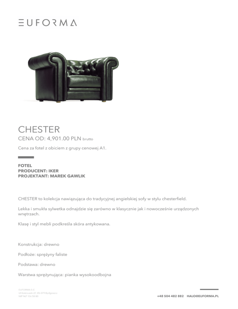 CHESTER CENA OD: 4,901.00 PLN brutto Cena za fotel z obiciem z grupy cenowej A1. FOTEL PRODUCENT: IKER PROJEKTANT: MAREK GAWLIK CHESTER to kolekcja nawiązująca do tradycyjnej angielskiej sofy w stylu chesterfield. Lekka i smukła sylwetka odnajdzie się zarówno w klasycznie jak i nowocześnie urządzonych wnętrzach. Klasę i styl mebli podkreśla skóra antykowana. Konstrukcja: drewno Podłoże: sprężyny faliste Podstawa: drewno Warstwa sprężynująca: pianka wysokoodbojna Powered by TCPDF (www.tcpdf.org)