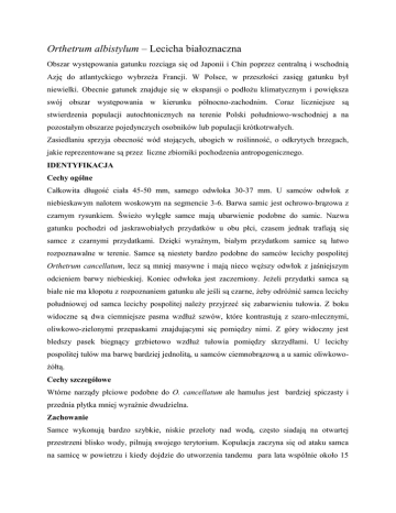 Orthetrum albistylum – Lecicha białoznaczna Obszar występowania gatunku rozciąga się od Japonii i Chin poprzez centralną i wschodnią Azję do atlantyckiego wybrzeża Francji. W Polsce, w przeszłości zasięg gatunku był niewielki. Obecnie gatunek znajduje się w ekspansji o podłożu klimatycznym i powiększa swój obszar występowania w kierunku północno-zachodnim. Coraz liczniejsze są stwierdzenia populacji autochtonicznych na terenie Polski południowo-wschodniej a na pozostałym obszarze pojedynczych osobników lub populacji krótkotrwałych. Zasiedlaniu sprzyja obecność wód stojących, ubogich w roślinność, o odkrytych brzegach, jakie reprezentowane są przez liczne zbiorniki pochodzenia antropogenicznego. IDENTYFIKACJA Cechy ogólne Całkowita długość ciała 45-50 mm, samego odwłoka 30-37 mm. U samców odwłok z niebieskawym nalotem woskowym na segmencie 3-6. Barwa samic jest ochrowo-brązowa z czarnym rysunkiem. Świeżo wylęgłe samce mają ubarwienie podobne do samic. Nazwa gatunku pochodzi od jaskrawobiałych przydatków u obu płci, czasem jednak trafiają się samce z czarnymi przydatkami. Dzięki wyraźnym, białym przydatkom samice są łatwo rozpoznawalne w terenie. Samce są niestety bardzo podobne do samców lecichy pospolitej Orthetrum cancellatum, lecz są mniej masywne i mają nieco węższy odwłok z jaśniejszym odcieniem barwy niebieskiej. Koniec odwłoka jest zaczerniony. Jeżeli przydatki samca są białe nie ma kłopotu z rozpoznaniem gatunku ale jeśli są czarne, żeby odróżnić samca lecichy południowej od samca lecichy pospolitej należy przyjrzeć się zabarwieniu tułowia. Z boku widoczne są dwa ciemniejsze pasma wzdłuż szwów, które kontrastują z szaro-mlecznymi, oliwkowo-zielonymi przepaskami znajdującymi się pomiędzy nimi. Z góry widoczny jest bledszy pasek biegnący grzbietowo wzdłuż tułowia pomiędzy skrzydłami. U lecichy pospolitej tułów ma barwę bardziej jednolitą, u samców ciemnobrązową a u samic oliwkowożółtą. Cechy szczegółowe Wtórne narządy płciowe podobne do O. cancellatum ale hamulus jest bardziej spiczasty i przednia płytka mniej wyraźnie dwudzielna. Zachowanie Samce wykonują bardzo szybkie, niskie przeloty nad wodą, często siadają na otwartej przestrzeni blisko wody, pilnują swojego terytorium. Kopulacja zaczyna się od ataku samca na samicę w powietrzu i kiedy dojdzie do utworzenia tandemu para lata wspólnie około 15 minut, czasem przysiadając na odkrytych partiach brzegu lub mieliznach, następnie dochodzi do rozdzielenia i samica zwykle składa jaja sama ale pod kontrolą samca, który lata wokół niej w odległości 30-40 cm. Osobniki dorosłe wylatują zwykle w połowie czerwca i można je spotkać do końca września. Międzywale Stobrawy - zbiornik wyrobiskowy, Jedlina - zbiorniki po wydobyciu żwiru , siedlisko siedlisko Orthetrum albistylum (fot. Adam Kuńka) Orthetrum albistylum (fot. Alicja Miszta) 06-06-2008 Kościerzyce - samica Orthetrum albistylum - widok z boku i z góry (fot. Adam Kuńka) 29-06-2008 Lasowice Małe – samiec Orthetrum albistylum - widok z boku i z góry (fot. Adam Kuńka) staw Piegża, samica 25-06-2008 okolice Stobrawy, samiec Orthetrum 28-07-2007, albistylum albistylum w pozycji spoczynkowej, widok z w pozycji spoczynkowej, oddalenia (fot. Adam Kuńka) widok z oddalenia (fot. Alicja Miszta) 12-07-2009 Nowy Staw, tandem Orthetrum abistylum, widok z oddalenia w czasie kopulacji i składania jaj (fot. Paweł Buczyński) Ubarwienie tułowia samicy Orthetrum albistylum (fot. Alicja Miszta) Orthetrum