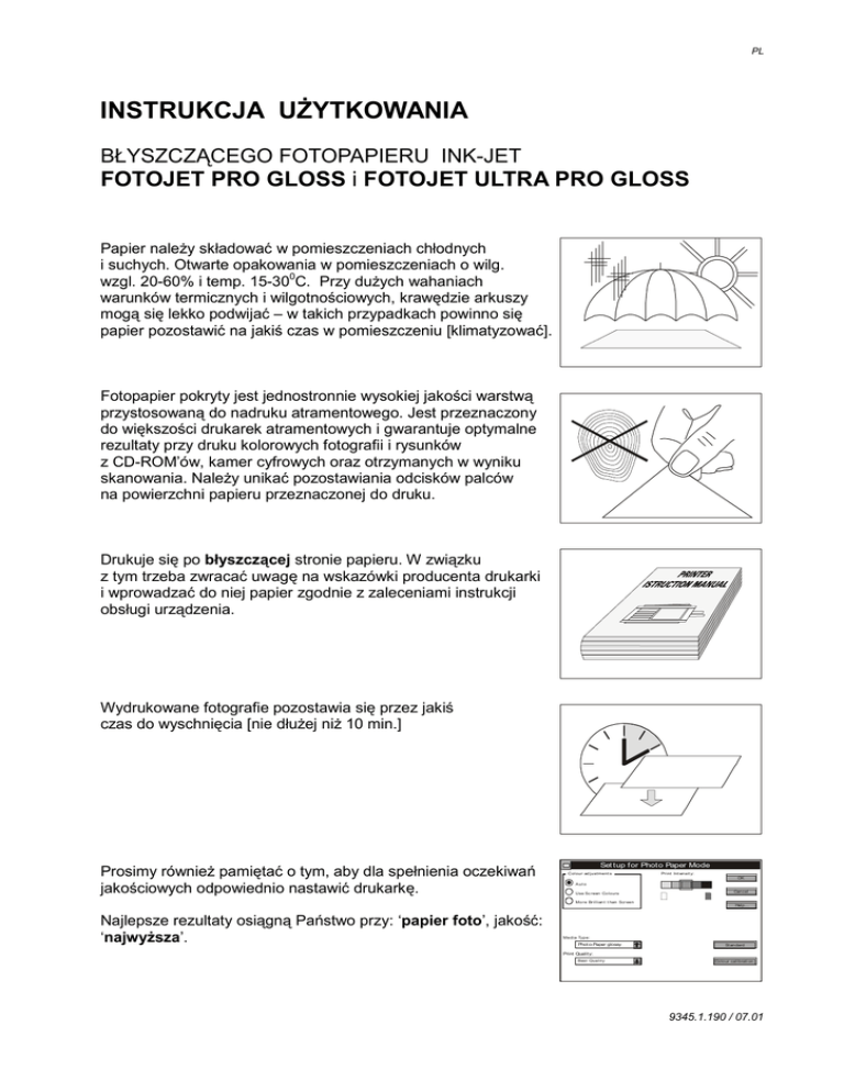 PL INSTRUKCJA U YTKOWANIA B&YSZCZ)CEGO FOTOPAPIERU INK-JET FOTOJET PRO GLOSS i FOTOJET ULTRA PRO GLOSS Papier nale0y sk2adowa4 w pomieszczeniach ch2odnych i suchych. Otwarte opakowania w pomieszczeniach o wilg. wzgl. 20-60% i temp. 15-300C. Przy du0ych wahaniach warunków termicznych i wilgotno>ciowych, kraw@dzie arkuszy mogA si@ lekko podwija4 – w takich przypadkach powinno si@ papier pozostawi4 na jaki> czas w pomieszczeniu [klimatyzowa4]. Fotopapier pokryty jest jednostronnie wysokiej jako>ci warstwA przystosowanA do nadruku atramentowego. Jest przeznaczony do wi@kszo>ci drukarek atramentowych i gwarantuje optymalne rezultaty przy druku kolorowych fotografii i rysunków z CD-ROM’ów, kamer cyfrowych oraz otrzymanych w wyniku skanowania. Nale0y unika4 pozostawiania odcisków palców na powierzchni papieru przeznaczonej do druku. Drukuje si@ po b yszcz cej stronie papieru. W zwiAzku z tym trzeba zwraca4 uwag@ na wskazówki producenta drukarki i wprowadza4 do niej papier zgodnie z zaleceniami instrukcji obs2ugi urzAdzenia. Wydrukowane fotografie pozostawia si@ przez jaki> czas do wyschni@cia [nie d2u0ej ni0 10 min.] Prosimy równie0 pami@ta4 o tym, aby dla spe2nienia oczekiwaH jako>ciowych odpowiednio nastawi4 drukark@. Set tup for Photo Paper Mode Colour ad just ment s Use Sc reen Co lours Mo re Brillian t t han Scr een Najlepsze rezultaty osiAgnA PaHstwo przy: ‘papier foto’, jako>4: ‘najwy'sza’. Print Int ensit y: OK Au t o Cancel Help... Media Type: Phot o-Paper glossy St andard Print Quality: Best Qualit y Colour calibrat ion 9345.1.190 / 07.01