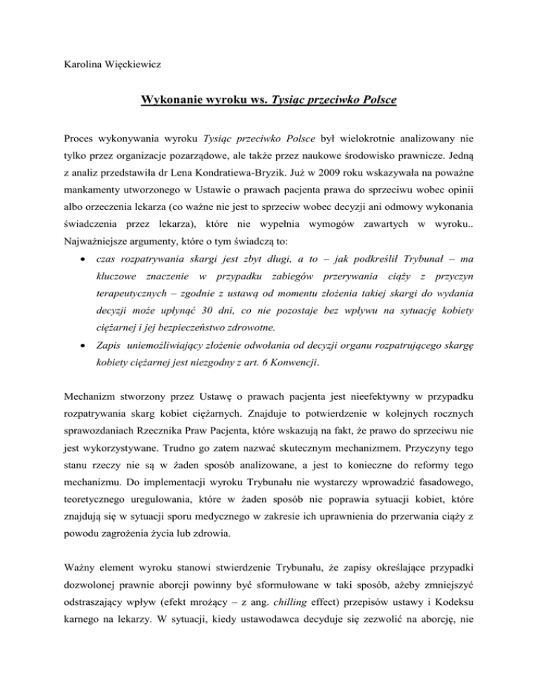 Karolina Więckiewicz Wykonanie wyroku ws. Tysiąc przeciwko Polsce Proces wykonywania wyroku Tysiąc przeciwko Polsce był wielokrotnie analizowany nie tylko przez organizacje pozarządowe, ale także przez naukowe środowisko prawnicze. Jedną z analiz przedstawiła dr Lena Kondratiewa-Bryzik. Już w 2009 roku wskazywała na poważne mankamenty utworzonego w Ustawie o prawach pacjenta prawa do sprzeciwu wobec opinii albo orzeczenia lekarza (co ważne nie jest to sprzeciw wobec decyzji ani odmowy wykonania świadczenia przez lekarza), które nie wypełnia wymogów zawartych w wyroku.. Najważniejsze argumenty, które o tym świadczą to: czas rozpatrywania skargi jest zbyt długi, a to – jak podkreślił Trybunał – ma kluczowe znaczenie w przypadku zabiegów przerywania ciąży z przyczyn terapeutycznych – zgodnie z ustawą od momentu złożenia takiej skargi do wydania decyzji może upłynąć 30 dni, co nie pozostaje bez wpływu na sytuację kobiety ciężarnej i jej bezpieczeństwo zdrowotne. Zapis uniemożliwiający złożenie odwołania od decyzji organu rozpatrującego skargę kobiety ciężarnej jest niezgodny z art. 6 Konwencji. Mechanizm stworzony przez Ustawę o prawach pacjenta jest nieefektywny w przypadku rozpatrywania skarg kobiet ciężarnych. Znajduje to potwierdzenie w kolejnych rocznych sprawozdaniach Rzecznika Praw Pacjenta, które wskazują na fakt, że prawo do sprzeciwu nie jest wykorzystywane. Trudno go zatem nazwać skutecznym mechanizmem. Przyczyny tego stanu rzeczy nie są w żaden sposób analizowane, a jest to konieczne do reformy tego mechanizmu. Do implementacji wyroku Trybunału nie wystarczy wprowadzić fasadowego, teoretycznego uregulowania, które w żaden sposób nie poprawia sytuacji kobiet, które znajdują się w sytuacji sporu medycznego w zakresie ich uprawnienia do przerwania ciąży z powodu zagrożenia życia lub zdrowia. Ważny element wyroku stanowi stwierdzenie Trybunału, że zapisy określające przypadki dozwolonej prawnie aborcji powinny być sformułowane w taki sposób, ażeby zmniejszyć odstraszający wpływ (efekt mrożący – z ang. chilling effect) przepisów ustawy i Kodeksu karnego na lekarzy. W sytuacji, kiedy ustawodawca decyduje się zezwolić na aborcję, nie wolno mu ukształtować ram prawnych w taki sposób, aby ograniczyć rzeczywistą możliwość jej przeprowadzenia. Elementami wykonania wyroku powinny być także: 1. działanie zmierzające do zmniejszenia tego odstraszającego wpływu i 2. krytyczna analiza przepisów obecnej ustawy zmierzająca do propozycji ich zmiany. Nic takiego nie miało w Polsce miejsca (o czym świadczy treść corocznych sprawozdań rządu z realizacji ustawy). Powyższe powinno być przez rząd wzięte pod uwagę tym bardziej, że zapadł kolejny wyrok w sprawie z zakresu zdrowia reprodukcyjnego – R.R. przeciwko Polsce, który również wskazuje na wspomniany efekt mrożący obecnych uregulowań ustawowych. W wyroku R.R. Trybunał po raz kolejny powtarza, że przesłanki do przeprowadzenia zabiegu w ustawie oraz przepisy kodeksu karnego powinny być tak sformułowane, żeby efekt mrożący zminimalizować. Polski rząd stoi zatem przed poważnym procesem reformy prawa aborcyjnego, gdyż stanowi to treść już dwóch wyroków, które zapadły przed Trybunałem. Warto jednocześnie podkreślić, że również standard uniwersalny, wyznaczany przez procedury kontrolne ONZ-owskiego systemu ochrony praw człowieka, wskazuje na zobowiązania państwa podobne do tych, które zdefiniował Trybunał w wyroku w sprawie Tysiąc – przykładem są sprawy K.L. przeciwko Peru i V.D.A. (L.M.R.) przeciwko Argentynie rozstrzygnięte przed Komitetem Praw Człowieka, uwagi końcowe Komitetu Praw Człowieka i Komitetu CEDAW, komentarze ogólne CEDAW nr 19 (przemoc wobec kobiet) i 24 (zdrowie). Zgodnie z nimi brak realizacji praw kobiet w zakresie dozwolonej prawem aborcji może stanowić nierówne traktowanie ze względu na płeć a także nieludzkie i poniżające traktowanie. Niewykonanie wyroku w sprawie Tysiąc jest dowodem na brak bądź to zdolności, bądź też, co gorsze, woli państwa polskiego do ochrony praw kobiet w zakresie zdrowia reprodukcyjnego, które ochrony tej potrzebują w sposób szczególny. Najlepszym dowodem na to, że sprawa dostępu do legalnej aborcji nie jest uznana za ważną są kolejne postępowania na szczeblu krajowym oraz przed Europejskim Trybunałem Praw Człowieka.