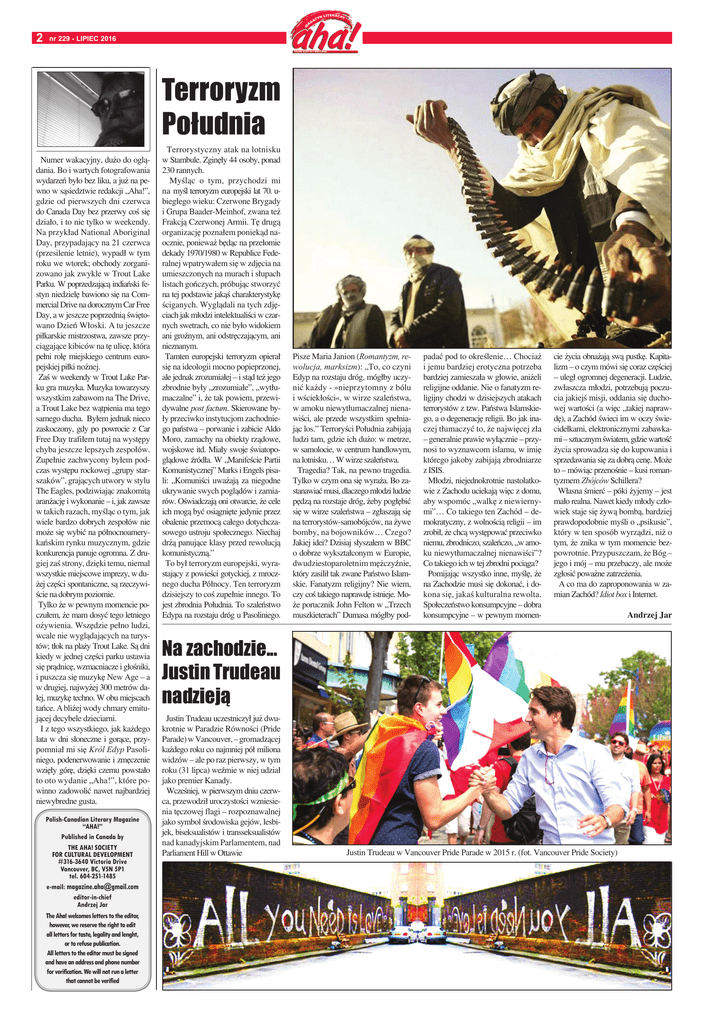 2 nr 229 - LIPIEC 2016 Terroryzm Południa Numer wakacyjny, dużo do oglądania. Bo i wartych fotografowania wydarzeń było bez liku, a już na pewno w sąsiedztwie redakcji „Aha!”, gdzie od pierwszych dni czerwca do Canada Day bez przerwy coś się działo, i to nie tylko w weekendy. Na przykład National Aboriginal Day, przypadający na 21 czerwca (przesilenie letnie), wypadł w tym roku we wtorek; obchody zorganizowano jak zwykle w Trout Lake Parku. W poprzedzającą indiański festyn niedzielę bawiono się na Commercial Drive na dorocznym Car Free Day, a w jeszcze poprzednią świętowano Dzień Włoski. A tu jeszcze piłkarskie mistrzostwa, zawsze przyciągające kibiców na tę ulicę, która pełni rolę miejskiego centrum europejskiej piłki nożnej. Zaś w weekendy w Trout Lake Parku gra muzyka. Muzyka towarzyszy wszystkim zabawom na The Drive, a Trout Lake bez wątpienia ma tego samego ducha. Byłem jednak nieco zaskoczony, gdy po powrocie z Car Free Day trafiłem tutaj na występy chyba jeszcze lepszych zespołów. Zupełnie zachwycony byłem podczas występu rockowej „grupy starszaków”, grających utwory w stylu The Eagles, podziwiając znakomitą aranżację i wykonanie – i, jak zawsze w takich razach, myśląc o tym, jak wiele bardzo dobrych zespołów nie może się wybić na północnoamerykańskim rynku muzycznym, gdzie konkurencja panuje ogromna. Z drugiej zaś strony, dzięki temu, niemal wszystkie miejscowe imprezy, w dużej części spontaniczne, są rzeczywiście na dobrym poziomie. Tylko że w pewnym momencie poczułem, że mam dosyć tego letniego ożywienia. Wszędzie pełno ludzi, wcale nie wyglądających na turystów; tłok na plaży Trout Lake. Są dni kiedy w jednej części parku ustawia się prądnicę, wzmacniacze i głośniki, i puszcza się muzykę New Age – a w drugiej, najwyżej 300 metrów dalej, muzykę techno. W obu miejscach tańce. A bliżej wody chmary emitującej decybele dzieciarni. I z tego wszystkiego, jak każdego lata w dni słoneczne i gorące, przypomniał mi się Król Edyp Pasoliniego, podenerwowanie i zmęczenie wzięły górę, dzięki czemu powstało to oto wydanie „Aha!”, które powinno zadowolić nawet najbardziej niewybredne gusta. Polish-Canadian Literary Magazine “AHA!” Published in Canada by THE AHA! SOCIETY FOR CULTURAL DEVELOPMENT #316-3640 Victoria Drive Vancouver, BC, V5N 5P1 tel. 604-251-1485 e-mail: [email protected] editor-in-chief Andrzej Jar The Aha! welcomes letters to the editor, however, we reserve the right to edit all letters for taste, legality and lenght, or to refuse publication. All letters to the editor must be signed and have an address and phone number for verification. We will not run a letter that cannot be verified Terrorystyczny atak na lotnisku w Stambule. Zginęły 44 osoby, ponad 230 rannych. Myśląc o tym, przychodzi mi na myśl terroryzm europejski lat 70. ubiegłego wieku: Czerwone Brygady i Grupa Baader-Meinhof, zwana też Frakcją Czerwonej Armii. Tę drugą organizację poznałem poniekąd naocznie, ponieważ będąc na przełomie dekady 1970/1980 w Republice Federalnej wpatrywałem się w zdjęcia na umieszczonych na murach i słupach listach gończych, próbując stworzyć na tej podstawie jakąś charakterystykę ściganych. Wyglądali na tych zdjęciach jak młodzi intelektualiści w czarnych swetrach, co nie było widokiem ani groźnym, ani odstręczającym, ani nieznanym. Tamten europejski terroryzm opierał się na ideologii mocno popieprzonej, ale jednak zrozumiałej – i stąd też jego zbrodnie były „zrozumiałe”, „wytłumaczalne” i, że tak powiem, przewidywalne post factum. Skierowane były przeciwko instytucjom zachodniego państwa – porwanie i zabicie Aldo Moro, zamachy na obiekty rządowe, wojskowe itd. Miały swoje światopoglądowe źródła. W „Manifeście Partii Komunistycznej” Marks i Engels pisali: „Komuniści uważają za niegodne ukrywanie swych poglądów i zamiarów. Oświadczają oni otwarcie, że cele ich mogą być osiągnięte jedynie przez obalenie przemocą całego dotychczasowego ustroju społecznego. Niechaj drżą panujące klasy przed rewolucją komunistyczną.” To był terroryzm europejski, wyrastający z powieści gotyckiej, z mrocznego ducha Północy. Ten terroryzm dzisiejszy to coś zupełnie innego. To jest zbrodnia Południa. To szaleństwo Edypa na rozstaju dróg u Pasoliniego. Pisze Maria Janion (Romantyzm, rewolucja, marksizm): „To, co czyni Edyp na rozstaju dróg, mógłby uczynić każdy - »nieprzytomny z bólu i wściekłości«, w wirze szaleństwa, w amoku niewytłumaczalnej nienawiści, ale przede wszystkim spełniając los.” Terroryści Południa zabijają ludzi tam, gdzie ich dużo: w metrze, w samolocie, w centrum handlowym, na lotnisku… W wirze szaleństwa. Tragedia? Tak, na pewno tragedia. Tylko w czym ona się wyraża. Bo zastanawiać musi, dlaczego młodzi ludzie pędzą na rozstaje dróg, żeby pogłębić się w wirze szaleństwa – zgłaszają się na terrorystów-samobójców, na żywe bomby, na bojowników… Czego? Jakiej idei? Dzisiaj słyszałem w BBC o dobrze wykształconym w Europie, dwudziestoparoletnim mężczyźnie, który zasilił tak zwane Państwo Islamskie. Fanatyzm religijny? Nie wiem, czy coś takiego naprawdę istnieje. Może porucznik John Felton w „Trzech muszkieterach” Dumasa mógłby pod- padać pod to określenie… Chociaż i jemu bardziej erotyczna potrzeba bardziej zamieszała w głowie, aniżeli religijne oddanie. Nie o fanatyzm religijny chodzi w dzisiejszych atakach terrorystów z tzw. Państwa Islamskiego, a o degenerację religii. Bo jak inaczej tłumaczyć to, że najwięcej zła – generalnie prawie wyłącznie – przynosi to wyznawcom islamu, w imię którego jakoby zabijają zbrodniarze z ISIS. Młodzi, niejednokrotnie nastolatkowie z Zachodu uciekają więc z domu, aby wspomóc „walkę z niewiernymi”… Co takiego ten Zachód – demokrat
