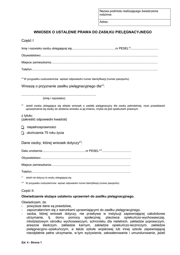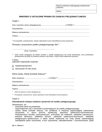 Nazwa podmiotu realizującego świadczenia rodzinne: Adres: WNIOSEK O USTALENIE PRAWA DO ZASIŁKU PIELĘGNACYJNEGO Część I ) Imię i nazwisko osoby ubiegającej się:...................................................nr PESEL* :................................ Obywatelstwo:........................................................................................................................................... Miejsce zamieszkania:.............................................................................................................................. Telefon:..................................................................................................................................................... ) * W przypadku cudzoziemców wpisać odpowiedni numer identyfikacji (numer paszportu) Wnoszę o przyznanie zasiłku pielęgnacyjnego dla*): .......................................................................... (imię i nazwisko) ) * Jeżeli osoba ubiegająca się składa wniosek o zasiłek pielęgnacyjny dla osoby pełnoletniej, musi przedstawić upoważnienie tej osoby do złożenia wniosku w jej imieniu, chyba że jest opiekunem prawnym. z tytułu: (zakreślić odpowiedni kwadrat) niepełnosprawności ukończenia 75 roku życia Dane osoby, której wniosek dotyczy*): ) Data urodzenia:...................................................nr PESEL** ................................... Obywatelstwo:........................................................................................................... Miejsce zamieszkania:.............................................................................................. Telefon:..................................................................................................................... *) Jeżeli nie dotyczy to osoby ubiegającej się. ) ** W przypadku cudzoziemców wpisać odpowiedni numer identyfikacji (numer paszportu) Część II. Oświadczenie służące ustaleniu uprawnień do zasiłku pielęgnacyjnego. Oświadczam, że: - powyższe dane są prawdziwe, - zapoznałam/em się z warunkami uprawniającymi do zasiłku pielęgnacyjnego, - osoba, której wniosek dotyczy, nie przebywa w instytucji zapewniającej całodobowe utrzymanie, tj. domu pomocy społecznej, placówce opiekuńczo-wychowawczej, młodzieżowym ośrodku wychowawczym, schronisku dla nieletnich, zakładzie poprawczym, areszcie śledczym, zakładzie karnym, zakładzie opiekuńczo-leczniczym, zakładzie pielęgnacyjno–opiekuńczym, a także szkole wojskowej lub innej szkole zapewniającej nieodpłatnie pełne utrzymanie, w tym wyżywienie, zakwaterowanie i umundurowanie, jeżeli Zał. 4 - Strona 1 - pobyt osoby i udzielane przez tę instytucję świadczenia częściowo lub w całości finansowane są z budżetu państwa albo z Narodowego Funduszu Zdrowia, osoba, której wniosek dotyczy nie pobiera zasiłku pielęgnacyjnego w innej instytucji, osoba, której wniosek dotyczy nie jest uprawniona do dodatku pielęgnacyjnego, zamieszkiwałam/em na terytorium Rzeczypospolitej Polskiej w okresie 1 roku poprzedzającego okres zasiłkowy, w przypadku wyjazdu poza granicę Rzeczypospolitej Polskiej zobowiązuję się do niezwłocznego poinformowania o tym fakcie organu właściwego. Zobowiązuję się niezwłocznie powiadomić podmiot wypłacający zasiłek pielęgnacyjny o każdej zmianie mającej wpływ na prawo do zasiłku pielęgnacyjnego. ...................................................... (data, podpis ubiegającej się) Do wniosku dołączam następujące dokumenty: 1) .................................................................................................................................. 2) .................................................................................................................................. 3) .................................................................................................................................. 4) .................................................................................................................................. Pouczenie Zasiłek pielęgnacyjny przysługuje: 1) niepełnosprawnemu dziecku; 2) osobie niepełnosprawnej w wieku powyżej 16 roku życia, jeżeli legitymuje się orzeczeniem o znacznym stopniu niepełnosprawności; 3) osobie, która ukończyła 75 rok życia (art. 16 ust. 2 ustawy z dnia 28 listopada 2003 r. o świadczeniach rodzinnych) Zasiłek pielęgnacyjny przysługuje także osobie niepełnosprawnej w wieku powyżej 16 roku życia, legitymującej się orzeczeniem o umiarkowanym stopniu niepełnosprawności, jeżeli niepełnosprawność powstała w wieku do ukończenia 21 roku życia. Zasiłek pielęgnacyjny przysługuje: 1) obywatelom polskim, 2) cudzoziemcom posiadającym obywatelstwo państwa członkowskiego Unii Europejskiej lub Europejskiego Obszaru Gospodarczego, 3) cudzoziemcom przebywającym na terytorium Rzeczpospolitej Polskiej na podstawie zezwolenia na osiedlenie się, zezwolenia na pobyt rezydenta długoterminowego Wspólnot Europejskich, zezwolenia na zamieszkanie na czas oznaczony udzielonego w związku z okolicznością, o której mowa w art. 53 ust. 1 pkt 13 ustawy z dnia 13 czerwca 2003 r. o cudzoziemcach (Dz. U. Nr 128, poz. 1175, z późn. zm.), zgody na pobyt tolerowany lub w związku z uzyskaniem w Rzeczpospolitej Polskiej statusu uchodźcy, jeżeli zamieszkują łącznie z członkami rodzin na terytorium Rzeczpospolitej Polskiej - jeżeli zamieszkują na terytorium Rzeczpospolitej Polskiej przez okres co najmniej 1 roku przed złożeniem wniosku oraz przez okres , w którym otrzymują zasiłek pielęgnacyjny (art. 1 ustawy z dnia 28 listopada 2003 r. o świadczeniach rodzinnych). Zasiłek pielęgnacyjny nie przysługuje: - osobie przebywającej w instytucji zapewniającej całodobowe utrzymanie tj. domu pomocy społecznej, placówce opiekuńczo wychowawczej, schronisku dla nieletnich, młodzieżowym ośrodku wychowawczym, zakładzie poprawc
