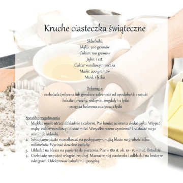 Kr�che ciasteczka świąteczne Składniki: Mąka: 300 g�amów Cukier: 100 g�amów Jajko: 1 szt. Cukier waniliowy: 1 paczka Masło: 200 g�amów Miód: 1 ł�żka Dekoracja: - czekolada (mleczna lub gorzka w zależności od upodobań): 2 szt�ki - bakalie (orzechy, rodzy�ki, migdał�): 2 ł�żki - posy�ka kolorowa cukrowa: 2 ł�żki Sposób przygotowania 1. Miękkie masło ut�zeć dokładnie z cukrem. Pod koniec ucierania dodać jajko. Wsy�ać mąkę, cukier waniliowy i dodać miód. Wszystko razem wy�ieszać i odstawić na 30 minut do lodówki. 2. Schłodzone ciasto rozwałkować na podsy�any� mąką blacie na g��bość kilku milimet�ów. Wycinać dowolne kształ��. 3. Układać na blasze na papierze do pieczenia. Piec w 180 st. ok. 10 - 15 minut. Ost�dzić. 4. Czekoladę rozpuścić w kąpieli wodnej. Maczać w niej ciasteczka i odkładać na kratce w odstępach. Udekorować bakaliami i posy�ką.