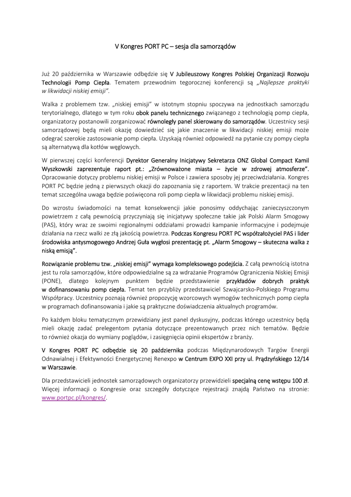 V Kongres PORT PC – sesja dla samorządów Już 20 października w Warszawie odbędzie się V Jubileuszowy Kongres Polskiej Organizacji Rozwoju Technologii Pomp Ciepła. Tematem przewodnim tegorocznej konferencji są „Najlepsze praktyki w likwidacji niskiej emisji”. Walka z problemem tzw. „niskiej emisji” w istotnym stopniu spoczywa na jednostkach samorządu terytorialnego, dlatego w tym roku obok panelu technicznego związanego z technologią pomp ciepła, organizatorzy postanowili zorganizować równoległy panel skierowany do samorządów. Uczestnicy sesji samorządowej będą mieli okazję dowiedzieć się jakie znaczenie w likwidacji niskiej emisji może odegrać szerokie zastosowanie pomp ciepła. Uzyskają również odpowiedź na pytanie czy pompy ciepła są alternatywą dla kotłów węglowych. W pierwszej części konferencji Dyrektor Generalny Inicjatywy Sekretarza ONZ Global Compact Kamil Wyszkowski zaprezentuje raport pt.: „Zrównoważone miasta – życie w zdrowej atmosferze”. Opracowanie dotyczy problemu niskiej emisji w Polsce i zawiera sposoby jej przeciwdziałania. Kongres PORT PC będzie jedną z pierwszych okazji do zapoznania się z raportem. W trakcie prezentacji na ten temat szczególna uwaga będzie poświęcona roli pomp ciepła w likwidacji problemu niskiej emisji. Do wzrostu świadomości na temat konsekwencji jakie ponosimy oddychając zanieczyszczonym powietrzem z całą pewnością przyczyniają się inicjatywy społeczne takie jak Polski Alarm Smogowy (PAS), który wraz ze swoimi regionalnymi oddziałami prowadzi kampanie informacyjne i podejmuje działania na rzecz walki ze złą jakością powietrza. Podczas Kongresu PORT PC współzałożyciel PAS i lider środowiska antysmogowego Andrzej Guła wygłosi prezentację pt. „Alarm Smogowy – skuteczna walka z niską emisją”. Rozwiązanie problemu tzw. „niskiej emisji” wymaga kompleksowego podejścia. Z całą pewnością istotna jest tu rola samorządów, które odpowiedzialne są za wdrażanie Programów Ograniczenia Niskiej Emisji (PONE), dlatego kolejnym punktem będzie przedstawienie przykładów dobrych praktyk w dofinansowaniu pomp ciepła. Temat ten przybliży przedstawiciel Szwajcarsko‐Polskiego Programu Współpracy. Uczestnicy poznają również propozycję wzorcowych wymogów technicznych pomp ciepła w programach dofinansowania i jakie są praktyczne doświadczenia aktualnych programów. Po każdym bloku tematycznym przewidziany jest panel dyskusyjny, podczas którego uczestnicy będą mieli okazję zadać prelegentom pytania dotyczące prezentowanych przez nich tematów. Będzie to również okazja do wymiany poglądów, i zasięgnięcia opinii ekspertów z branży. V Kongres PORT PC odbędzie się 20 października podczas Międzynarodowych Targów Energii Odnawialnej i Efektywności Energetycznej Renexpo w Centrum EXPO XXI przy ul. Prądzyńskiego 12/14 w Warszawie. Dla przedstawicieli jednostek samorządowych organizatorzy przewidzieli specjalną cenę wstępu 100 zł. Więcej informacji o Kongresie oraz szczegóły dotyczące rejestracji znajdą Państwo na stronie: www.portpc.pl/kongres/.