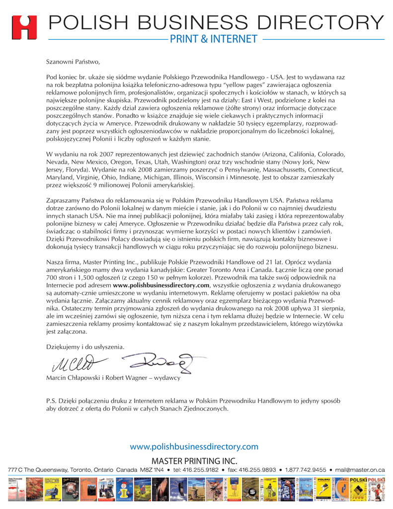 POLISH BUSINESS DIRECTORY PRINT & INTERNET Szanowni Paƒstwo, Pod koniec br. uka˝e si´ siódme wydanie Polskiego Przewodnika Handlowego - USA. Jest to wydawana raz na rok bezp∏atna polonijna ksià˝ka telefoniczno-adresowa typu “yellow pages” zawierajàca og∏oszenia reklamowe polonijnych firm, profesjonalistów, organizacji spo∏ecznych i koÊcio∏ów w stanach, w których sà najwi´ksze polonijne skupiska. Przewodnik podzielony jest na dzia∏y: East i West, podzielone z kolei na poszczególne stany. Ka˝dy dzia∏ zawiera og∏oszenia reklamowe (˝ó∏te strony) oraz informacje dotyczàce poszczególnych stanów. Ponadto w ksià˝ce znajduje si´ wiele ciekawych i praktycznych informacji dotyczàcych ˝ycia w Ameryce. Przewodnik drukowany w nak∏adzie 50 tysi´cy egzemplarzy, rozprowadzany jest poprzez wszystkich og∏oszeniodawców w nak∏adzie proporcjonalnym do liczebnoÊci lokalnej, polskoj´zycznej Polonii i liczby og∏oszeƒ w ka˝dym stanie. W wydaniu na rok 2007 reprezentowanych jest dziewi´ç zachodnich stanów (Arizona, Califonia, Colorado, Nevada, New Mexico, Oregon, Texas, Utah, Washington) oraz trzy wschodnie stany (Nowy Jork, New Jersey, Floryda). Wydanie na rok 2008 zamierzamy poszerzyç o Pensylwani´, Massachussetts, Connecticut, Maryland, Virgini´, Ohio, Indian´, Michigan, Illinois, Wisconsin i Minnesot´. Jest to obszar zamieszka∏y przez wi´kszoÊç 9 milionowej Polonii amerykaƒskiej. Zapraszamy Paƒstwa do reklamowania si´ w Polskim Przewodniku Handlowym USA. Paƒstwa reklama dotrze zarówno do Polonii lokalnej w danym mieÊcie i stanie, jak i do Polonii w co najmniej dwudziestu innych stanach USA. Nie ma innej publikacji polonijnej, która mia∏aby taki zasi´g i która reprezentowa∏aby polonijne biznesy w ca∏ej Ameryce. Og∏oszenie w Przewodniku dzia∏aç b´dzie dla Paƒstwa przez ca∏y rok, Êwiadczàc o stabilnoÊci firmy i przynoszàc wymierne korzyÊci w postaci nowych klientów i zamówieƒ. Dzi´ki Przewodnikowi Polacy dowiadujà si´ o istnieniu polskich firm, nawiàzujà kontakty biznesowe i dokonujà tysi´cy transakcji handlowych w ciàgu roku przyczyniajàc si´ do rozwoju polonijnego biznesu. Nasza firma, Master Printing Inc., publikuje Polskie Przewodniki Handlowe od 21 lat. Oprócz wydania amerykaƒskiego mamy dwa wydania kanadyjskie: Greater Toronto Area i Canada. ¸àcznie liczà one ponad 700 stron i 1,500 og∏oszeƒ (z czego 150 w pe∏nym kolorze). Przewodnik ma tak˝e swój odpowiednik na Internecie pod adresem www.polishbusinessdirectory.com, wszystkie og∏oszenia z wydania drukowanego sà automaty-cznie umieszczone w wydaniu internetowym. Reklam´ oferujemy w postaci pakietów na oba wydania ∏àcznie. Za∏àczamy aktualny cennik reklamowy oraz egzemplarz bie˝àcego wydania Przewodnika. Ostateczny termin przyjmowania zg∏oszeƒ do wydania drukowanego na rok 2008 up∏ywa 31 sierpnia, ale im wczeÊniej zamówi si´ og∏oszenie, tym ni˝sza cena i tym reklama d∏u˝ej b´dzie w Internecie. W celu zamieszczenia reklamy prosimy kontaktowaç si´ z naszym lokalnym przedstawicielem, którego wizytówka jest za∏àczona. Dzi´kujemy i do us∏yszenia. Marcin Ch∏apowski i Robert Wagner – wydawcy P.S. Dzi´ki po∏àczeniu druku z Internetem reklama w Polskim Przewodniku Handlowym to jedyny sposób aby dotrzeç z ofertà do Polonii w ca∏ych Stanach Zjednoczonych. www.polishbusinessdirectory.com MASTER PRINTING INC. USA • CANADA Roman Niemczynski Advertising Consultant HEAD OFFICE 777 C Queensway, Toronto ON Canada M8Z 1N4 Tel: 416-255-9182 [email protected] Toll free:1-877-742-9455 Tel: 602.978.1697 [email protected] 3521 West Joan D’Arc, Phoenix AZ 85029 www.przewodnikhandlowy.com