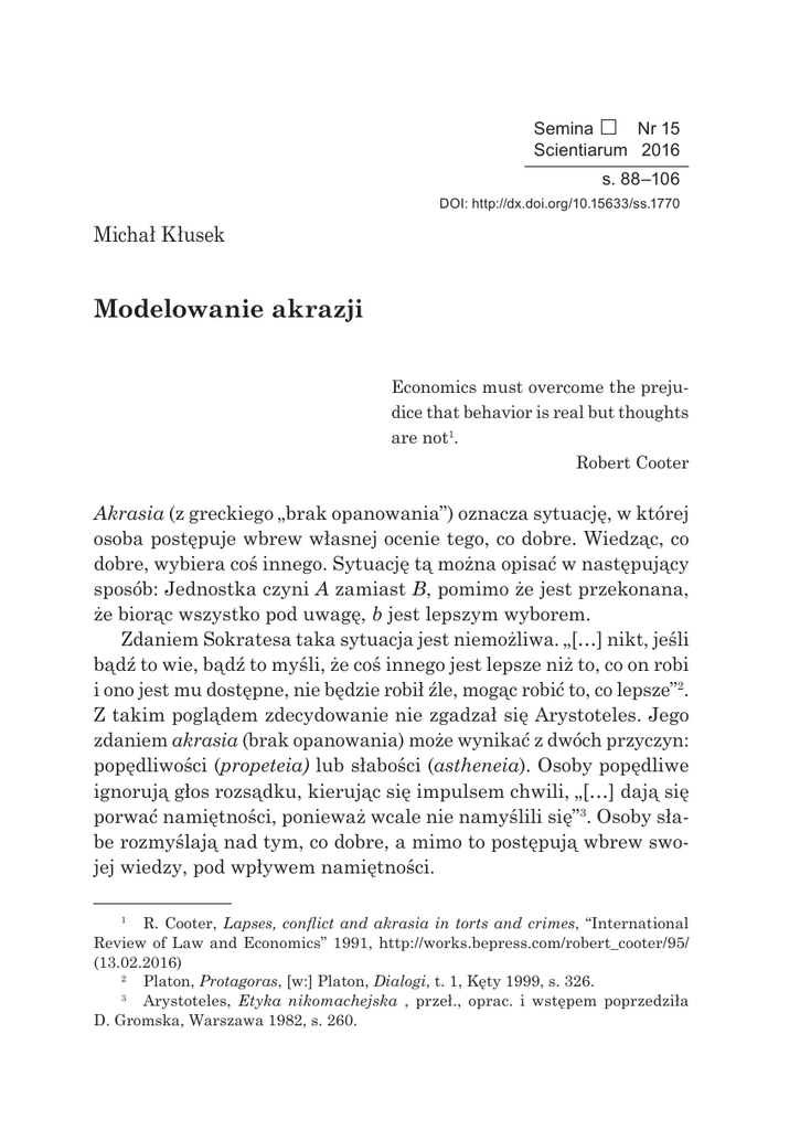 Semina Nr 15 Scientiarum 2016 s. 88–106 DOI: http://dx.doi.org/10.15633/ss.1770 Michał Kłusek Modelowanie akrazji Economics must overcome the prejudice that behavior is real but thoughts are not1. Robert Cooter Akrasia (z greckiego „brak opanowania”) oznacza sytuację, w której osoba postępuje wbrew własnej ocenie tego, co dobre. Wiedząc, co dobre, wybiera coś innego. Sytuację tą można opisać w następujący sposób: Jednostka czyni A zamiast B, pomimo że jest przekonana, że biorąc wszystko pod uwagę, b jest lepszym wyborem. Zdaniem Sokratesa taka sytuacja jest niemożliwa. „[…] nikt, jeśli bądź to wie, bądź to myśli, że coś innego jest lepsze niż to, co on robi i ono jest mu dostępne, nie będzie robił źle, mogąc robić to, co lepsze”2. Z takim poglądem zdecydowanie nie zgadzał się Arystoteles. Jego zdaniem akrasia (brak opanowania) może wynikać z dwóch przyczyn: popędliwości (propeteia) lub słabości (astheneia). Osoby popędliwe ignorują głos rozsądku, kierując się impulsem chwili, „[…] dają się porwać namiętności, ponieważ wcale nie namyślili się”3. Osoby słabe rozmyślają nad tym, co dobre, a mimo to postępują wbrew swojej wiedzy, pod wpływem namiętności. 1 R. Cooter, Lapses, conflict and akrasia in torts and crimes, “International Review of Law and Economics” 1991, http://works.bepress.com/robert_cooter/95/ (13.02.2016) 2 Platon, Protagoras, [w:] Platon, Dialogi, t. 1, Kęty 1999, s. 326. 3 Arystoteles, Etyka nikomachejska , przeł., oprac. i wstępem poprzedziła D. Gromska, Warszawa 1982, s. 260. Modelowanie akrazji 89 Klasyczny ekonomiczny model decyzji jest znacznie bliższy myśli Sokratesa. Homo oeconomicus ma określone, spójne i przechodnie preferencje, które pozwalają mu wybierać te działania, które w największym stopniu zaspokoją jego potrzeby. Wie, czego chce, i właśnie to wybiera. W tym modelu nie ma miejsca na postępowanie „wbrew” swoim preferencjom. Wewnętrzne konflikty, wahania i żal związany z określonym wyborem pozostają na ogół poza zainteresowaniem (i możliwościami) analizy ekonomicznej. Model akrazji Roberta Cootera jest bardzo interesującą próbą wypełnienia tej pustki. Rozszerza obszar zainteresowania ekonomii z zewnętrznych działań (będących emanacją preferencji) na proces decyzyjny prowadzący do tych działań. Celem pracy jest opisanie modelu, a następnie zastawienie go z antycznymi i współczesnymi filozoficznymi koncepcjami akrazji, a także analiza tego, w jakiej mierze daje się on z nimi połączyć. Zacznę od przedstawienia podstaw teorii racjonalnego wyboru i teorii użyteczności, następnie przedstawię trzy wariacje modelu błędów (lapses), tj. działań pod wpływem chwilowego impulsu znacznie odbiegającego od typowych preferencji jednostki. Następnie opisany zostanie model oczekiwanego żalu (regret) związanego z określoną decyzją, a także to, jak model Roberta Cootera da się połączyć ze współczesnymi filozoficznymi koncepcjami akrazji. Tego typu połączenie pozwala przedstawić pełniejszy obraz wspomnianego zjawiska. Filozoficzne interpretacje w oderwaniu od ekonomicznego modelu nie mogą być bezpośrednio zastosowane w analizie ekonomicznej; jednocześnie sam model akrazji, pozbawiony filozoficznej podbudowy, nie w pełni opisuje naturę tego zjawiska, zostawiając wiele pytań bez odpowiedzi. 1. Teoria wyboru konsumenta Dla zrozumienia modelowania akrazji przez Roberta Cootera konieczne jest przypomnienie podstaw teorii wyboru konsumenta. Podstawowe pojęcie w tej teorii to pojęcie użyteczności – tj. miary satysfakcji, jaką jednostka czerpie z konsumpcji określonych dóbr 90 Michał Kłusek i usług. Nie należy rozumieć jej jako psychologicznej wielkości dającej się mierzyć. Jest to teoretyczny konstrukt, pozwalający na wyrażenie preferencji jednostki wybierającej spośród zestawu dóbr. Teoria wyboru konsumenta opiera się na założeniu, że jednostka maksymalizuje swoją funkcję użyteczności. Wybierając z zestawu dóbr (usług), wybiera te, z którym wiąże się największa użyteczność (satysfakcja). Użyteczność jest „tym, co reprezentuje preferencje”4. Jeśli jednostka preferuje dobro ponad dobro, możemy powiedzieć, że z dobrem związana jest większa użyteczność niż z dobrem. Przyporządkowując różnym koszykom dóbr wartość użyteczności, którą jednostka z nimi wiąże, możemy stworzyć funkcję użyteczności danej jednostki. Rzecz jasna, maksymalizując swoją funkcję użyteczności, jest ona ograniczona przez „warunki zewnętrzne”, np. ograniczoną dostępność dóbr. Krzywa obojętności łączy kombinacje dóbr, którym jednostka przypisuje równą miarę użyteczności. Z preferencjami jednostki wiąże się kilka dodatkowych założeń. Po pierwsze, są one zupełne, tj. w każdym przypadku wyboru pomiędzy A i B jednostka potrafi określić, które z nich preferuje (lub czy jest to dla niej obojętne). Po drugie, są one przechodnie, co oznacza, że w sytuacji, gdy jednostka preferuje A względem B i B względem C, to nie może być tak, że preferuje C ponad A. Tak rozumianą teorię wyboru konsumenta możemy rozszerzyć (jak czyni to Cooter) z dóbr i usług na wszystkie „stany świata” lub działania. Dla każdego działania (dobra) stanu świata jednostka jest w stanie przyporządkować określoną miarę użyteczności. Te miary użyteczności pozwalają następnie uszeregować te dobra według preferencji. 2. Model błędów – konsumpcja i inwestycje Przechodząc do opisu modelu akrazji, należy zacząć od prostego modelu decyzji. Jednostka postawiona jest przed wyborem: może 4 J. Broome, Ethics out of economics, Cambridge 1999, s. 28. 91 Modelowanie akrazji wybrać konsumpcję o wartości 1 lub zainwestować te same środki i w efekcie uzyskać korzyść równą b. 1 konsumpcja inwestycja b Rys. 1. Źródło: R. Cooter, Justice a