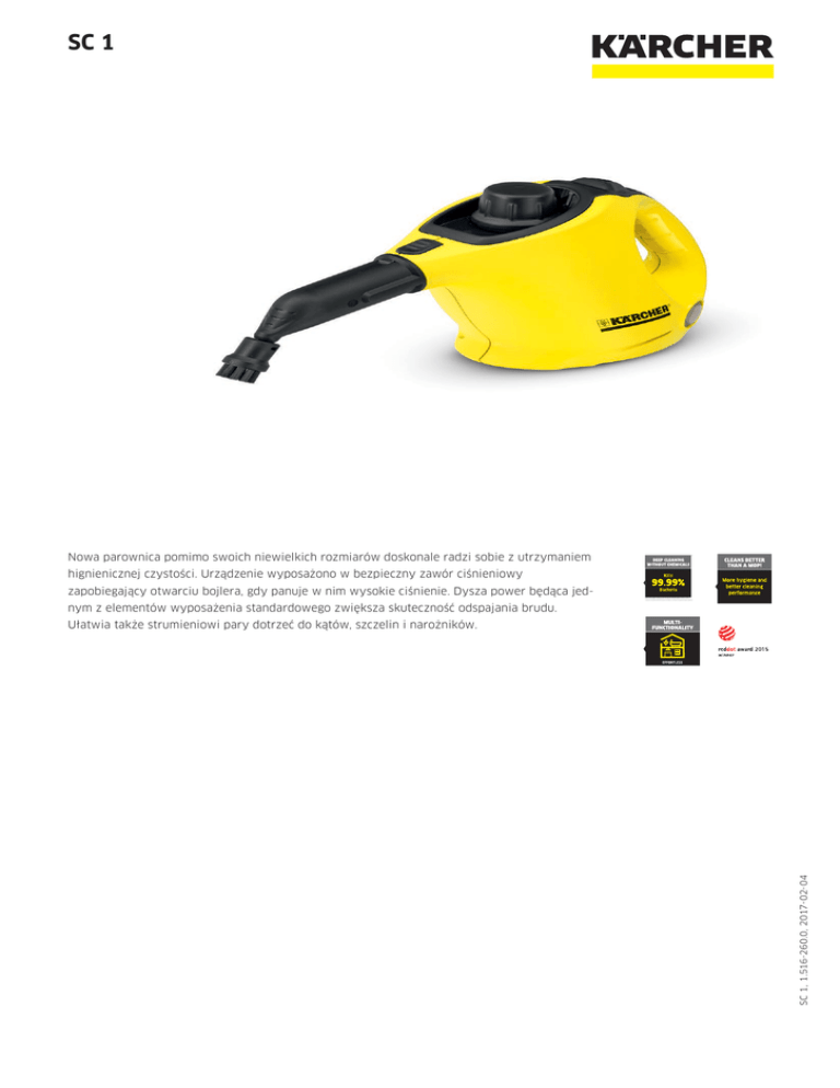SC 1 Nowa parownica pomimo swoich niewielkich rozmiarów doskonale radzi sobie z utrzymaniem * hignienicznej czystości. Urządzenie wyposażono w bezpieczny zawór ciśnieniowy zapobiegający otwarciu bojlera, gdy panuje w nim wysokie ciśnienie. Dysza power będąca jed* When thoroughly cleaning with the Kärcher Steam Cleaner 99.99 % of all common household bacteria will be killed on common household hard surfaces. nym z elementów wyposażenia standardowego zwiększa skuteczność odspajania brudu. SC 1, 1.516-260.0, 2017-02-04 Ułatwia także strumieniowi pary dotrzeć do kątów, szczelin i narożników. SC 1 Zajmuje mało miejsca dzięki kompaktowym wymiarom Gotowa do pracy w każdej chwili Dane techniczne 1.516-260.0 Numer katalogowy Wydajność powierzchniowa m² 20 Czas podgrzewania min. 3 Pojemność kotła / zbiornika wyrównawczego Maks. ciśnienie pary l 0,2 + - / - bar 3 Moc grzałki W 1200 Przewód zasilający m 4 Ciężar bez wyposażenia kg 1,6 Wymiary (dł. x szer. x wys.) mm 321 × 127 × 186 Wyposażenie standardowe Bezpieczna blokada / Zawór bezpieczeństwa Wbudowany lejek do napełniania Wyposażenie Dysza ręczna, dysza do detali, dysza power, okrągła szczotka Torba na akcesoria do SC 1 Ściereczka frotte do dyszy ręcznej Objęte dostawą. szt. 1 SC 1, 1.516-260.0, 2017-02-04 4054278027302 Akcesoria dla SC 1 1.516-260.0 1 2 3 4 5 6 7 8 10 11 12 13 14 15 Numer katalogowy Cena Opis Dysze Dysza ręczna 1 2.884-280.0 Ssawka podłogowa Comfort Mini 2 2.863-244.0 Zestaw do czyszczenia podłóg "Comfort Plus" Zestaw do czyszczenia podłóg "Classic" do SC 1 Dysza do czyszczenia okien 3 2.863-019.0 Dysza power 6 2.884-282.0 Dysza do pielęgnacji tekstyliów 7 4.130-390.0 Dysza do pielęgnacji tekstyliów für SC Gumowa listwa do dyszy do okien 8 2.863-233.0 Dysza ręczna ze szczeciną do czyszczenia niewielkich powierzchni np. kabiny prysznicowe, płytki ścienne itp. Przez- naczona do pracy z lub bez powłoczki z mikrofibry. W zestawie dysza podłogowa Comfort Plus i ściereczka do dyszy podłogowej wykonana z mikrofibry. 4 2.885-411.0 5 2.863-025.0 9 6.273-140.0 Dysza do okien dokładnie czyści szkło, okna oraz lustra przy użyciu parownicy. Dysza Power z przedłużką znacznie zwiększa siłę czyszczenia dyszy do detali. Doskonała do łatwego, ekologicznego czyszczenia trudnodostępnych miejsc np. rogów. Dysza do pielęgnacji tekstyliów odświeża i usuwa zagięcia ubrań i tekstyliów, efektywnie usuwając nieprzyjemne zapachy. Posiada warstwę usuwającą meszek. Gumowa listwa do dyszy do okien dla parownic. Zestawy ściereczek NOCH NICHT GEPFLEGT ---------------- > Zestaw ścierek z mikrofibry do łazienki Zestaw ścierek z mikrofibry do kuchni Zestaw ścierek z mikrofibry do podłogi Zestaw powłoczek z mikrofibry 10 2.863-243.0 11 2.863-171.0 12 2.863-172.0 13 2.863-173.0 14 2.863-174.0 Zestaw ściereczek frotte 15 6.960-019.0 Ściereczki podłogowe frotte, wąskie Ściereczki frotte 5 sztuk 16 6.369-357.0 Powłoczki frotte 5 sztuk 18 6.370-990.0 17 6.369-481.0 Zestaw ściereczek zawiera cztery różne rodzaje ściereczek z mikrofibry do czyszczenia łazienki. Zestaw ściereczek zawiera cztery różne rodzaje ściereczek z mikrofibry do czyszczenia kuchni. Dwie miękkie welurowe ściereczki podłogowe do łatwego usuwania zabrudzeń. Zapewniają doskonale czystą podłogę. Zestaw składa się z dwóch miękkich powłoczek z mikrofibry na dyszę ręczną przeznaczonych do czyszczenia silnie zabrudzonych powierzchni w kuchni i w łazience. Zestaw pięciu ściereczek (2 podłogowych i 3 powłoczek na dyszę ręczną) z wysokiej jakości bawełny. Zestaw pięciu wysoce chłonnych, wąskich ściereczek podłogowych z wysokiej jakości bawełny. Zestaw pięciu wysoce chłonnych ściereczek podłogowych z wysokiej jakości bawełny. Zestaw pięciu wysoce chłonnych powłoczek na dyszę ręczną z wysokiej jakości bawełny. Praktyczny zestaw okrągłych szczotek dostępny w dwóch kolorach Zestaw szczotek okrągłych z mosiężną szczeciną do usuwania uporczywych, zaschniętych zabrudzeń. Doskonałe do niewrażliwych powierzchni. Dzięki dużej, okrągłej szczotce wyczyścisz większą powierzchnię w krótszym czasie. Szczotka okrągła z dwoma rzędami odpornej na wysokie temperatury szczeciny oraz skrobakiem do łatwego usuwania uporczywych zabrudzeń. Nie nadaje się do czyszczenia powierzchni wrażliwych. Zestaw okrągłych szczotek 19 2.863-058.0 Zestaw szczotek z mosiężną szczeciną 20 2.863-061.0 Okrągła szczotka – duża 21 2.863-022.0 Szczotka okrągła ze skrobakiem 22 2.863-140.0 Objęte dostawą. Dostępne akcesoria. SC 1, 1.516-260.0, 2017-02-04 Zestawy szczotek Akcesoria dla SC 1 1.516-260.0 23 24 25 Numer katalogowy 26 Cena Opis 23 2.863-159.0 Parowa szczotka Turbo ogranicza czas czyszczenia o połowę. Dzięki jej silnemu działaniu nie ma potrzeby szoro- wania. Umożliwia oszczędność czasu. Dysza do usuwania tapet 24 2.863-062.0 Zestaw uniwersalnych akcesoriów 25 2.863-215.0 Wąż parowy do SC 1 26 2.863-021.0 Zdzieracz do tapet doskonale usuwa tapety oraz pozostałości kleju wykorzystując działanie pary. Zestaw akcesoriów do parownic. W skład zestawu wchodzą: trzy bawełniane ściereczki podłogowe, trzy bawełniane powłoczki na dyszę ręczną, dwie czerwone i dwie czarne okrągłe szczotki. Po założenia węża parowego będziesz w stanie wyczyścić parownicą SC 1 nawet trudno dostępne miejsca. Parowa szczotka Turbo Inne akcesoria SC 1, 1.516-260.0, 2017-02-04 Objęte dostawą. Dostępne akcesoria.
