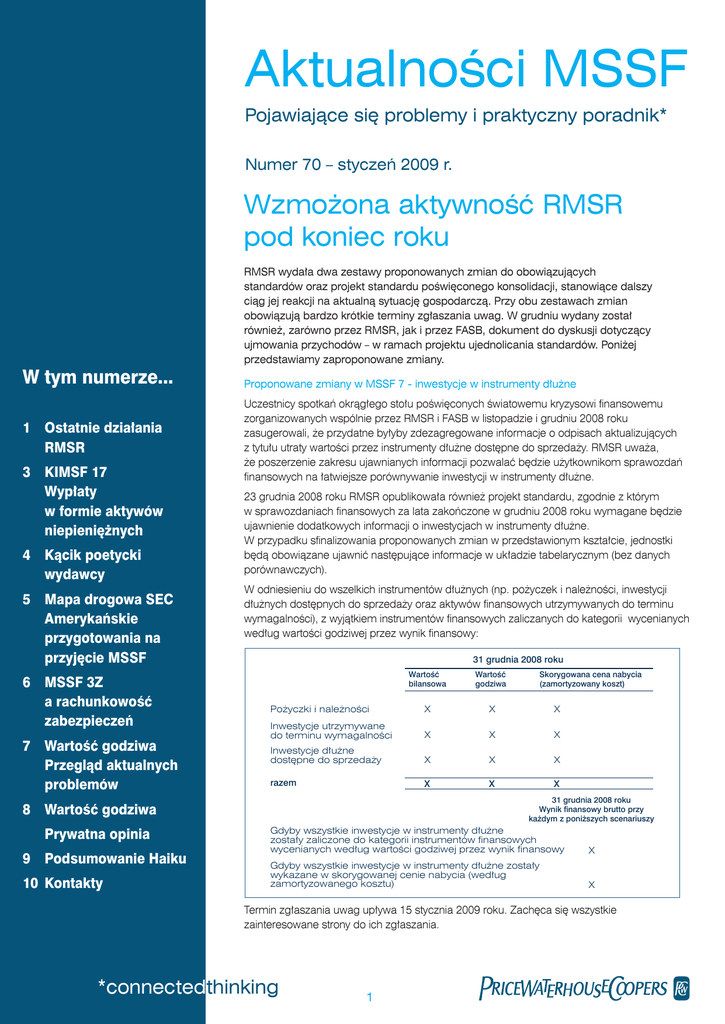 Aktualności MSSF Pojawiające się problemy i praktyczny poradnik* Numer 70 – styczeń 2009 r. Wzmożona aktywność RMSR pod koniec roku W tym numerze... 1 Ostatnie działania RMSR 3 KIMSF 17 Wypłaty w formie aktywów niepieniężnych 4 Kącik poetycki wydawcy 5 Mapa drogowa SEC Amerykańskie przygotowania na przyjęcie MSSF 6 MSSF 3Z a rachunkowość zabezpieczeń 7 Wartość godziwa Przegląd aktualnych problemów RMSR wydała dwa zestawy proponowanych zmian do obowiązujących standardów oraz projekt standardu poświęconego konsolidacji, stanowiące dalszy ciąg jej reakcji na aktualną sytuację gospodarczą. Przy obu zestawach zmian obowiązują bardzo krótkie terminy zgłaszania uwag. W grudniu wydany został również, zarówno przez RMSR, jak i przez FASB, dokument do dyskusji dotyczący ujmowania przychodów – w ramach projektu ujednolicania standardów. Poniżej przedstawiamy zaproponowane zmiany. Proponowane zmiany w MSSF 7 - inwestycje w instrumenty dłużne Uczestnicy spotkań okrągłego stołu poświęconych światowemu kryzysowi finansowemu zorganizowanych wspólnie przez RMSR i FASB w listopadzie i grudniu 2008 roku zasugerowali, że przydatne byłyby zdezagregowane informacje o odpisach aktualizujących z tytułu utraty wartości przez instrumenty dłużne dostępne do sprzedaży. RMSR uważa, że poszerzenie zakresu ujawnianych informacji pozwalać będzie użytkownikom sprawozdań finansowych na łatwiejsze porównywanie inwestycji w instrumenty dłużne. 23 grudnia 2008 roku RMSR opublikowała również projekt standardu, zgodnie z którym w sprawozdaniach finansowych za lata zakończone w grudniu 2008 roku wymagane będzie ujawnienie dodatkowych informacji o inwestycjach w instrumenty dłużne. W przypadku sfinalizowania proponowanych zmian w przedstawionym kształcie, jednostki będą obowiązane ujawnić następujące informacje w układzie tabelarycznym (bez danych porównawczych). W odniesieniu do wszelkich instrumentów dłużnych (np. pożyczek i należności, inwestycji dłużnych dostępnych do sprzedaży oraz aktywów finansowych utrzymywanych do terminu wymagalności), z wyjątkiem instrumentów finansowych zaliczanych do kategorii wycenianych według wartości godziwej przez wynik finansowy: 31 grudnia 2008 roku Wartość bilansowa Wartość godziwa Pożyczki i należności X X X Inwestycje utrzymywane do terminu wymagalności X X X Inwestycje dłużne dostępne do sprzedaży X X X razem X X X 31 grudnia 2008 roku Wynik finansowy brutto przy każdym z poniższych scenariuszy 8 Wartość godziwa Prywatna opinia 9 Podsumowanie Haiku 10 Kontakty Skorygowana cena nabycia (zamortyzowany koszt) Gdyby wszystkie inwestycje w instrumenty dłużne zostały zaliczone do kategorii instrumentów finansowych wycenianych według wartości godziwej przez wynik finansowy X Gdyby wszystkie inwestycje w instrumenty dłużne zostały wykazane w skorygowanej cenie nabycia (według zamortyzowanego kosztu) X Termin zgłaszania uwag upływa 15 stycznia 2009 roku. Zachęca się wszystkie zainteresowane strony do ich zgłaszania. *connectedthinking 1 Numer 70 – styczeń 2009 r. Proponowane zmiany w KIMSF 9 i MSR 39 – wbudowane instrumenty pochodne Propozycje stanowią część prowadzonego przez Radę kompleksowego przeglądu działalności pozabilansowej i jej odpowiedź na rekomendacje Forum Stabilności Finansowej, międzynarodowego ciała zajmującego się koordynacją reakcji organów nadzoru na całym świecie na kryzys kredytowy. Dalsze propozycje obejmujące wyłączanie aktywów i zobowiązań z ksiąg rachunkowych mają zostać opublikowane w pierwszym kwartale 2009 roku. 22 grudnia 2008 roku RMSR opublikowała projekt standardu wprowadzający do KIMSF 9 i MSR 39 zmiany dotyczące wbudowanych instrumentów pochodnych. Projekt proponuje obowiązkową ocenę wbudowanych instrumentów pochodnych po reklasyfikacji składnika aktywów finansowych z kategorii instrumentów finansowych wycenianych według wartości godziwej przez wynik finansowy. Oceny takiej nie dokonano przy początkowym ujęciu, ponieważ cały składnik aktywów został wówczas wykazany w wartości godziwej. Termin zgłaszania uwag upływa 20 marca 2009 roku. Dokument do dyskusji dotyczący przychodów RMSR wydała dokument do dyskusji proponujący zmiany w wytycznych dotyczących ujmowania przychodów. Dokument do dyskusji (wydany również przez FASB) doprowadzi do wydania nowego, ujednoliconego i kompleksowego MSSF, który zastąpi obecnie obowiązujące standardy MSR 18 „Przychody” i MSR 11 „Umowy o usługę budowlaną”. Celem wspólnie realizowanego projektu jest wypracowanie jednolitego modelu ujmowania przychodów, który można będzie stosować w taki sam sposób, niezależnie od branży. Rada wyjaśniła, że zmiana jest konieczna, aby zapewnić, że po reklasyfikacji z kategorii instrumentów finansowych wycenianych według wartości godziwej, jednostki stosują wymogi dotyczące odłączania wbudowanego instrumentu pochodnego, który nie jest ściśle powiązany z umową zasadniczą. Oceny należy dokonać na podstawie okoliczności, które występowały, gdy jednostka stała się stroną umowy. Ponadto, jeżeli wartości godziwej instrumentu pochodnego, który należałoby odłączyć, nie można wiarygodnie wycenić, Rada zaproponowała, aby w takim przypadku hybrydowy (łączony) składnik aktywów finansowych pozostawał w całości w kategorii instrumentów finansowych wycenianych według wartości godziwej przez wynik finansowy. Stosowanie nadrzędnej zasady zaproponowanej przez RMSR i FASB powodowałoby ujmowanie przychodów przez jednostkę w momencie wywiązania się przez nią z obowiązku świadczenia poprzez przekazanie towarów i usług do klienta zgodnie z umową. Zasada ta jest zbliżona do wielu obecnie istniejących wymogów i Rady oczekują, że ich propozycje wpłyną na podejście do niewielu transakcji. Oczekują jednak, że wyjaśnienie tej zasady ora