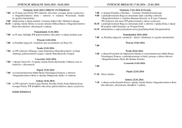 INTENCJE MSZALNE 10.01.2016 –16.01.2016 Niedziela 10.01.2016 CHRZTU PAŃSKIEGO 7.00 za V męża ojca Piotra VV rodziców obu stron, szwagra, dusze czyśćcowe, o błogosławieństwo Boże i zdrowie w rodzinie Wiercimok, Satuła (w języku niemieckim) 9.00 dziękczynna z okazji urodzin i rocznicy ślubu Lidii i Huberta Labusga 10.30 o opiekę Anioła Stróża za roczne dziecko Milena Baron o błogosławieństwo Boże dla rodziców, chrzestnych i rodziny Poniedziałek 11.01.2016 7.00 za V żonę Adelajdę VV pokrewieństwo obu stron i z okazji urodzin syna INTENCJE MSZALNE 17.01.2016 – 23.01.2016 Niedziela 17.01.2016 II Zwykła 7.00 w intencji Parafian z Mechnic – Turzoka i Osiedla Kwiatowego 9.00 z podziękowaniem Bogu za otrzymane łaski z prośbą o zdrowie i błogosławieństwo w rodzinie Bauman Kluczny za V syna Tomasza VV rodziców obu stron VV pokrewieństwo, dusze czyśćcowe 10.30 z podziękowaniem Bogu za otrzymane łaski o zdrowie i opiekę Bożą z okazji 80 urodzin Adeli Knosala i za V męża Pawła 14.30 nabożeństwo z zaprzysiężeniem nowej parafialnej Rady Duszpasterskiej Poniedziałek 18.01.2016 7.00 za Parafian żyjących i zmarłych – dzieci i młodzieży (w języku niemieckim) Wtorek 12.01.2016 7.00 za Parafian żyjących i zmarłych oraz uczestników tej Mszy Św. Wtorek 19.01.2016 7.00 Środa 13.01.2016 7.00 za VV rodziców Hilarego, Annę Stanisława Marcinkowskich i za brata Andrzeja, pokrewieństwo żyjące i zmarłe Marcinkowski, Nicpoń Czwartek 14.01.2016 7.00 z okazji Chrztu Św. O opiekę Anioła Stróża dla dziecka Tobiasza oraz za rodziców i chrzestnych Piątek 15.01.2016 7.00 za wstawiennictwem Matki Bożej Nieustającej Pomocy o zdrowie i błogosławieństwo Boże w intencji Małgorzaty Sadło i w rodzinie Sobota 16.01.2016 7.30 za VV rodziców Józefa Łucję Hosala, Rozalię Józefa, brata Huberta Kutz, szwagra Pawła, VV dziadków obu stron, pokrewieństwo, dusze czyśćcowe kolęda dodatkowa Środa 20.01.2016 7.00 z okazji 60 urodzin do Opatrzności Bożej za wstawiennictwem Matki Bożej Nieustającej Pomocy z podziękowaniem za łaski, prosząc o dalsze zdrowie i błogosławieństwo Boże dla Stefana Żelosko Czwartek 21.01.2016 7.00 Piątek 22.01.2016 17.30 Msza szkolna Sobota 23.01.2016 7.30 z okazji roczku Kamila Klosa o opiekę Anioła Stróża i błogosławieństwo Boże dla rodziców, chrzestnych, dziadków i rodziny INTENCJE MSZALNE 24.01.2016 – 31.01.2016 Niedziela 24.01.2016 III zwykła 7.00 za dusze w czyśćcu cierpiące 9.00 za VV rodziców Rozalię Pawła Wolny, Józefa Gertrudę Baron, VV Anastazję Jana Machula, VV pokrewieństwo Baron Wolny Świerc, dusze czyśćcowe 10.30 kolędowa w intencji Parafian z Chróściny i Osiedla Chróścina Poniedziałek 25.01.2016 17.30 za V babcię Teresę Kukielka VV z rodziny Kukielka Wiench i o zdrowie i błogosławieństwo Boże w rodzinach Wtorek 26.01.2016 7.00 Środa 27.01.2016 7.00 Czwartek 28.01.2016 7.00 w 30 dzień V Erwina Czernia Piątek 29.01.2016 7.00 za V męża, rodziców obu stron, pokrewieństwo, V bratanka, d.cz. Sobota 30.01.2016 7.30 za V męża Horsta, rodziców obu stron, siostrę Teresę, Marię, Martę, VV pokrewieństwo, dusze czyśćcowe i o zdrowie i błog. Boże w rodzinie 13.00 z okazji 80. urodzin Róży Jończyk o zdrowie i błog. Boże w rodzinie 8.00 10.30 Niedziela 31.01.2016 za VV rodziców obu stron, zmarłych szwagrów Jana, Joachima oraz o zdrowie i błogosławieństwo Boże w rodzinie Podsada 3 stycznia 2016 Nr 249 www.parafia.chroscina.eu Niedziela 03.01.2016 7.00 za VV rodziców Jana Edeltraudę Dusza, ojca Jerzego Strzelczyk VV pokrewieństwo oraz o zdrowie i błogosławieństwo Boże w rodzinie Strzelczyk, Toma (w języku niemieckim) 9.00 do Bożej Opatrzności na podziękowanie za odebrane łaski z prośbą o zdrowie i opiekę Bożą w rodzinach i za VV rodziców Franza Marię Niestrój, VV pokrewieństwo, dusze czyśćcowe 10.30 o opiekę Anioła Stróża za roczne dziecko Kalinę Grabińską o błogosławieństwo Boże dla rodziców, chrzestnych, dziadków i rodziny Poniedziałek 04.01.2016 7.00 za Parafian i uczestników tej Mszy Św. Wtorek 05.01.2016 7.00 ku czci Niepokalanego Serca NMPanny na wynagrodzenie za grzechy świata oraz w intencji naszych rodzin i małżeństw Środa 06.01.2016 OBJAWIENIE PAŃSKIE – TRZECH KRÓLI 7.00 do Bożej Opatrzności o błogosławieństwo Boże w Nowym Roku o zdrowie w naszych rodzinach za dzieci i wnuki z Grona Matek z Osiedla (Anna Kutz) 9.00 za VV Kurta i Hildegardę Firlus oraz za V Józefa Soboń VV z rodziny Firlus i Soboń 10.30 za VV rodziców Franciszka Magdalenę Kala, Gerharda Gertrudę Ficek, V brata, szwagierkę od rodziny Kala Gonsior (chrzest Tobiasz) Czwartek 07.01.2016 7.00 o powołania kapłańskie i zakonne z naszej parafii oraz za żyjące i zmarłe Matki nasze Bractwa-Grona Matek Piątek 08.01.2016 7.00 ku czci Najświętszego Serca Pana Jezusa na wynagrodzenie za własne grzechy oraz w intencji Bractwa Ojców żyjących i zmarłych i Bractwa Św. Józefa – nabożeństwo z Litanią Serca Jezusowego Sobota 09.01.2016 7.30 w intencji rocznego dziecka Lena Niedworok o opiekę Anioła Stróża, o błogosławieństwo Boże dla rodziców, chrzestnych i rodziny