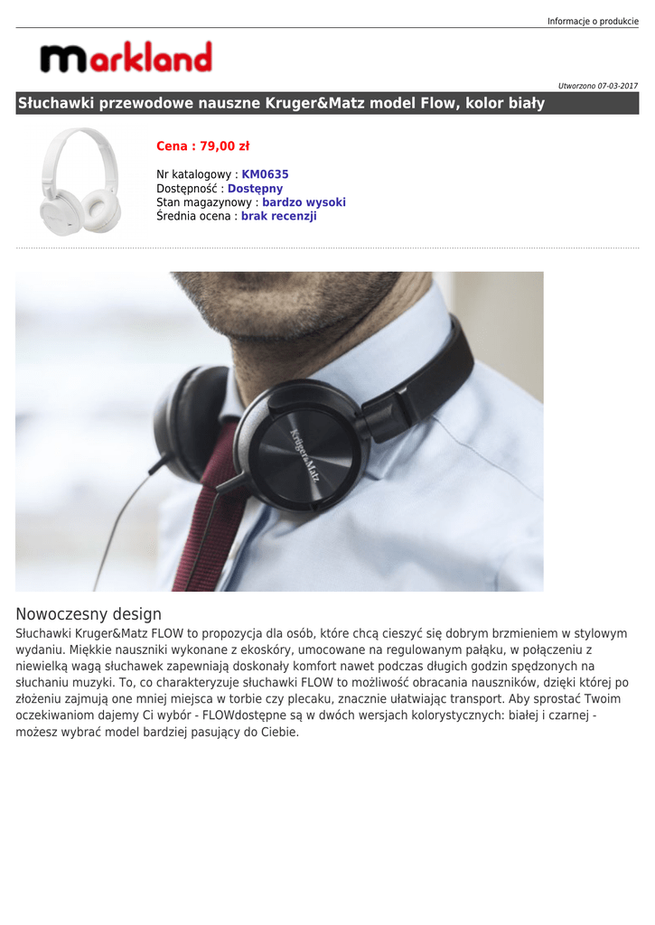 Informacje o produkcie Utworzono 07-03-2017 Słuchawki przewodowe nauszne Kruger&Matz model Flow, kolor biały Cena : 79,00 zł Nr katalogowy : KM0635 Dostępność : Dostępny Stan magazynowy : bardzo wysoki Średnia ocena : brak recenzji Nowoczesny design Słuchawki Kruger&Matz FLOW to propozycja dla osób, które chcą cieszyć się dobrym brzmieniem w stylowym wydaniu. Miękkie nauszniki wykonane z ekoskóry, umocowane na regulowanym pałąku, w połączeniu z niewielką wagą słuchawek zapewniają doskonały komfort nawet podczas długich godzin spędzonych na słuchaniu muzyki. To, co charakteryzuje słuchawki FLOW to możliwość obracania nauszników, dzięki której po złożeniu zajmują one mniej miejsca w torbie czy plecaku, znacznie ułatwiając transport. Aby sprostać Twoim oczekiwaniom dajemy Ci wybór - FLOWdostępne są w dwóch wersjach kolorystycznych: białej i czarnej możesz wybrać model bardziej pasujący do Ciebie. Doskonały dźwięk Dobre brzmienie w słuchawkach FLOW wydobywa się z 40 mm głośników dynamicznych. Oferowane dźwięki charakteryzuje zrównoważone, naturalne i czyste brzmienie. Dzięki FLOW możesz cieszyć się muzyką gdziekolwiek jesteś. Nie ważne czy idziesz ulicą, czy słuchasz swojej playlisty w domu, słuchawki zostały zaprojektowane tak, by niwelować hałas z otoczenia pozostawiając Cię w świecie Twoich ulubionych utworów. Informacje o produkcie Rodzaj: Nauszne Technologia: Przewodowe Mikrofon: Nie Materiał: Plastik Kolor: Biały Rozmiar głośnika: 40 mm Napęd: Głośnik dynamiczny Pasmo przenoszenia: 20 ~ 20 000 Hz Impedancja: 32 Ohm Czułość: 110 dB 2 dB Nominalna moc wejściowa: 10 mW Maksymalna moc wejściowa: 20 mW Kabel: 120 cm Wtyk: 3,5 mm Wymiary: 15 x 17,5 x 3,5 cm (z opakowaniem: 18 x 20,5 x 7,5 cm) Waga: 0,17 kg (z opakowaniem: 0,24 kg)