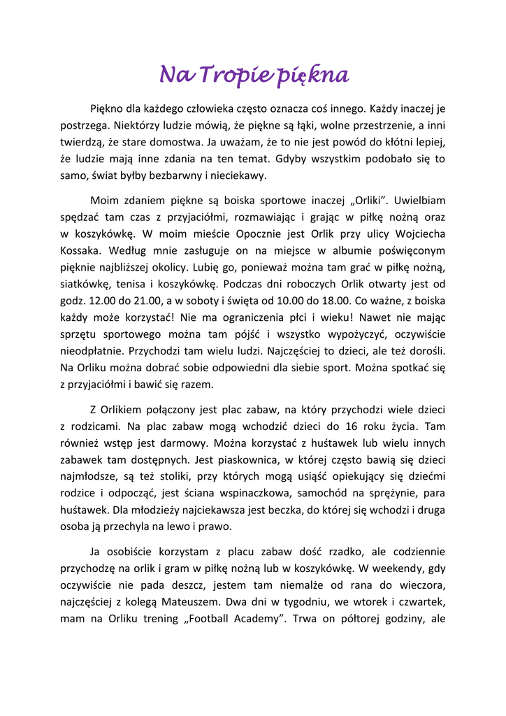 Na Tropie piękna Piękno dla każdego człowieka często oznacza coś innego. Każdy inaczej je postrzega. Niektórzy ludzie mówią, że piękne są łąki, wolne przestrzenie, a inni twierdzą, że stare domostwa. Ja uważam, że to nie jest powód do kłótni lepiej, że ludzie mają inne zdania na ten temat. Gdyby wszystkim podobało się to samo, świat byłby bezbarwny i nieciekawy. Moim zdaniem piękne są boiska sportowe inaczej „Orliki”. Uwielbiam spędzad tam czas z przyjaciółmi, rozmawiając i grając w piłkę nożną oraz w koszykówkę. W moim mieście Opocznie jest Orlik przy ulicy Wojciecha Kossaka. Według mnie zasługuje on na miejsce w albumie poświęconym pięknie najbliższej okolicy. Lubię go, ponieważ można tam grad w piłkę nożną, siatkówkę, tenisa i koszykówkę. Podczas dni roboczych Orlik otwarty jest od godz. 12.00 do 21.00, a w soboty i święta od 10.00 do 18.00. Co ważne, z boiska każdy może korzystad! Nie ma ograniczenia płci i wieku! Nawet nie mając sprzętu sportowego można tam pójśd i wszystko wypożyczyd, oczywiście nieodpłatnie. Przychodzi tam wielu ludzi. Najczęściej to dzieci, ale też dorośli. Na Orliku można dobrad sobie odpowiedni dla siebie sport. Można spotkad się z przyjaciółmi i bawid się razem. Z Orlikiem połączony jest plac zabaw, na który przychodzi wiele dzieci z rodzicami. Na plac zabaw mogą wchodzid dzieci do 16 roku życia. Tam również wstęp jest darmowy. Można korzystad z huśtawek lub wielu innych zabawek tam dostępnych. Jest piaskownica, w której często bawią się dzieci najmłodsze, są też stoliki, przy których mogą usiąśd opiekujący się dziedmi rodzice i odpocząd, jest ściana wspinaczkowa, samochód na sprężynie, para huśtawek. Dla młodzieży najciekawsza jest beczka, do której się wchodzi i druga osoba ją przechyla na lewo i prawo. Ja osobiście korzystam z placu zabaw dośd rzadko, ale codziennie przychodzę na orlik i gram w piłkę nożną lub w koszykówkę. W weekendy, gdy oczywiście nie pada deszcz, jestem tam niemalże od rana do wieczora, najczęściej z kolegą Mateuszem. Dwa dni w tygodniu, we wtorek i czwartek, mam na Orliku trening „Football Academy”. Trwa on półtorej godziny, ale czasem jest przedłużony. Na boisku świetnie się bawię podczas treningu i gry z przyjaciółmi. Mam nadzieję, że dzięki tej pracy ludzie będą częściej przychodzid na Orlik i uprawiad sport, docenią to miejsce i zobaczą w nim to piękno, które ja w nim zobaczyłem. Chciałbym, żeby przebywanie na świeżym powietrzu stało się bardzo istotnym elementem życia każdego człowieka. Uprawianie sportu jest według mnie bardzo ważne, ponieważ ruch poprawia sprawnośd fizyczną, samopoczucie, przemianę materii. A to wszystko powoduje, że też stajemy się piękni w oczach innych. Czy nie mam racji pisząc, że opoczyoski Orlik jest pięknym miejscem?! Dziękuję za przeczytanie mojej pracy. Pracę napisał Jakub Robak kl. V „c”.