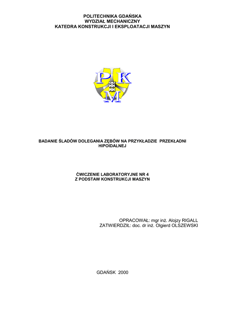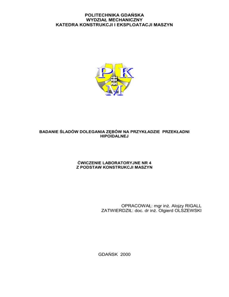 POLITECHNIKA GDAŃSKA WYDZIAŁ MECHANICZNY KATEDRA KONSTRUKCJI I EKSPLOATACJI MASZYN BADANIE ŚLADÓW DOLEGANIA ZĘBÓW NA PRZYKŁADZIE PRZEKŁADNI HIPOIDALNEJ ĆWICZENIE LABORATORYJNE NR 4 Z PODSTAW KONSTRUKCJI MASZYN OPRACOWAŁ: mgr inż. Alojzy RIGALL ZATWIERDZIŁ: doc. dr inż. Olgierd OLSZEWSKI GDAŃSK 2000 -21. CEL ĆWICZENIA Celem ćwiczenia jest : zapoznanie się studentów z budową wybranej przekładni hipoidalnej (przekładnia główna samochodu FIAT 125 p) , ocena prawidłowej współpracy kół stożkowych na podstawie badania śladów dolegania zębów - poznanie sposobów prawidłowego ustawienia kół , poznanie sposobów napinania wzdłużnego łożysk tocznych skośnych utrwalenie zasad obliczania trwałości i nośności w/w łożysk 2. ZAKRES ĆWICZENIA zapoznanie się z instrukcją do ćwiczenia , badanie śladów dolegania zębów dla różnych ustawień koła dużego (założono prawidłowe ustawienie zębnika) uzyskanie poprawnego (najkorzystniejszego) śladu dolegania , obliczenie trwałości łożysk stożkowych podpierających wałek napędzający przy zadanej wartości obciążenia . 3. WPROWADZENIE DO ĆWICZENIA 3.1. WSTĘP Wśród przekładni stożkowych dość często spotyka się przekładnie hipoidalne, które służą do przenoszenia ruchu obrotowego z jednego wału na drugi przy krzyżujących się względem siebie osiach. W porównaniu ze zwykłymi stożkowymi przekładnie te umożliwiają przenoszenie większych mocy, nadają się do pracy przy większych prędkościach obrotowych. Ważną zaletą tych przekładni jest przede wszystkim to, że koła współpracujące mogą być obustronnie ułożyskowane (przy osiach przecinających się niemożliwe jest to w przypadku zębnika). Przekładnie tego typu są szeroko stosowane w zespołach napędowych samochodów, w maszynach włókienniczych itp. Ogólnie rzecz ujmując, w celu zapewnienia poprawnej współpracy kół zębatych a co za tym idzie uzyskania jak najwyższej trwałości przekładni należy pamiętać o : 1. poprawnym opracowaniu procesu technologicznego , 2. poprawnie przeprowadzonej obróbce cieplno-chemicznej , 3. poprawnej obróbce otworów w korpusie zarówno co do wielkości jak i położenia (właściwe tolerancje: wymiaru, kształtu, położenia) -3- 4. właściwym napięciu wstępnym łożysk stożkowych 5. prawidłowo wykonanym montażu kół zębatych, zapewniającym prawidłową współpracę kół (właściwy ślad dolegania zębów zarówno co do jego położenia jak i kształtu). Po wykonaniu kół przeprowadza się pomiary parametrów kół (uzębień) oraz przekładni (zazębień). Na ogół parametry, które powinny podlegać sprawdzeniu są inne dla różnych typów kół, istnieją jednak wielkości charakterystyczne dla wszystkich kół. Do nich należą : moduł (podziałka) grubość zęba linia zęba (kąt pochylenia) zarys boku zęba szerokość uzębienia średnica wierzchołków Parametrami podlegającymi pomiarom, decydującymi o zazębieniu czyli o współpracy kół są między innymi : odległość osi luz międzyzębny kąt pochylenia linii zęba kąt między osiami przesunięcie punktu przecięcia osi od wierzchołka stożków podziałowych wichrowatość osi ślady dolegania Pomiary większości parametrów na ogół nie nastręcza większych trudności zwłaszcza dla przekładni walcowych. Natomiast w przypadku przekładni hipoidalnych napotyka się na znaczne kłopoty i w zasadzie o poprawności wykonania kół można mówić na podstawie położenia i wielkości śladów dolegania podczas współpracy z kołem współpracującym lub kołem wzorcowym . 3.1.1. OPIS SPOSOBÓW SPRAWDZANIA ŚLADÓW DOLEGANIA Sprawdzenie śladów dolegania zębów przeprowadza się w trakcie produkcji oraz w trakcie montażu. W każdym przypadku kontroli pracy przekładni sprawdzianem jej prawidłowej prac jest zarówno kształt jak i położenie śladów współpracy. -4W trakcie produkcji kół w celu zapewnienia wysokiej jakości przekładni wielokrotnie sprawdza się ślad dolegania. Wpływ na ten ślad ma nie tylko specyfikacja typu obrabiarek używanych do obróbki, ale nawet indywidualna charakterystyka konkretnego egzemplarza obrabiarki. Operacja kontroli polega na wprawieniu w ruch obrotowy pod małym obciążeniem i sprawdzeniu śladów dolegania na zębach. Dzięki odpowiedniej kontroli maszyn kontrolnych umożliwiających zmianę trzech współrzędnych ustawienia kół możliwe jest znalezienie przyczyn nieprawidłowej współpracy i ich usunięcie. W trakcie montażu przekładni zębatej ponownie przeprowadza się analizę śladów dolegania, której celem jest właściwy montaż a więc prawidłowa współpraca kół zębatych. W tym celu pokrywa się zęby jednego z kół (korzystniej koło duże - talerzowe) specjalnym tuszem ewentualnie farbą drukarską. Po przetoczeniu kół uwidocznią się w miejscach styku zębów gołe miejsca. Rozpatrując powstałe ślady zwraca się oddzielną uwagę na ślady przebiegające wzdłuż linii zęba (wzdłuż szerokości wieńca) i na ślady przebiegające wzdłuż wysokości zęba. Przez odpowiednie przesuwanie kół ku wierzchołkowi stożka lub przeciwnie można doprowadzić do mniej lub bardziej poprawnego dolegania zębów (przekładnia powinna być tak skonstruowana, aby istniała możliwość w miarę prostego przesuwania kół). Pamiętać należy, że przesunięcie te mogą odbywać się w niewielkich granicach wynoszących setne lub dziesiętne części milimetra (od prawidłowego położenia). Większe przesunięcia wywołują zakłócenia w zazębianiu się, gdyż zmieniają się podziałki obwodowe. Dąży się do takiego ustawienia kół, aby doprowadzić do zetknięcia się zarysów, których czołowe kąty przypory będą sobie odpowiadały. Badania przeprowadza się dla przekładni nieobciążonej oraz obciążonej pracującej w warunkach rzeczywistych (istnieją już tusze specjalne, które nie ulegają 
