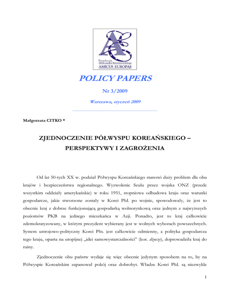 POLICY PAPERS Nr 3/2009 Warszawa, styczeń 2009 ____________________________________________ Małgorzata CITKO * ZJEDNOCZENIE PÓŁWYSPU KOREAŃSKIEGO – PERSPEKTYWY I ZAGROŻENIA Od lat 50-tych XX w. podział Półwyspu Koreańskiego stanowi duży problem dla obu krajów i bezpieczeństwa regionalnego. Wyzwolenie Seulu przez wojska ONZ (przede wszystkim oddziały amerykańskie) w roku 1951, stopniowa odbudowa kraju oraz warunki gospodarcze, jakie stworzone zostały w Korei Płd. po wojnie, spowodowały, że jest to obecnie kraj z dobrze funkcjonującą gospodarką wolnorynkową oraz jednym z najwyższych poziomów PKB na jednego mieszkańca w Azji. Ponadto, jest to kraj całkowicie zdemokratyzowany, w którym prezydent wybierany jest w wolnych wyborach powszechnych. System ustrojowo-polityczny Korei Płn. jest całkowicie odmienny, a polityka gospodarcza tego kraju, oparta na utopijnej „idei samowystarczalności” (kor. dżucze), doprowadziła kraj do ruiny. Zjednoczenie obu państw wydaje się więc obecnie jedynym sposobem na to, by na Półwyspie Koreańskim zapanował pokój oraz dobrobyt. Władze Korei Płd. są niezwykle 1 przychylne idei zjednoczenia (istnieje nawet Ministerstwo ds. Zjednoczenia). Jednocześnie w Korei Płd. istnieje duża świadomość złożoności oraz trudności procesów negocjacji i zjednoczenia. Pytaniem pozostaje, jak długo półwysep wytrzyma sztuczny podział, oraz czy odsuwanie zjednoczenia w czasie nie przyniesie w efekcie niepożądanych następstw dla obu krajów oraz całego regionu Azji. Gospodarka i sektor energetyczny Korei Płn. Reżim Kim Ir Sena, a następnie Kim Zong Ila, gospodarka centralnie planowana i nakierowana przede wszystkim na utrzymanie ok. jednomilionowej armii (przy całkowitej liczbie ludności ok. 23 miliony) spowodowały, że Korea Płn. jest bodajże jedynym krajem na świecie, który nie przeszedł „cudu gospodarczego”. Ponadto, od lat 90-tych XX w. kraj zależny jest w dużej mierze od pomocy społeczności międzynarodowej, nie będąc w stanie wyżywić swoich obywateli. W 2008 roku ONZ wydało raport o sytuacji w Korei Płn., w którym doniesiono, że milionom Koreańczyków z Północy zagraża brak żywności. Prezydent Korei Płd., Lee Myung Bak zdementował jednak te informacje, twierdząc, że zbiory sąsiadów z północy były wystarczające, by zapewnić ludności wyżywienie. Oprócz problemów z żywnością, powszechnie znaną kwestią są również trudności w sektorze energetycznym Korei Płn. Zdobycie dokładnych i wiarygodnych danych na ten temat nie jest jednak w obecnej sytuacji możliwe. Wiadomo jedynie, że władze Korei Płn. zwracały się wielokrotnie o pomoc w tej sprawie do swoich sąsiadów z południa. Przypuszcza się, że Korea Płn. posiada złoża węgla, ołowiu, wolframu, cynku, magnezytu, rudy żelaza, miedzi, złota oraz wielu innych surowców. Pomimo tego, kraj importuje surowce naturalne z Korei Płd., Chin, Rosji oraz Tajlandii z powodu zacofania technologicznego oraz braku opłacalności wydobycia surowców na własnym terenie. W latach 90-tych miał miejsce w Korei Płn. poważny spadek dostaw ropy naftowej, w wyniku czego pojawiły się problemy z transportem surowców naturalnych. Od 2000 sytuacja nieco się poprawiła dzięki pomocy innych krajów. Obecnie KRLD importuje energię elektryczną z Chin oraz Korei Płd. W 2005 roku Korea Płd. zaoferowała swoim sąsiadom w północy 2 000 MW (2 gigawaty) darmowej energii elektrycznej w zamian za porzucenie ambicji nuklearnych. Należy jednak zauważyć, że doraźna pomoc nie wystarczy, aby polepszyć ogólną sytuację kraju. Należałoby zmodernizować cały system, co wymaga zaawansowanych technologii oraz inwestycji, na które Korei Płn. nie stać. 2 Zbrojenia jądrowe oraz inne zagrożenia i problemy Korei Płn. Największym zmartwieniem społeczności międzynarodowej względem Korei Płn. wciąż pozostaje kwestia zbrojeń jądrowych. W grudniu 2002 roku Korea Płn. ujawniła, że opracowuje program nuklearny oparty na wzbogaconym uranie. Deklaracja była naruszeniem umowy pomiędzy USA a Koreą Płn. o zamrożeniu ówcześnie istniejących programów jądrowych opartych na plutonie. Ponadto, w grudniu 2002 roku z Korei Płn. usunięci zostali obserwatorzy MAEA, nadzorujący prace w ośrodku nuklearnym w Yongbyon, a miesiąc później władze KRLD ogłosiły wycofanie się z Układu o Nierozprzestrzenianiu Broni Jądrowej. W sierpniu 2003 roku w ramach tzw. „rozmów sześciostronnych” podjęto temat zbrojeń nuklearnych Korei Płn., jednak KRLD wycofała się z tych negocjacji w listopadzie 2005 roku. Rok później Phenian przeprowadził testy rakiet balistycznych (pociski były wystrzelone w kierunku Japonii) oraz eksperyment, oficjalnie określony jako „próba jądrowa”. Wskutek reakcji środowiska międzynarodowego, a w szczególności interwencji Korei Płd., Japonii, Stanów Zjednoczonych oraz ONZ, już w grudniu 2006 roku w ramach rozmów sześciostronnych podpisano dwa porozumienia o denuklearyzacji KRLD. W lutym 2007 roku Rada Bezpieczeństwa ONZ przyjęła dokument, w którym Korea Płn. zobowiązuje się zamknąć Ośrodek Badań Jądrowych w Yongbyon oraz deklaruje porzucenie swoich nuklearnych ambicji w zamian za milion ton ropy naftowej oraz ustępstwa w sferze politycznej. W lipcu 2007 roku faktycznie zamknięto ośrodek w Yongbyon, jednak cały proces odbywał się bardzo powoli. Co więcej, nie ma pewności, czy proces denuklearyzacji faktycznie postępuje, czego władze USA są świadome. Do września 2008 roku Korea Płn. znajdowała się na amerykańskiej liście krajów sponsorujących terroryzm. KRLD zagroziła, że jeśli nie zostanie z tej listy usunięta, wznowione zostaną badania oraz programy nuklearne. Po tej deklaracji pozbyto się również obserwatorów ONZ. Decyzja Stanów Zjednoczonych o osunięciu Korei Płn. z „listy terrorystów” może się w tej sytuacji wydawać ni
