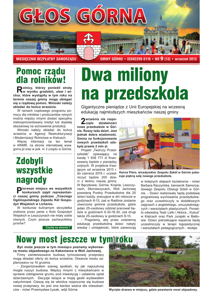 GŁOS GÓRNA MIESIĘCZNIK BEZPŁATNY SAMORZĄDU Pomoc rządu dla rolników! R olnicy, którzy ponieśli straty w wyniku gradobić, ulew i wichur, które wystąpiły w tym roku na terenie naszej gminy mogą ubiegać się o rządową pomoc. Wnioski należy składać do końca września. W ramach rządowego programu pomocy dla rolników i producentów rolnych można między innymi dostać specjalny niskooprocentowany kredyt lub dopłatę obszarową na wznowienie produkcji. Wnioski należy składać do końca września w Agencji Restrukturyzacji i Modernizacji Rolnictwa w Kielcach. Więcej informacji na ten temat w ARiMR, na stronie internetowej www. gorno.pl oraz w pok. nr 3 urzędu w Górnie. Zdobyli wszystkie nagrody P ierwsze miejsca we wszystkich konkursach zajęli reprezentanci naszej gminy podczas „Trzeciego Ogólnopolskiego Zajazdu Kół Gospodyń Wiejskich w Licheniu. W konkursie kulinarnym skrzydełka zrobione przez panie z Koło Gospodyń Wiejskich w Leszczynach nie miały sobie równych. Czym jeszcze zachwyciliśmy jurorów? Czytaj na stronie 7 GMINY GÓRNO • ISSN2299-5110 • NR 9 (13) • wrzesień 2013 Dwa miliony na przedszkola Gigantyczne pieniądze z Unii Europejskiej na wczesną edukację najmłodszych mieszkańców naszej gminy 2 września nie rozpoczęło działalności nowe przedszkole w Górnie. Ruszy lada dzień. Jest jednak dobra wiadomość. Gmina na funkcjonowanie nowych przedszkoli zdobyła prawie 2 mln zł. Projekt „Twórczy Przedszkolak” opiewający na kwotę 1 938 771 zł finansowany będzie z pieniędzy unijnych. W projekcie trwającym od września 2013 r. do czerwca 2015 r. uczest- Hanna Pióro, wicedyrektor Zespołu Szkół w Górnie pokaniczyć będzie 200 dzie- zuje piękną salę nowego przedszkola. ci z terenu naszej gminy. w kolejnych etapach kształcenia - mówi W Bęczkowie, Górnie, Krajnie, LeszczyBarbara Raczyńska, kierownik Samorząnach, Skorzeszycach, Woli Jachowej dowego Zespołu Obsługi Szkół w Górpowstaną Punkty Przedszkolne dla 25 nie. - Dzieci realizowały będą podstawę dzieci każdy, pracujące w dni robocze w programową wychowania przedszkolnegodzinach 8-13, zaś w Radlinie zostanie go oraz uczestniczyły w dodatkowych utworzone gminne przedszkole, gdzie zajęciach z angielskiego, umuzykalniająjeden 25-osobowy oddział pracował bęcych i warsztatach plastycznych. Ponaddzie w godzinach 6.30-16.30, zaś drugi to odwiedzą Teatr Lalki i Aktora „ Kubuś” także 25-osobowy w godzinach 8-13. w Kielcach oraz Park Jurajski w Bałto- Pragniemy, aby przez codzienną wie. Dzieci potrzebujące wsparcia będą edukację przedszkolną dzieci nabyły uczestniczyły w terapii logopedycznej wiedzę i umiejętność, które zaowocują i warsztatach pedagogicznych - dodaje. Nowy most jeszcze w tym roku Być może jeszcze w tym miesiącu poznamy wykonawcę mostu objazdowego na Kakoniance w Woli Jachowej. Firmy zainteresowane budową tymczasowej przeprawy mogą składać oferty do końca września. Otwarcie mostu zaplanowano na 10 grudnia. - Zorganizowałem szereg spotkań, by jak najszybciej mogła ruszyć budowa. Między innymi z mieszkańcami w sprawie odstąpienia gruntu pod inwestycję i ustalenia opłat dzierżawnych. Decyzje leżące w mojej gestii wydawałem natychmiast. Cieszę się że wkrótce rozpocznie się budowa nowej przeprawy, bo jest ona bardzo ważna dla mieszkańców - mówi Przemysław Łysak, wójt Górna. Wycięto drzewa w miejscu, gdzie powstanie most objazdowy. JUŻ NIE BĘDZIE PRZECIEKAŁ Trwa remont dachu na budynku gimnazjum w Górnie. Blacha zostanie wymieniona na nową, stara choć mająca niespełna dziesięć lat była już mocno skorodowana. Dekarze pracują już od kilku tygodni. Zdjęta została stara blacha, uzupełniono folię znajdującą się pod nią, wkrótce rozpocznie się montaż nowego pokrycia. - Mimo iż dach powstał stosunkowo niedawno, bo w 2005 roku, blacha okazała się już mocno zardzewiała, dlatego trzeba ją wymienić – mówi Stanisław Niestój, dyrektor Zespołu Szkół w Górnie. Wymiana pokrycia dachowego na budynku gimnazjum w Górnie będzie kosztowała około 90 tysięcy złotych. - Prace remontowe w żaden sposób nie reorganizują życia szkoły, nie są uciążliwe dla uczniów, bo wykonywane są na zewnątrz budynku – zapewnia dyrektor Niestój. DLA BEZPIECZEŃSTWA DZIECI Jedni mówią na nią przeprowadzacz, inni „Pani Stop”. Dzięki niej dzieci mogą bezpiecznie przejść przez remontowany odcinek trasy krajowej nr 74 w Górnie. To jedna z czterech pań - pracownic interwencyjnych urzędu gminy. Ruch w tym miejscu odbywa się wahadłowo, Jednym pasem co chwilę raz w jedną, a raz w drugą stronę przejeżdża sznur samochodów. Ich kierowcy często poirytowani długim staniem w korku przed światłami niezbyt uprzejmym wzrokiem patrzą na pieszych, próbujących w tym miejscu przejść przez jezdnię. Na szczęście dzieci, które na początku tego miesiąca rozpoczęły nowy rok szkolny nie zostały pozostawione same sobie. W pobliżu skrzyżowania trasy krajowej z drogą do Daleszyc i Krajna codziennie w godzinach od ósmej do piętnastej jest przeprowadzacz. Osoba ubrana w odblaskową kamizelką oraz znak STOP pomaga dzieciom uczęszczającym do pobliskiej szkoły bezpiecznie przejść przez ruchliwą drogę. 2 G Ł O S G Ó R N A • n r 9 (13) • W R Z E S I E Ń 2 013 Na to ludzie czekali od lat Rozpoczęła się budowa tzw. odwodnienia Cedzyny. R ozpoczęły się prace przy budowie odwodnienia Cedzyny. Na tę inwestycję mieszkańcy miejscowości czekali kilka lat. Przypomnijmy, budowa kanału zbierającego wody opadowe z drogi przez Cedzynę (dawnej trasy krajowej, dziś będącej drogą gminną) miała się rozpocząć już kilka lat temu. Prace nie ruszyły. Dlaczego? - Kwoty jakie firmy proponowały w pierwszym przetargu były wyższe od sumy jaką mogliśmy przeznaczyć na ten cel, dlatego przetarg trzeba było unieważnić – mówi Przemysław 