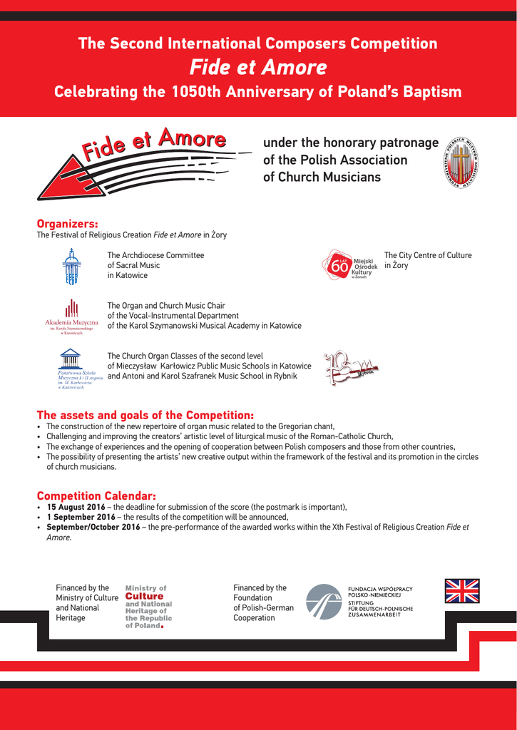 The Second International Composers Competition Fide et Amore Celebrating the 1050th Anniversary of Poland’s Baptism under the honorary patronage of the Polish Association of Church Musicians Organizers: The Festival of Religious Creation Fide et Amore in Żory The City Centre of Culture in Żory The Archdiocese Committee of Sacral Music in Katowice The Organ and Church Music Chair of the Vocal-Instrumental Department of the Karol Szymanowski Musical Academy in Katowice The Church Organ Classes of the second level of Mieczysław Karłowicz Public Music Schools in Katowice and Antoni and Karol Szafranek Music School in Rybnik The assets and goals of the Competition: • • • • The construction of the new repertoire of organ music related to the Gregorian chant, Challenging and improving the creators’ artistic level of liturgical music of the Roman-Catholic Church, The exchange of experiences and the opening of cooperation between Polish composers and those from other countries, The possibility of presenting the artists’ new creative output within the framework of the festival and its promotion in the circles of church musicians. Competition Calendar: • 15 August 2016 – the deadline for submission of the score (the postmark is important), • 1 September 2016 – the results of the competition will be announced, • September/October 2016 – the pre-performance of the awarded works within the Xth Festival of Religious Creation Fide et Amore. Financed by the Ministry of Culture and National Heritage Financed by the Foundation of Polish-German Cooperation Competition Requirements: • The objective of the competition is to compose an organ music piece to celebrate the 1050th Anniversary of Poland’s Baptism, • Enclosed is found the disposition of the instrument of the Immaculate Heart of the Virgin Mary Church in Żory-Rowień where the works will be performed for the first time, • The applicant will select one of the below listed biblical texts as the motto of his/her work: 1/ I will sprinkle clean water on you, and you will be clean [...]; I will give you a new heart and put a new spirit in you (Ezekiel 36: 25, 26), 2/ Go therefore and make disciples of all nations, baptizing them in the name of the Father and of the Son and of the Holy Spirit (Mt 28, 19), 3/ For as many of you as were baptized into Christ have put on Christ (Ga 3, 27), • The applicant of the competition can submit only one work with one selected motto, • The maximum duration of the work (score) must be no longer than 10 minutes, • Two printed copies of the musical score (the manuscript will not be considered in the competition) and an electronic version (graphic) on, e.g. CD, PenDrive USB should be sent according to the above mentioned terms to: Miejski Ośrodek Kultury ul. Dolne Przedmieście 1 44-240 ŻORY (II Konkurs kompozytorski FeA 2016) POLSKA • The printed competition works (musical scores) should be marked with a letter emblem; the sealed envelope marked with the same letter emblem should also be attached and should contain the following information of the applicant: a) composer’s full name, b) date and place of birth, c) nationality, c) address, telephone, fax and e-mail address, • Compositions not meeting the requirements stated in the above terms and conditions will not be admitted to the Competition, • The submitted scores will become the property of the organizer and will not be returned, • The competition is open to applicants who are graduates from or students of the Musical Academy, as well as other persons professionally concerned with liturgical music, • The composer of the awarded composition (this is related to the financial prizes and distinctions) declares via written consent that his/her work will be freely performed and registered for the archival purposes of the competition: - declares to consent for the free publication of the composition in journals such as: „Studia Hildegardiana Sariensia”, - the annual publication of the Festival of Religious Creation Fide et Amore and “Musica Ecclesiastica” – the journal of the Polish Association of Church Musicians, • Application for the Competition equals acceptance of its requirements. Jury: The submitted compositions will be assessed by the competent Jury, who are specialists in the art of composition, church music and theology. Prizes: • The Jury will evaluate the compositions with reference to their distinctive style and artistic value, • The Jury will award the following three prizes: ‣ The 1st Prize is(2500 zł. / 600 euros), ‣ The 2d Prize is (1500 zł./ 400 euros), ‣ The 3d Prize is (1000 zł./ 250 euros), • The prize value in Euros is approximate and will be paid according to the Euro rate, • The 10% or 20% PIT tax will be exempted from the prize, • The Jury reserves the right to a different division of prizes, • The decision of the Jury is final.