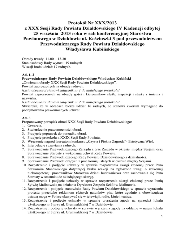Protokół Nr XXX/2013 z XXX Sesji Rady Powiatu Działdowskiego IV Kadencji odbytej 25 września 2013 roku w sali konferencyjnej Starostwa Powiatowego w Działdowie ul. Kościuszki 3 pod przewodnictwem Przewodniczącego Rady Powiatu Działdowskiego Władysława Kubińskiego Obrady trwały 11.00 – 13.30 Stan osobowy Rady wynosi: 19 radnych W sesji brało udział: 17 radnych. Ad. 1, 2 Przewodniczący Rady Powiatu Działdowskiego Władysław Kubiński „Otwieram obrady XXX Sesji Rady Powiatu Działdowskiego”. Powitał zaproszonych na obrady radnych. /Lista obecności stanowi załącznik nr 1 do niniejszego protokołu/ Powitał zaproszonych na obrady gości i kierowników służb, inspekcji i straży z imienia i nazwiska. /Lista obecności stanowi załącznik nr 2 do niniejszego protokołu/ Stwierdził, że w obradach bierze udział 16 radnych, co stanowi kworum wymagane do podejmowania prawomocnych uchwał. Ad. 3 Proponowany porządek obrad XXX Sesji Rady Powiatu Działdowskiego: 1. Otwarcie. 2. Stwierdzenie prawomocności obrad. 3. Przyjęcie poprawek do porządku obrad. 4. Przyjęcie protokołu z XXIX Sesji Rady Powiatu. 5. Wręczenie nagród laureatom konkursu „Czysta i Piękna Zagroda”- Estetyczna Wieś. 6. Interpelacje i zapytania radnych. 7. Sprawozdanie Przewodniczącego Zarządu z prac Zarządu w okresie między Sesjami oraz Sprawozdanie Starosty z wykonania uchwał Rady Powiatu. 8. Sprawozdanie Przewodniczącego Rady Powiatu Działdowskiego z działalności. 9. Sprawozdanie Przewodniczących z prac komisji stałych w okresie między Sesjami. 10. Rozpatrzenie i podjęcie uchwały w sprawie rozpatrzenia skargi złożonej przez Pana Sławomira Stanowskiego dotyczącej braku reakcji na zgłoszone uwagi o rzekomej niekompetencji pracowników Starostwa działu budownictwa oraz zachowania się Pana Starosty w stosunku do składającego skargę. 11. Rozpatrzenie i podjęcie uchwały w sprawie rozpatrzenia skargi złożonej przez Panią Sylwię Malinowską na działania Dyrektora Zespołu Szkół w Malinowie. 12. Rozpatrzenie i podjęcie stanowiska Rady Powiatu Działdowskiego w sprawie wyrażenia protestu przeciwko reklamom różnych gatunków piw, które zgodnie z obowiązującą ustawą mogą w Polsce ukazywać się w telewizji, radiu, kinie i teatrze. 13. Rozpatrzenie i podjęcie uchwały w sprawie wyrażenia zgody na sprzedaż lokalu użytkowego nr 3 przy ul. Grunwaldzkiej 7 w Działdowie. 14. Rozpatrzenie i podjęcie uchwały w sprawie wyrażenia zgody na oddanie w najem lokalu użytkowego nr 3 przy ul. Grunwaldzkiej 7 w Działdowie. 1 15. Rozpatrzenie i podjęcie uchwały w sprawie udzielenia pomocy finansowej dla Gminy Miasto Działdowo. 16. Rozpatrzenie i podjęcie uchwały w sprawie uchwalenia Wieloletniej Prognozy Finansowej Powiatu Działdowskiego na lata 2013 – 2018. 17. Rozpatrzenie i podjęcie uchwały w sprawie budżetu powiatu działdowskiego na rok 2013. 18. Odpowiedzi na interpelacje i zapytania. 19. Oświadczenia radnych. 20. Zapytania i wolne wnioski. 21. Zamknięcie obrad sesji. Przewodniczący Rady Powiatu Działdowskiego Władysław Kubiński Czy są uwagi do porządku posiedzenia? Skoro nie ma to zaproponuję jako punkt 10 „Informacja o Strategii rozwoju społecznogospodarczego województwa warmińsko-mazurskiego do roku 2025” , którą to przedstawiła radna sejmiku województwa Warmińsko – Mazurskiego Teresa Nowakowska Poddał pod głosowanie zgłoszony wniosek. Rada Powiatu Działdowskiego 16 głosami za, przyjęła zaproponowaną zmianę. Porządek obrad XXX Sesji Rady Powiatu Działdowskiego po zmianach 1. Otwarcie. 2. Stwierdzenie prawomocności obrad. 3. Przyjęcie poprawek do porządku obrad. 4. Przyjęcie protokołu z XXIX Sesji Rady Powiatu. 5. Wręczenie nagród laureatom konkursu „Czysta i Piękna Zagroda”- Estetyczna Wieś. 6. Interpelacje i zapytania radnych. 7. Sprawozdanie Przewodniczącego Zarządu z prac Zarządu w okresie między Sesjami oraz Sprawozdanie Starosty z wykonania uchwał Rady Powiatu. 8. Sprawozdanie Przewodniczącego Rady Powiatu Działdowskiego z działalności. 9. Sprawozdanie Przewodniczących z prac komisji stałych w okresie między Sesjami. 10. Informacja o Strategii rozwoju społeczno-gospodarczego województwa warmińskomazurskiego do roku 2025” 11. Rozpatrzenie i podjęcie uchwały w sprawie rozpatrzenia skargi złożonej przez Pana Sławomira Stanowskiego dotyczącej braku reakcji na zgłoszone uwagi o rzekomej niekompetencji pracowników Starostwa działu budownictwa oraz zachowania się Pana Starosty w stosunku do składającego skargę. 12. Rozpatrzenie i podjęcie uchwały w sprawie rozpatrzenia skargi złożonej przez Panią Sylwię Malinowską na działania Dyrektora Zespołu Szkół w Malinowie. 13. Rozpatrzenie i podjęcie stanowiska Rady Powiatu Działdowskiego w sprawie wyrażenia protestu przeciwko reklamom różnych gatunków piw, które zgodnie z obowiązującą ustawą mogą w Polsce ukazywać się w telewizji, radiu, kinie i teatrze. 14. Rozpatrzenie i podjęcie uchwały w sprawie wyrażenia zgody na sprzedaż lokalu użytkowego nr 3 przy ul. Grunwaldzkiej 7 w Działdowie. 15. Rozpatrzenie i podjęcie uchwały w sprawie wyrażenia zgody na oddanie w najem lokalu użytkowego nr 3 przy ul. Grunwaldzkiej 7 w Działdowie. 16. Rozpatrzenie i podjęcie uchwały w sprawie udzielenia pomocy finansowej dla Gminy Miasto Działdowo. 2 17. Rozpatrzenie i podjęcie uchwały w sprawie uchwalenia Wieloletniej Prognozy Finansowej Powiatu Działdowskiego na lata 2013 – 2018. 18. Rozpatrzenie i podjęcie uchwały w sprawie budżetu powiatu działdowskiego na rok 2013. 19. Odpowiedzi na interpelacje i zapytania. 20.Oświadczenia radnych. 21.Zapytania i wolne wnioski. 22. Zamknięcie obrad sesji. Ad. 4 Rada Powiatu jednogłośnie - 16 głosami za, bez czytania, nie wnosząc uwag przyjęła protokół XXIX Sesji Rady Powiatu Działdowskiego. Ad.5 Maria Ligman – Przewodnicząca konkursu Konkurs „Czyst