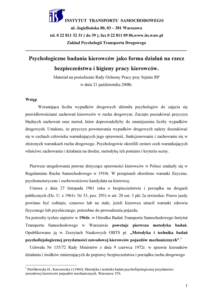 INSTYTUT TRANSPORTU SAMOCHODOWEGO ul. Jagiellońska 80, 03 – 301 Warszawa tel. 0 22 811 32 31 ( do 39 ), fax 0 22 811 09 06,www.its.waw.pl Zakład Psychologii Transportu Drogowego ----------------------------------------------------------------------------------------------------------------- Psychologiczne badania kierowców jako forma działań na rzecz bezpieczeństwa i higieny pracy kierowców. Materiał na posiedzenie Rady Ochrony Pracy przy Sejmie RP w dniu 21 października 2008r. Wstęp Wzrastająca liczba wypadków drogowych skłoniła psychologów do zajęcia się prawidłowościami zachowań kierowców w ruchu drogowym. Zaczęto poszukiwać przyczyn błędnych zachowań oraz metod, które doprowadziłyby do zmniejszenia liczby wypadków drogowych. Ustalono, Ŝe przyczyn powstawania wypadków drogowych naleŜy doszukiwać się w cechach człowieka warunkujących jego sprawność, funkcjonowanie i zachowanie się w złoŜonych warunkach ruchu drogowego. Psychologowie określili zestaw cech warunkujących właściwe zachowania i działania na drodze, metodykę ich pomiaru i kryteria oceny. Pierwsze uregulowania prawne dotyczące sprawności kierowców w Polsce znalazły się w Regulaminie Ruchu Samochodowego w 1910r. W przepisach określono warunki fizyczne, psychomotoryczne i osobowościowe kandydata na kierowcę. Ustawa z dnia 27 listopada 1961 roku o bezpieczeństwie i porządku na drogach publicznych (Dz. U. z 1961r. Nr 53, poz. 295) w art. 20 ust. 3 pkt 2a stwierdza: Prawo jazdy powinno być cofnięte, czasowo lub na stałe, jeŜeli kierowca utracił warunki zdrowia fizycznego lub psychicznego, potrzebne do prowadzenia pojazdu. Na potrzeby tychŜe zapisów w 1964r. w Ośrodku Badań Transportu Samochodowego Instytut Transportu Samochodowego w Warszawie powstaje pierwsza metodyka badań. Opublikowano ją w Zeszytach Naukowych OBTS pt. „Metodyka i technika badań psychofizjologicznej przydatności zawodowej kierowców pojazdów mechanicznych”.1 Uchwała Nr 155/72 Rady Ministrów z dnia 9 czerwca 1972r. w sprawie kierunków działania i środków zmierzających do poprawy bezpieczeństwa i porządku ruchu drogowego Pawlikowska H., Karczewska J (1964); Metodyka i technika badań psychofizjologicznej przydatności zawodowej kierowców pojazdów mechanicznych. Warszawa: ITS. 1 1 INSTYTUT TRANSPORTU SAMOCHODOWEGO ul. Jagiellońska 80, 03 – 301 Warszawa tel. 0 22 811 32 31 ( do 39 ), fax 0 22 811 09 06,www.its.waw.pl Zakład Psychologii Transportu Drogowego ----------------------------------------------------------------------------------------------------------------- wprowadziła obligatoryjny obowiązek badań psychologicznych kandydatów na kierowców zawodowych i osób zatrudnionych w zawodzie kierowcy. Spowodowało to konieczność ujednolicenia metodyki i techniki opiniowania psychologicznej przydatności do pracy w zawodzie kierowcy. Resortowy Ośrodek Organizacji i Normowania Pracy w Ministerstwie Gospodarki Terenowej i Ochrony Środowiska dn. 20.03.1973r. publikuje zasady metodyczne wstępnych, okresowych i powypadkowych badań psychologicznych kandydatów na kierowców i kierowców według ustaleń i opracowań Instytutu Transportu Samochodowego2. W opracowaniu tym znalazły się dane dotyczące: 1) szczegółowych zasad badania wstępnego i okresowego, 2) przebiegu i zakresu badań psychologicznych, 3) szczegółowych zasad badania powypadkowego. Z opracowania tego wynika, Ŝe celem badań psychologicznych jest: „niedopuszczenie do kierowania pojazdami samochodowymi osób, które pomimo posiadania odpowiedniego stanu zdrowia, stanowiłyby zagroŜenie w ruchu drogowym. Bezpieczeństwo jazdy warunkowane jest bowiem w istotny sposób strukturą psychiczną kierowcy”. O tego czasu psychologiczne badania kierujących pojazdami stały się jednym z istotnych elementów systemu działań na rzecz bezpieczeństwa ruchu drogowego. Ze względu na fakt, iŜ w zdecydowanej większości kierowcy wykonują swoją pracę właśnie poprzez uczestnictwo w ruchu drogowym, moŜna je traktować równocześnie jako działania na rzecz bezpieczeństwa i higieny pracy kierowcy. Ministerstwo Gospodarki Terenowej i Ochrony Środowiska Resortowy Ośrodek Organizacji i Normowania Pracy „Zasady metodyczne wstępnych, okresowych i powypadkowych badań psychologicznych kandydatów na kierowców i kierowców. Warszawa 1973r. 2 2 INSTYTUT TRANSPORTU SAMOCHODOWEGO ul. Jagiellońska 80, 03 – 301 Warszawa tel. 0 22 811 32 31 ( do 39 ), fax 0 22 811 09 06,www.its.waw.pl Zakład Psychologii Transportu Drogowego ----------------------------------------------------------------------------------------------------------------- 1. Podstawa prawna psychologicznych badań kierowców Podstawę prawną psychologicznych badań kierowców stanowią aktualnie: • Ustawa z dnia 20 czerwca 1997 roku – Prawo o ruchu drogowym ( tekst jednolity: • Ustawa z dnia 6 września 2001 roku o transporcie drogowym ( tekst jednolity: Dz. U. • Rozporządzenie Ministra Zdrowia z dnia 1 kwietnia 2005 roku w sprawie badań Dz. U. z 2005r., Nr 108, poz. 908 z 2007r,, Nr 125, poz. 874 z póź. zm.) psychologicznych kierowców i osób ubiegających się o uprawnienia do kierowania pojazdami oraz wykonujących pracę na stanowisku kierowcy ( Dz. U. Nr 69, poz. 622 z póź. zm.) • Rozporządzenie Ministra Pracy i Polityki Społecznej z dnia 28 maja 1996 roku w sprawie rodzajów prac wymagających szczególnej sprawności psychofizycznej będące aktem wykonawczym do Kodeksu pracy. W przypadku osób wykonujących pracę na stanowisku kierowcy ( niezaleŜnie od formalnego zatrudnienia na tym stanowisku) aktem podstawowym jest w/w ustawa o transporcie drogowym. W odniesieniu do osoby zatrudnionej (w rozumieniu Kodeksu pracy) wykonującej pracę wymienioną w wykazie prac wymagających szczególnej sprawności psychofizycznej, podstawą tą jest Kodeks pracy. W szczególnych przypadkach określonych w ustawie podstawą tą