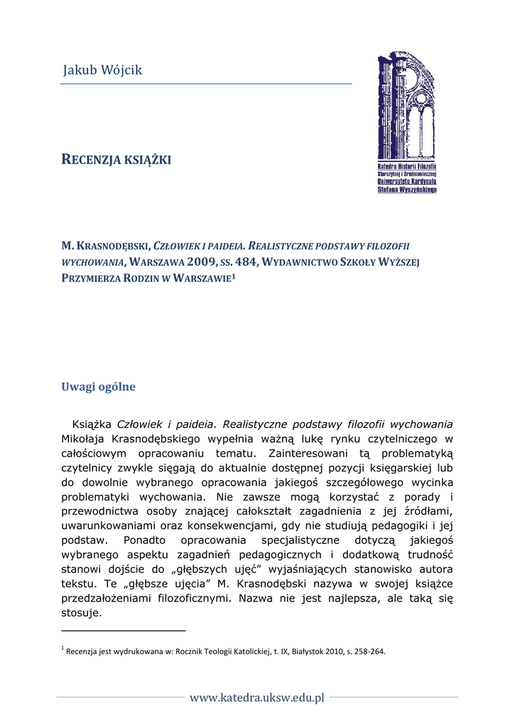 Jakub Wó jcik RECENZJA KSIĄŻKI M. KRASNODĘBSKI, CZŁOWIEK I PAIDEIA. REALISTYCZNE PODSTAWY FILOZOFII WYCHOWANIA, WARSZAWA 2009, SS. 484, WYDAWNICTWO SZKOŁY WYŻSZEJ PRZYMIERZA RODZIN W WARSZAWIE1 Uwagi ogólne Książka Człowiek i paideia. Realistyczne podstawy filozofii wychowania Mikołaja Krasnodębskiego wypełnia ważną lukę rynku czytelniczego w całościowym opracowaniu tematu. Zainteresowani tą problematyką czytelnicy zwykle sięgają do aktualnie dostępnej pozycji księgarskiej lub do dowolnie wybranego opracowania jakiegoś szczegółowego wycinka problematyki wychowania. Nie zawsze mogą korzystać z porady i przewodnictwa osoby znającej całokształt zagadnienia z jej źródłami, uwarunkowaniami oraz konsekwencjami, gdy nie studiują pedagogiki i jej podstaw. Ponadto opracowania specjalistyczne dotyczą jakiegoś wybranego aspektu zagadnień pedagogicznych i dodatkową trudność stanowi dojście do „głębszych ujęć” wyjaśniających stanowisko autora tekstu. Te „głębsze ujęcia” M. Krasnodębski nazywa w swojej książce przedzałożeniami filozoficznymi. Nazwa nie jest najlepsza, ale taką się stosuje. 1 Recenzja jest wydrukowana w: Rocznik Teologii Katolickiej, t. IX, Białystok 2010, s. 258-264. www.katedra.uksw.edu.pl 2 Autor książki wprowadza nas w problematykę pedagogiczną budowaną na filozoficznych jej podstawach i wskazuje na praktyczne konsekwencje różnych przedzałożeń myślenia i postępowania pedagogicznego. Problematyka ta – nazwijmy ją krótko pedagogiką – ma swoje korzenie w starożytności i jest aktualna dzisiaj. Pedagogika, nazywana też teorią wychowania i teorią kształcenia lub łącznie teorią edukacji człowieka, uprawiana jest w wielu środowiskach naukowych. Obserwuje się coraz większe zainteresowanie wyodrębnioną w pedagogice dyscypliną nazywaną filozoficznymi podstawami pedagogiki, które stanowią przedmiot omawianej książki. M. Krasnodębski szuka podstaw pedagogiki w filozofii bytu, antropologii filozoficznej i etyce. Odróżnia się to ujęcie od pedagogiki budowanej na filozofii przyrody, filozofii kultury lub na tzw. naukach szczegółowych. Klamrą spinającą omówienie różnych przedzałożeń filozoficznych pedagogiki jest historia badania rzeczywistości. Historycy filozofii – i to badacze różnych okresów, pochodzący z różnych szkół – odwołują się zazwyczaj do filozoficznej propozycji badania rzeczywistości, opracowanej przez Tomasza z Akwinu, jako najpełniejszej refleksji filozoficznej w dziejach klasycznej wersji filozofowania i wynikających z tej wersji konsekwencji pedagogicznych. Autor książki zwraca przy tym uwagę, na znajdującą się w propozycjach Tomasza kontynuację dorobku antyku i późniejszych myślicieli. Korzysta z wypracowanych przez profesora Mieczysława Gogacza – współczesnego tomisty – odróżnień wyjaśniających myśl Akwinaty. Przede wszystkim omawia wskazane przez Gogacza właściwe punkty wyjścia dla pedagogiki budowanej w oparciu o tomizm konsekwentny wypracowany przez Profesora. Analizuje perspektywy badawcze pedagogiki wynikające z filozofii człowieka i inne, wynikające z badań o człowieku jako osobie. Każdy człowiek jest osobą, ale odróżnienie jest ważne, inne bowiem wynikają konkluzje pedagogiczne z omawiania człowieka jako byt, a inne zaś – z omawiania osoby ludzkiej. Punktem odniesienia pozostaje w tych wszystkich dziedzinach ujęcie człowieka jako osoby, tak konsekwentnie i przekonująco ukazane w niniejszej książce. Budowa książki i jej zawartość Książka oprócz wstępu, zakończenia i bogatej bibliografii składa się z trzech części, każda po cztery rozdziały. Każda z części zakończona jest podsumowaniem. Części i zawarte w nich rozdziały nie są streszczeniem 3 myśli różnych autorów, ale stanowią przemyślaną koncepcję przedstawienia realistycznych podstaw wychowania i wpisują się w aktualną dyskusję na temat kształtu filozofii wychowania i samego wychowania. Autor jest dla czytelnika prowadzącym i przewodnikiem tych dyskusji. Nie jest obojętnym narratorem omawianych problemów. Zaletą książki jest szeroka baza źródłowa, skrupulatne dokumentowanie przytaczanych tez i opinii. Wydaje się, że Autor wykazuje dobre zorientowanie w filozofii, filozofii wychowania oraz konsekwencjach pedagogicznych. Książka zawiera wiele ciekawych i interesujących ujęć. Wskazuje na dużą erudycję i umiejętność analizy tekstów filozoficznych i jest napisana dobrym językiem polskim. Zawiera jednak tzw. pomyłki literowe, które należy poprawić i raczej stanowią niedbałość edytorską wydanego dzieła. Na podkreślenie zasługuje to, że książka nie jest tylko werbalnym przypomnieniem tez głoszonych przez na przykład W. F. Bednarskiego, J. Woronieckiego i M. Gogacza, ale jest nowatorską próbą zastosowania realistycznej filozofii na płaszczyźnie edukacji, rozumianej jako wychowanie i kształcenie. Autor rozwija w rozprawie zagadnienia, które w tomizmie nie zostały zauważone, np. teoria resentymentu wprowadzona przez M. Schelera i K. Wojtyłę. Tak rozumiana filozofia wychowania jest „służbą, którą człowiek pełni wobec człowieka”. Wzbogaceniem dyskusji nad filozofią wychowania jest zauważenie wkładu ciekawych sformułowań dokonanych przez różnych autorów, nie zawsze korzystających z realistycznych podstaw. M. Krasnodębski nie ocenia ich i tym bardziej nie kompiluje, ale rzetelnie relacjonuje. Przykładem jest dostrzeżenie przez autora zapoczątkowania teorii resentymentu przez F. Nietzschego, choć Autor dystansuje się od poglądów i tez tego filozofa. Przywołany przez Krasnodębskiego przykład resentymentu i jego twórcy F. Nietzschego dobrze ilustruje treść książki i stan współczesnej myśli pedagogicznej. Zamiast odczytywać człowieka i Boga oraz na porządnej wiedzy o tych Osobach budować właściwą etykę i pedagogikę, t