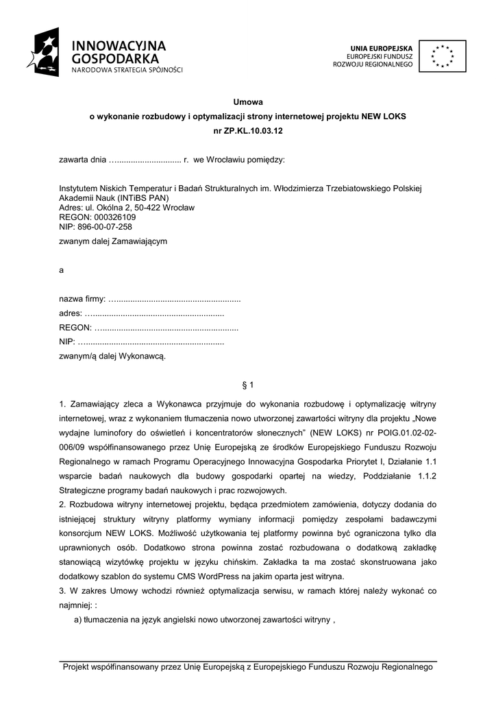 Umowa o wykonanie rozbudowy i optymalizacji strony internetowej projektu NEW LOKS nr ZP.KL.10.03.12 zawarta dnia …............................ r. we Wrocławiu pomiędzy: Instytutem Niskich Temperatur i Badań Strukturalnych im. Włodzimierza Trzebiatowskiego Polskiej Akademii Nauk (INTiBS PAN) Adres: ul. Okólna 2, 50-422 Wrocław REGON: 000326109 NIP: 896-00-07-258 zwanym dalej Zamawiającym a nazwa firmy: …...................................................... adres: …......................................................... REGON: …........................................................... NIP: …............................................................ zwanym/ą dalej Wykonawcą. §1 1. Zamawiający zleca a Wykonawca przyjmuje do wykonania rozbudowę i optymalizację witryny internetowej, wraz z wykonaniem tłumaczenia nowo utworzonej zawartości witryny dla projektu „Nowe wydajne luminofory do oświetleń i koncentratorów słonecznych” (NEW LOKS) nr POIG.01.02-02006/09 współfinansowanego przez Unię Europejską ze środków Europejskiego Funduszu Rozwoju Regionalnego w ramach Programu Operacyjnego Innowacyjna Gospodarka Priorytet I, Działanie 1.1 wsparcie badań naukowych dla budowy gospodarki opartej na wiedzy, Poddziałanie 1.1.2 Strategiczne programy badań naukowych i prac rozwojowych. 2. Rozbudowa witryny internetowej projektu, będąca przedmiotem zamówienia, dotyczy dodania do istniejącej struktury witryny platformy wymiany informacji pomiędzy zespołami badawczymi konsorcjum NEW LOKS. Możliwość użytkowania tej platformy powinna być ograniczona tylko dla uprawnionych osób. Dodatkowo strona powinna zostać rozbudowana o dodatkową zakładkę stanowiącą wizytówkę projektu w języku chińskim. Zakładka ta ma zostać skonstruowana jako dodatkowy szablon do systemu CMS WordPress na jakim oparta jest witryna. 3. W zakres Umowy wchodzi również optymalizacja serwisu, w ramach której należy wykonać co najmniej: : a) tłumaczenia na język angielski nowo utworzonej zawartości witryny , Projekt współfinansowany przez Unię Europejską z Europejskiego Funduszu Rozwoju Regionalnego b) dodanie strony do najważniejszych katalogów, c) przedstawienie schematu linkowania do strony, tak aby można było wstawiać linki do projektu na innych stronach, d) uruchomienie kampanii linków sponsorowanych w Google adwords. §2 1. Wykonawca wykona rozbudowę i optymalizację serwisu internetowego w terminie 5 dni od dnia podpisania niniejszej Umowy. 2. Do wykonania zlecenia Wykonawca użyje materiałów powierzonych przez Zamawiającego oraz materiałów własnych. Wykonawca i Zamawiający oświadczają, że posiadają wyłączne prawa do użytych materiałów własnych oraz że materiały użyte nie są obciążone prawami osób trzecich. 3. Do rozwiązywania szczegółowych kwestii realizacyjnych wynikających z przyjętej Umowy strony delegują: - ze strony Zamawiającego: Andrzej Koczarski, tel.: (71) 343 50 21 wew. 237 - ze strony Wykonawcy: .................................., tel.: …………........................ §3 1. W przypadku nie wywiązania się z terminów przez Wykonawcę Zamawiający ma prawo obciążyć Wykonawcę za każdy dzień zwłoki karą w wysokości 0,5% od kwoty wykonania serwisu WWW, jednak nie więcej niż 10% ceny. Wyjątkiem jest opóźnienie wynikłe w następstwie okoliczności, za które Wykonawca odpowiedzialności nie ponosi. 2. Wykonawca zapłaci Zamawiającemu karę umowną za odstąpienie od wykonania umowy bez winy lub zgody Zamawiającego w wysokości 10% ceny. 3. Zamawiający zapłaci Wykonawcy karę umowną za odstąpienie od wykonania umowy bez winy lub zgody Wykonawcy w wysokości 10% ceny. 4. Zamawiający ma 1 dzień na odbiór serwisu internetowego. Jeżeli Zamawiający nie wyrazi uwag dotyczących wykonania i funkcjonowania przyjmuje się, że serwis zaakceptował i odebrał. Z odebrania strony internetowej sporządza się protokół, który musi zostać podpisany przez obie Strony. §4 1. Wykonawca przyjmując zlecenie zobowiązuje się wykonać je z najwyższą starannością i w najlepszej wierze, jak również chronić wszelkie prawa i interesy Zamawiającego. 2. Wykonawca udziela Zamawiającemu gwarancji na okres 24 miesięcy, licząc od daty wdrożenia angielskojęzycznej wersji witryny w sieci Internet na serwerze Zamawiającego. 3. W przypadku stwierdzenia w trakcie okresu gwarancji wadliwości nowo utworzonych funkcjonalności serwisu internetowego niepowstałych na skutek działania siły wyższej, osób trzecich Projekt współfinansowany przez Unię Europejską z Europejskiego Funduszu Rozwoju Regionalnego lub Zamawiającego, Wykonawca zobowiązuje się do ich nieodpłatnego usunięcia. Czas reakcji na zgłoszenie awarii: do 3 dni roboczych od zgłoszenia. §5 Za wykonanie przedmiotu niniejszej umowy Wykonawca otrzyma wynagrodzenie w wysokości …....................... zł brutto (słownie: ….............. złotych brutto). Wynagrodzenie zostanie przekazane na konto bankowe Wykonawcy (zostanie wskazane na fakturze VAT) w terminie 14 dni od daty otrzymania faktury VAT. §6 1. Zamawiający nabywa majątkowe prawa autorskie do nowo utworzonych funkcjonalności serwisu internetowego w zakresie: 1) wyglądu graficznego serwisu (layoutu), 2) utrwalania techniką cyfrową oraz 3) publicznego udostępniania kodu wynikowego. 2. Przeniesienie majątkowych praw autorskich następuje nieodpłatnie. §7 1. Wszelkie zmiany niniejszej umowy wymagają formy pisemnej pod rygorem nieważności. 2. Umowę sporządzono w dwóch jednobrzmiących egzemplarzach po jednym dla każdej ze stron. 3. Spory jakie mogą wyniknąć na tle realizacji niniejszej umowy będą rozstrzygane polubownie, a w przypadku braku możliwości będą rozstrzygane przez sąd według właściwości ogólnej. 4. W sprawach nieuregulowanych niniejszą umową mają zastosowanie przepisy Kodeksu Cywilnego. Zamawiający Wykonawca Projekt wsp