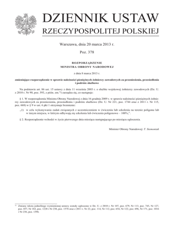 DZIENNIK USTAW RZECZYPOSPOLITEJ POLSKIEJ Warszawa, dnia 20 marca 2013 r. Poz. 378 ROZPORZĄDZENIE MINISTRA OBRONY NARODOWEJ z dnia 8 marca 2013 r. zmieniające rozporządzenie w sprawie należności pieniężnych żołnierzy zawodowych za przeniesienia, przesiedlenia i podróże służbowe Na podstawie art. 86 ust. 15 ustawy z dnia 11 września 2003 r. o służbie wojskowej żołnierzy zawodowych (Dz. U. z 2010 r. Nr 90, poz. 593, z późn. zm.1)) zarządza się, co następuje: § 1. W rozporządzeniu Ministra Obrony Narodowej z dnia 16 grudnia 2009 r. w sprawie należności pieniężnych żołnierzy zawodowych za przeniesienia, przesiedlenia i podróże służbowe (Dz. U. Nr 221, poz. 1744 oraz z 2011 r. Nr 115, poz. 668) w § 9 w ust. 6 pkt 1 otrzymuje brzmienie: „1)w celu wykonywania zadań związanych z uczestniczeniem w ćwiczeniu lub szkoleniu na terenie poligonu lub w innym miejscu, w którym odbywają się szkolenia lub ćwiczenia poligonowe – 100%,”. § 2. Rozporządzenie wchodzi w życie pierwszego dnia miesiąca następującego po miesiącu ogłoszenia. Minister Obrony Narodowej: T. Siemoniak 1) Zmiany tekstu jednolitego wymienionej ustawy zostały ogłoszone w Dz. U. z 2010 r. Nr 107, poz. 679, Nr 113, poz. 745, Nr 127, poz. 857, Nr 182, poz. 1228 i Nr 238, poz. 1578 oraz z 2011 r. Nr 22, poz. 114, Nr 112, poz. 654, Nr 122, poz. 696, Nr 171, poz. 1016 i Nr 236, poz. 1396.