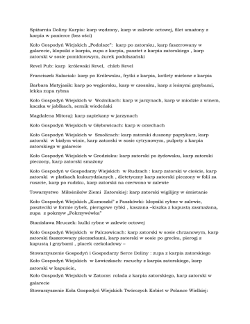 Spiżarnia Doliny Karpia: karp wędzony, karp w zalewie octowej, filet smażony z karpia w panierce (bez ości) Koło Gospodyń Wiejskich „Podolsze”: karp po zatorsku, karp faszerowany w galarecie, klopsiki z karpia, zupa z karpia, pasztet z karpia zatorskiego , karp zatorski w sosie pomidorowym, żurek podolszański Revel Pub: karp królewski Revel, chleb Revel Franciszek Sałaciak: karp po Królewsku, frytki z karpia, kotlety mielone z karpia Barbara Matyjasik: karp po węgiersku, karp w czosnku, karp z leśnymi grzybami, lekka zupa rybna Koło Gospodyń Wiejskich w Woźnikach: karp w jarzynach, karp w miodzie z winem, kaczka w jabłkach, sernik wiedeński Magdalena Mitoraj: karp zapiekany w jarzynach Koło Gospodyń Wiejskich w Głębowicach: karp w orzechach Koło Gospodyń Wiejskich w Smolicach: karp zatorski duszony paprykarz, karp zatorski w białym winie, karp zatorski w sosie cytrynowym, pulpety z karpia zatorskiego w galarecie Koło Gospodyń Wiejskich w Grodzisku: karp zatorski po żydowsku, karp zatorski pieczony, karp zatorski smażony Koło Gospodyń w Gospodarzy Wiejskich w Rudzach : karp zatorski w cieście, karp zatorski w płatkach kukurydzianych , dietetyczny karp zatorski pieczony w folii za ruszcie, karp po rudzku, karp zatorski na czerwono w zalewie Towarzystwo Miłośników Ziemi Zatorskiej: karp zatorski wigilijny w śmietanie Koło Gospodyń Wiejskich „Kumoszki” z Paszkówki: klopsiki rybne w zalewie, paszteciki w formie rybek, pierogowe rybki , kaszana –kiszka z kapustą zasmażaną, zupa z pokrzyw „Pokrzywówka” Stanisława Mruczek: kulki rybne w zalewie octowej Koło Gospodyń Wiejskich w Palczowicach: karp zatorski w sosie chrzanowym, karp zatorski faszerowany pieczarkami, karp zatorski w sosie po grecku, pierogi z kapustą i grzybami , placek czekoladowy – Stowarzyszenie Gospodyń i Gospodarzy Serce Doliny : zupa z karpia zatorskiego Koło Gospodyń Wiejskich w Łowiczkach: racuchy z karpia zatorskiego, karp zatorski w kapuście, Koło Gospodyń Wiejskich w Zatorze: rolada z karpia zatorskiego, karp zatorski w galarecie Stowarzyszenie Koła Gospodyń Wiejskich Twórczych Kobiet w Polance Wielkiej: prażonki polańskie, chrzan na każdą okazję, kapusta wigilijna, makowiec polański Janina Koterwas: sernik królewski Koło Gospodyn Wiejskich Zygodowice: chrzanówka na maślance po zygodowsku Koło Gospodyń Wiejskich w Sosnowicach: chrzanówka wielkanocna Koło Gospodyn Wiejskich „Wyźrał” : groch z kapustą Koło Gospodyń Wiejskich „Bachowice”: grzybianka z borowików Stowarzyszenie Integracyjne Wspólna Sprawa w Osieku: kapusta z wieprzowiną Zespół Szkół Rolnicze Centrum Kształcenia Ustawicznego im. Jana Pawła II w Radoczy: szarlotka Koło Gospodyń Wiejskich w Przeciszowie: żur po przeciszowsku na zakwasie z ciasta chlebowego – Maria Bałys: kluski kartoflane, raczuchy z manną