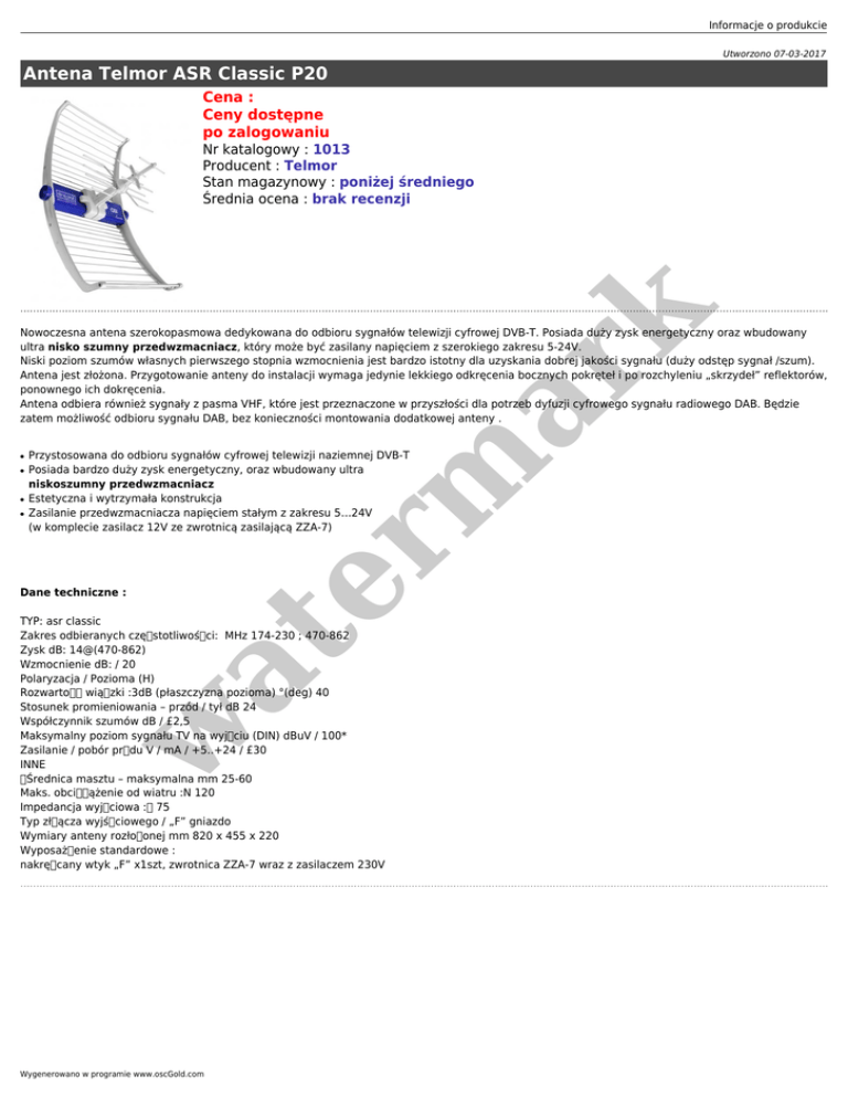 Informacje o produkcie Utworzono 07-03-2017 Antena Telmor ASR Classic P20 Cena : Ceny dostępne po zalogowaniu er m ar k Nr katalogowy : 1013 Producent : Telmor Stan magazynowy : poniżej średniego Średnia ocena : brak recenzji Nowoczesna antena szerokopasmowa dedykowana do odbioru sygnałów telewizji cyfrowej DVB-T. Posiada duży zysk energetyczny oraz wbudowany ultra nisko szumny przedwzmacniacz, który może być zasilany napięciem z szerokiego zakresu 5-24V. Niski poziom szumów własnych pierwszego stopnia wzmocnienia jest bardzo istotny dla uzyskania dobrej jakości sygnału (duży odstęp sygnał /szum). Antena jest złożona. Przygotowanie anteny do instalacji wymaga jedynie lekkiego odkręcenia bocznych pokręteł i po rozchyleniu „skrzydeł” reflektorów, ponownego ich dokręcenia. Antena odbiera również sygnały z pasma VHF, które jest przeznaczone w przyszłości dla potrzeb dyfuzji cyfrowego sygnału radiowego DAB. Będzie zatem możliwość odbioru sygnału DAB, bez konieczności montowania dodatkowej anteny . ● ● ● ● Przystosowana do odbioru sygnałów cyfrowej telewizji naziemnej DVB-T Posiada bardzo duży zysk energetyczny, oraz wbudowany ultra niskoszumny przedwzmacniacz Estetyczna i wytrzymała konstrukcja Zasilanie przedwzmacniacza napięciem stałym z zakresu 5…24V (w komplecie zasilacz 12V ze zwrotnicą zasilającą ZZA-7) Dane techniczne : w at TYP: asr classic Zakres odbieranych częstotliwości: MHz 174-230 ; 470-862 Zysk dB: 14@(470-862) Wzmocnienie dB: / 20 Polaryzacja / Pozioma (H) Rozwarto wiązki :3dB (płaszczyzna pozioma) °(deg) 40 Stosunek promieniowania – przód / tył dB 24 Współczynnik szumów dB / £2,5 Maksymalny poziom sygnału TV na wyjciu (DIN) dBuV / 100* Zasilanie / pobór prdu V / mA / +5..+24 / £30 INNE Średnica masztu – maksymalna mm 25-60 Maks. obciążenie od wiatru :N 120 Impedancja wyjciowa : 75 Typ złącza wyjściowego / „F” gniazdo Wymiary anteny rozłoonej mm 820 x 455 x 220 Wyposażenie standardowe : nakręcany wtyk „F” x1szt, zwrotnica ZZA-7 wraz z zasilaczem 230V Wygenerowano w programie www.oscGold.com