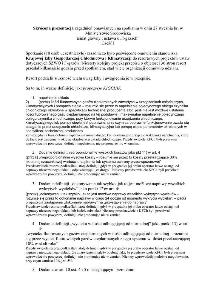 Skrócona prezentacja zagadnień omawianych na spotkaniu w dniu 27 stycznia br. w Ministerstwie Środowiska temat główny : ustawa o „f-gazach” Cześć I Spotkanie (10 osób uczestniczyło) zasadniczo było poświęcone omówieniu stanowiska Krajowej Izby Gospodarczej Chłodnictwa i Klimatyzacji do resortowych projektów ustaw dotyczących SZWO i F-gazów. Niestety kolejny projekt przepisu o objętości 36 stron resort przesłał kilkanaście godzin przed spotkaniem, stąd wiele organizacji odmówiło udziału. Resort podzielił słuszność wielu uwag Izby i uwzględnia je w przepisie. Są to m. in ważne definicje, jak: propozycje KIGCHIK 1. napełnienie układu 2) (przez) ilości fluorowanych gazów cieplarnianych zawartych w urządzeniach chłodniczych, klimatyzacyjnych i pompach ciepła – rozumie się przez to napełnienie pojedynczego obiegu czynnika chłodniczego określone w specyfikacji technicznej producenta albo, jeśli nie jest możliwe ustalenie ilości fluorowanego gazu cieplarnianego na tej podstawie, maksymalne napełnienie pojedynczego obiegu czynnika chłodniczego, przy którym funkcjonowanie urządzenia chłodniczego, klimatyzacyjnego lub pompy ciepła jest poprawne, przy czym za poprawne funkcjonowanie uważa się osiąganie przez urządzenie chłodnicze, klimatyzacyjne lub pompę ciepła parametrów określonych w specyfikacji technicznej producenta. Ze względu na brak definicji napełnienia nominalnego, koniecznym jest przyjęcie wskaźnika napełnienia, które de facto jest zmienne w okresie eksploatacji układu chłodniczego. Przedstawiciele KFCh byli przeciwni wprowadzeniu powyższej definicji napełnienia, nie proponując nic w zamian. 2. Dodanie definicji „nieproporcjonalnie wysokich kosztów jako pkt 11) w art. 4 (przez) „nieproporcjonalnie wysokie koszty – rozumie się przez to koszty przekraczające 30% aktualnej szacunkowej wartości urządzenia lub systemu ochrony przeciwpożarowej” Przedstawiciele resortu podkreślali istotę definicji, gdyż w przypadku jej braku operator łatwo odstąpi od naprawy nieszczelnego układu, odpowiadając: „za drogo”. Niestety przedstawiciele KFCh byli przeciwni wprowadzeniu powyższej definicji, nie proponując nic w zamian. 3. Dodanie definicji „dokonywania tak szybko, jak to jest możliwe naprawy wszelkich wykrytych wycieków” jako punkt 12)w art. 4: (przez) „dokonywaniu tak szybko, jak to jest możliwe naprawy wszelkich wykrytych wycieków – rozumie się przez to dokonanie naprawy w ciągu 24 godzin od momentu wykrycia wycieku”. – padła propozycja zastąpienia „dokonanie naprawy” na „przystąpienie do naprawy” Przedstawiciele resortu podkreślali istotę definicji, gdyż w przypadku jej braku operator łatwo odstąpi od naprawy nieszczelnego układu lub będzie odwlekał. Niestety przedstawiciele KFCh byli przeciwni wprowadzeniu powyższej definicji, nie proponując nic w zamian. 4. Dodanie definicji „wycieku w ilości odbiegającej od normalnej” jako punkt 13) w art. 4: „wycieku fluorowanych gazów cieplarnianych w ilości odbiegającej od normalnej – rozumie się przez wyciek fluorowanych gazów cieplarnianych z tego systemu w ilości przekraczającej 10% w skali roku” Przedstawiciele resortu podkreślali istotę definicji, gdyż w przypadku jej braku operator łatwo odstąpi od naprawy nieszczelnego układu. Ze zdziwieniem należy odebrać fakt, że przedstawiciele KFCh byli przeciwni wprowadzeniu powyższej definicji, nie proponując nic w zamian. Niemcy wprowadziły podobne uregulowanie, przy czym zamiast 10% jest 5%. 5. Dodanie w art. 10 ust. 4 i 5 o następującym brzmieniu: „4. Operator urządzenia lub systemu ochrony przeciwpożarowej zawierającego 3 kg lub więcej fluorowanych gazów cieplarnianych, w którym wyciek tych gazów przekroczył w skali roku 20% jest zobowiązany do zapewnienia, że w terminie 30 dni od stwierdzenia takiego wycieku zostanie wykonana przez osobę o kwalifikacjach określonych odpowiednio w ust. 2 lub 3 ekspertyza wskazująca sposób postępowania z urządzeniem lub systemem ochrony przeciwpożarowej zapewniający ograniczenie wycieku do poziomu poniżej 5% w skali roku. 5. Operator urządzenia lub systemu ochrony przeciwpożarowej, dla którego została wykonana ekspertyza, o której mowa w ust. 4 jest zobowiązany do postępowania z tym urządzeniem lub systemem w sposób wskazany w tej ekspertyzie”. Propozycja zmiany progowych poziomów ilości fluorowanych gazów cieplarnianych zawartych w urządzeniu lub systemie ochrony przeciwpożarowej, dla których obowiązują określone harmonogramy kontroli szczelności (z 3kg – do 2,5 kg, z 30 kg – do 15 kg i z 300 kg- do 150 kg) – jest zdaniem KIGCHIK istotnym elementem regulacji. Pkt ten nie był przedmiotem dyskusji, lecz negatywna odpowiedź resortu jest niezadawalająca i bardzo zdawkowa. Uwaga resortu: Propozycja obniżenia progowych poziomów w znaczący sposób zwiększałaby koszty realizacji przepisów ustawy przez operatorów. Ponadto logiczne wydaje się pozostawienie tych ilości na poziomach określonych w rozporządzeniu (WE) nr 842/2006, które stanowią rozwiązanie kompromisowe dla całej Europy. Bardzo niskie poziomy zawarte w przepisach obowiązujących w Danii wynikają z tego, że Dania wyeliminowała już prawie całkowicie Fgazy ze stosowania. W Polsce nie nastąpi to szybko. Progi obniżyły Dania, Francja, Niemcy, Hiszpania. W Hiszpanii zlikwidowano trzeci próg. Naszym zdaniem, sprawdzenie szczelności jest zabiegiem tanim, sprzyja lepszemu nadzorowi nad układem chłodniczym, a czasem może przynieść wymierne efekty jak, oczyszczenie skraplacza, wyregulowanie itp. które zmniejszą zużycie energii. Jaka jest Państwa opinia w tej sprawie ? Resort wypełnił postulat Izby i wyodrębnił zagadnienia chłodnicze z pozostałych branż. Nie jest zdecydowana kwestia czy będzie ustawa f-gazowa dla chłodnictwa. W ocenie innych legislatorów nie ma żadn