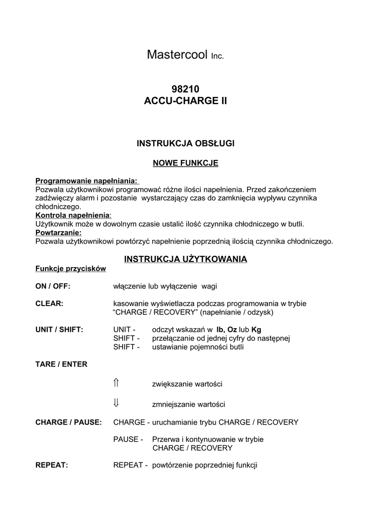 Mastercool Inc. 98210 ACCU-CHARGE II INSTRUKCJA OBSŁUGI NOWE FUNKCJE Programowanie napełniania: Pozwala użytkownikowi programować różne ilości napełnienia. Przed zakończeniem zadźwięczy alarm i pozostanie wystarczający czas do zamknięcia wypływu czynnika chłodniczego. Kontrola napełnienia: Użytkownik może w dowolnym czasie ustalić ilość czynnika chłodniczego w butli. Powtarzanie: Pozwala użytkownikowi powtórzyć napełnienie poprzednią ilością czynnika chłodniczego. INSTRUKCJA UŻYTKOWANIA Funkcje przycisków ON / OFF: włączenie lub wyłączenie wagi CLEAR: kasowanie wyświetlacza podczas programowania w trybie “CHARGE / RECOVERY” (napełnianie / odzysk) UNIT / SHIFT: UNIT SHIFT SHIFT - odczyt wskazań w Ib, Oz lub Kg przełączanie od jednej cyfry do następnej ustawianie pojemności butli zwiększanie wartości zmniejszanie wartości TARE / ENTER CHARGE / PAUSE: CHARGE - uruchamianie trybu CHARGE / RECOVERY PAUSE - REPEAT: Przerwa i kontynuowanie w trybie CHARGE / RECOVERY REPEAT - powtórzenie poprzedniej funkcji NAPEŁNIANIE STANDARDOWE 1. Wyjąć wagę z walizki. 2. Postawić wagę na poziomej powierzchni. 3. Ustawić butlę na środku płyty i przyłączyć do króćca cieczowego (w razie potrzeby odwrócić butlę podstawą do góry). 4. Odpowietrzyć węże napełniające wykorzystując pompę próżniową . 5. Załączyć poprzez naciśnięcie przycisku “ON / OFF”. 6. Nacisnąć przycisk “TARE / ENTER” - wyświetlacz pokaże “0” (Jeżeli wyświetlacz nie pokaże “0”, sprawdź procedurę tarowania pustej butli). 7. Otworzyć zawór i rozpocząć napełnianie. 8. Gdy zostanie osiągnięta wymagana ilość , zawór zamknąć. 9. Aby wyłączyć, nacisnąć przycisk “ON / OFF”. NAPEŁNIANIE PROGRAMOWANE 1. Powtórzyć etapy 1 – 5 trybu “NAPEŁNIANIE STANDARDOWE” . 2. Nacisnąć przycisk “CHARGE / PAUSE”. 3. Ustawić ilość czynnika chłodniczego do przetłoczenia, wykorzystując przyciski “CLEAR”, , , oraz “SHIFT” . 4. Aby rozpocząć nacisnąć “ENTER”. 5. Otworzyć zawór na butli i rozpocząć napełnianie. Krótko przed końcem napełniania zabrzmi krótki alarm, pozostawiając czas na zamknięcie przepływu. 6. Po zakończeniu napełniania, zabrzmi ponownie alarm wagi i na wyświetlaczu pojawi się napis ”CH / END” . Naciśnij dowolny przycisk aby wyciszyć alarm. (Jeżeli butla jest pusta i napełnianie nie jest zakończone, nacisnąć przycisk “CHARGE / PAUSE”, wymienić butlę i ponownie nacisnąć “CHARGE / PAUSE” aby kontynuować napełnianie). 7. Jeżeli zostanie osiągnięta wymagana ilość, zamknąć zawór i nacisnąć przycisk “ON / OFF” aby wyłączyć wagę. Waga jest wstępnie zaprogramowana dla minimalnej i maksymalnej wagi butli : 0 kg / 110kg (0 oz / 240 Ibs). * Aby zmienić ustawienia wagi butli, wykonaj procedurę ustawiania pojemności butli. POWTÓRZENIE NAPEŁNIANIA 1. Aby powtórzyć poprzednią wartość napełnienia nacisnąć “REPEAT” . 2. Otworzyć zawór. 3. Gdy zostanie osiagnięta wymagana ilość, zamknąć zawór i wyłączyć poprzez naciśnięcie “ON / OFF”. (Jeżeli waga była wyłączona, zastosuj procedury 1 – 5 NAPEŁNIANIA STANDARDOWEGO, następnie “POWTÓRZENIE NAPEŁNIANIA). ODZYSK / RECYKLING 1. Powtórzyć etapy 1 - 7 NAPEŁNIANIA STANDARDOWEGO. 2. Rozpocząć odsysanie. 3. Gdy proces zostanie zakończony, wyświetlacz pokaże ilość zgromadzonego w butli czynnika. USTAWIANIE POJEMNOŚCI BUTLI 1. Włączyć wagę. 2. Wybrać jednostkę odczytu przyciskiem “UNIT/SHIFT”. 3. Jeszcze raz nacisnąć “UNIT/SHIFT” i trzymać naciśnięty przycisk tak długo, aż ostatnia cyfra będzie migać. 4. Poprzez przyciski “CLEAR” , i “SHIFT” wprowadzić masę pustej butli. 5. Nacisnąć “ENTER” aby zatwierdzić. Wyświetli się “Good” dla potwierdzenia. 6. W celu wprowadzenia masy pełnej butli naciskać przyciski “CLEAR” , i “SHIFT”. 7. Nacisnąć “ENTER” aby zatwierdzić . Wyświetli się “Good - Out” dla potwierdzenia. 8. W celu wyłączenia nacisnąć “ON/OFF”. DANE TECHNICZNE • • • • • • • Zakres: Dokładność: 110 kg (240 lbs) +/-0,01 Kg lub 0,1% z odczytu (większa z wartości) Rozdzielczość: 10 gr, 0,01 Ib (0,01 Kg) Funkcja automatycznego wyłączenia po 3 godzinach Zakres temperatur pracy: 00C do 490C Żywotność baterii ok. 40 godzin Wyjmowalna płyta wagi 23 cm x 23 cm WYMIANA BATERII Baterię 9V należy wymienić, kiedy zaświeci się dioda “słaba bateria”. Nie używać wagi przy słabej baterii.