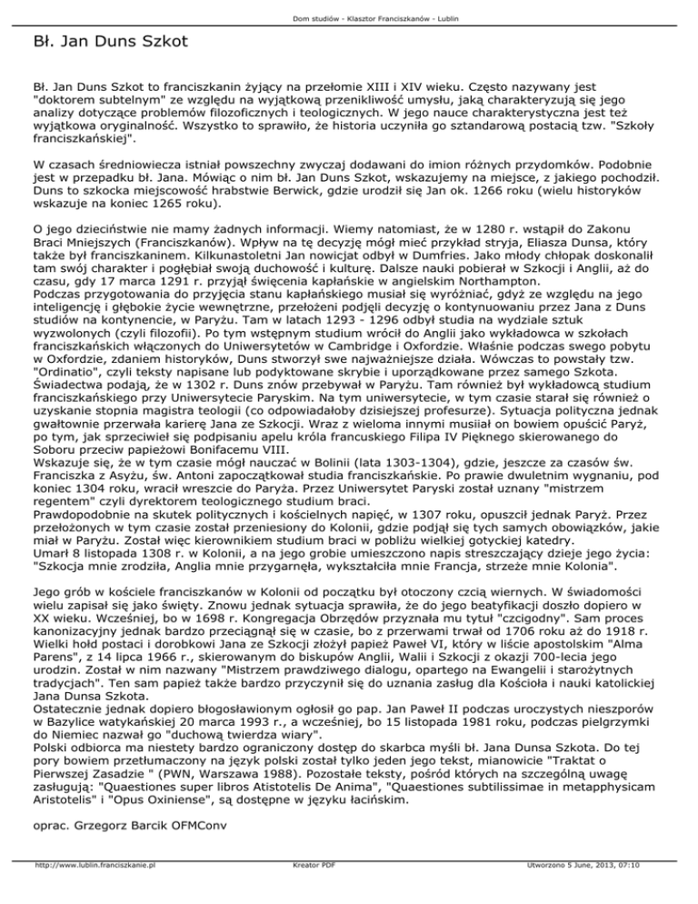 Dom studiów - Klasztor Franciszkanów - Lublin Bł. Jan Duns Szkot Bł. Jan Duns Szkot to franciszkanin żyjący na przełomie XIII i XIV wieku. Często nazywany jest "doktorem subtelnym" ze względu na wyjątkową przenikliwość umysłu, jaką charakteryzują się jego analizy dotyczące problemów filozoficznych i teologicznych. W jego nauce charakterystyczna jest też wyjątkowa oryginalność. Wszystko to sprawiło, że historia uczyniła go sztandarową postacią tzw. "Szkoły franciszkańskiej". W czasach średniowiecza istniał powszechny zwyczaj dodawani do imion różnych przydomków. Podobnie jest w przepadku bł. Jana. Mówiąc o nim bł. Jan Duns Szkot, wskazujemy na miejsce, z jakiego pochodził. Duns to szkocka miejscowość hrabstwie Berwick, gdzie urodził się Jan ok. 1266 roku (wielu historyków wskazuje na koniec 1265 roku). O jego dzieciństwie nie mamy żadnych informacji. Wiemy natomiast, że w 1280 r. wstąpił do Zakonu Braci Mniejszych (Franciszkanów). Wpływ na tę decyzję mógł mieć przykład stryja, Eliasza Dunsa, który także był franciszkaninem. Kilkunastoletni Jan nowicjat odbył w Dumfries. Jako młody chłopak doskonalił tam swój charakter i pogłębiał swoją duchowość i kulturę. Dalsze nauki pobierał w Szkocji i Anglii, aż do czasu, gdy 17 marca 1291 r. przyjął święcenia kapłańskie w angielskim Northampton. Podczas przygotowania do przyjęcia stanu kapłańskiego musiał się wyróżniać, gdyż ze względu na jego inteligencję i głębokie życie wewnętrzne, przełożeni podjęli decyzję o kontynuowaniu przez Jana z Duns studiów na kontynencie, w Paryżu. Tam w latach 1293 - 1296 odbył studia na wydziale sztuk wyzwolonych (czyli filozofii). Po tym wstępnym studium wrócił do Anglii jako wykładowca w szkołach franciszkańskich włączonych do Uniwersytetów w Cambridge i Oxfordzie. Właśnie podczas swego pobytu w Oxfordzie, zdaniem historyków, Duns stworzył swe najważniejsze działa. Wówczas to powstały tzw. "Ordinatio", czyli teksty napisane lub podyktowane skrybie i uporządkowane przez samego Szkota. Świadectwa podają, że w 1302 r. Duns znów przebywał w Paryżu. Tam również był wykładowcą studium franciszkańskiego przy Uniwersytecie Paryskim. Na tym uniwersytecie, w tym czasie starał się również o uzyskanie stopnia magistra teologii (co odpowiadałoby dzisiejszej profesurze). Sytuacja polityczna jednak gwałtownie przerwała karierę Jana ze Szkocji. Wraz z wieloma innymi musiiał on bowiem opuścić Paryż, po tym, jak sprzeciwieł się podpisaniu apelu króla francuskiego Filipa IV Pięknego skierowanego do Soboru przeciw papieżowi Bonifacemu VIII. Wskazuje się, że w tym czasie mógł nauczać w Bolinii (lata 1303-1304), gdzie, jeszcze za czasów św. Franciszka z Asyżu, św. Antoni zapoczątkował studia franciszkańskie. Po prawie dwuletnim wygnaniu, pod koniec 1304 roku, wracił wreszcie do Paryża. Przez Uniwersytet Paryski został uznany "mistrzem regentem" czyli dyrektorem teologicznego studium braci. Prawdopodobnie na skutek politycznych i kościelnych napięć, w 1307 roku, opuszcił jednak Paryż. Przez przełożonych w tym czasie został przeniesiony do Kolonii, gdzie podjął się tych samych obowiązków, jakie miał w Paryżu. Został więc kierownikiem studium braci w pobliżu wielkiej gotyckiej katedry. Umarł 8 listopada 1308 r. w Kolonii, a na jego grobie umieszczono napis streszczający dzieje jego życia: "Szkocja mnie zrodziła, Anglia mnie przygarnęła, wykształciła mnie Francja, strzeże mnie Kolonia". Jego grób w kościele franciszkanów w Kolonii od początku był otoczony czcią wiernych. W świadomości wielu zapisał się jako święty. Znowu jednak sytuacja sprawiła, że do jego beatyfikacji doszło dopiero w XX wieku. Wcześniej, bo w 1698 r. Kongregacja Obrzędów przyznała mu tytuł "czcigodny". Sam proces kanonizacyjny jednak bardzo przeciągnął się w czasie, bo z przerwami trwał od 1706 roku aż do 1918 r. Wielki hołd postaci i dorobkowi Jana ze Szkocji złożył papież Paweł VI, który w liście apostolskim "Alma Parens", z 14 lipca 1966 r., skierowanym do biskupów Anglii, Walii i Szkocji z okazji 700-lecia jego urodzin. Został w nim nazwany "Mistrzem prawdziwego dialogu, opartego na Ewangelii i starożytnych tradycjach". Ten sam papież także bardzo przyczynił się do uznania zasług dla Kościoła i nauki katolickiej Jana Dunsa Szkota. Ostatecznie jednak dopiero błogosławionym ogłosił go pap. Jan Paweł II podczas uroczystych nieszporów w Bazylice watykańskiej 20 marca 1993 r., a wcześniej, bo 15 listopada 1981 roku, podczas pielgrzymki do Niemiec nazwał go "duchową twierdza wiary". Polski odbiorca ma niestety bardzo ograniczony dostęp do skarbca myśli bł. Jana Dunsa Szkota. Do tej pory bowiem przetłumaczony na język polski został tylko jeden jego tekst, mianowicie "Traktat o Pierwszej Zasadzie " (PWN, Warszawa 1988). Pozostałe teksty, pośród których na szczególną uwagę zasługują: "Quaestiones super libros Atistotelis De Anima", "Quaestiones subtilissimae in metapphysicam Aristotelis" i "Opus Oxiniense", są dostępne w języku łacińskim. oprac. Grzegorz Barcik OFMConv http://www.lublin.franciszkanie.pl Kreator PDF Utworzono 5 June, 2013, 07:10