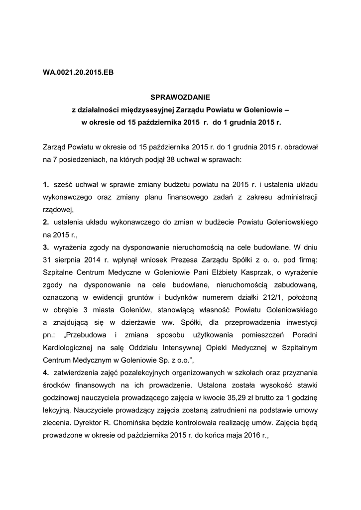 WA.0021.20.2015.EB SPRAWOZDANIE z działalności międzysesyjnej Zarządu Powiatu w Goleniowie – w okresie od 15 października 2015 r. do 1 grudnia 2015 r. Zarząd Powiatu w okresie od 15 października 2015 r. do 1 grudnia 2015 r. obradował na 7 posiedzeniach, na których podjął 38 uchwał w sprawach: 1. sześć uchwał w sprawie zmiany budżetu powiatu na 2015 r. i ustalenia układu wykonawczego oraz zmiany planu finansowego zadań z zakresu administracji rządowej, 2. ustalenia układu wykonawczego do zmian w budżecie Powiatu Goleniowskiego na 2015 r., 3. wyrażenia zgody na dysponowanie nieruchomością na cele budowlane. W dniu 31 sierpnia 2014 r. wpłynął wniosek Prezesa Zarządu Spółki z o. o. pod firmą: Szpitalne Centrum Medyczne w Goleniowie Pani Elżbiety Kasprzak, o wyrażenie zgody na dysponowanie na cele budowlane, nieruchomością zabudowaną, oznaczoną w ewidencji gruntów i budynków numerem działki 212/1, położoną w obrębie 3 miasta Goleniów, stanowiącą własność Powiatu Goleniowskiego a znajdującą się w dzierżawie ww. Spółki, dla przeprowadzenia inwestycji pn.: „Przebudowa i zmiana sposobu użytkowania pomieszczeń Poradni Kardiologicznej na salę Oddziału Intensywnej Opieki Medycznej w Szpitalnym Centrum Medycznym w Goleniowie Sp. z o.o.”, 4. zatwierdzenia zajęć pozalekcyjnych organizowanych w szkołach oraz przyznania środków finansowych na ich prowadzenie. Ustalona została wysokość stawki godzinowej nauczyciela prowadzącego zajęcia w kwocie 35,29 zł brutto za 1 godzinę lekcyjną. Nauczyciele prowadzący zajęcia zostaną zatrudnieni na podstawie umowy zlecenia. Dyrektor R. Chomińska będzie kontrolowała realizację umów. Zajęcia będą prowadzone w okresie od października 2015 r. do końca maja 2016 r., 5. przyznania Stypendium Rady Powiatu. Stypendium Rady Powiatu przyznanie zostanie na rok szkolny 2015/2016, na okres od września do końca czerwca (10 miesięcy) w kwocie 200 zł miesięcznie niżej wymienionym uczniom ze szkół ponadgimnazjalnych prowadzonych przez Powiat Goleniowski: a) Dominika Kaczmarek z Zespołu Szkół Ogólnokształcących Nr 1 w Nowogardzie, b) Daria Dendał z Zespołu Szkół Ogólnokształcących Nr 1 w Nowogardzie, c) Katarzyna Kozłowska z Zespołu Szkół Ponadgimnazjalnych im. Stanisława Staszica w Nowogardzie, d) Adrian Molenda z Zespołu Szkół nr 1 w Goleniowie, 6. przekazania jednostkom organizacyjnym mienia ruchomego zakupionego na potrzeby realizacji Projektu „E-Inclusion Powiatu Goleniowskiego”. Zgodnie z umową zawartą z Władzą Wdrażającą Programy Europejskie, Powiat Goleniowski otrzymał dofinansowanie na realizację projektu „E-Inclusion Powiatu Goleniowskiego”. Pozyskane środki przeznaczone zostały między innymi na zakup sprzętu komputerowego wraz z oprogramowaniem do świetlic zlokalizowanych w jednostkach organizacyjnych oraz na zapewnienie dostępu do Internetu. Zakupione składniki majątku znajdują się obecnie w jednostkach objętych Projektem: Specjalnym Ośrodku Szkolno – Wychowawczym w Nowogardzie – 10 zestawów, Zespole Szkół Ponadgimnazjalnych w Nowogardzie – 10 zestawów, Zespole Szkół Specjalnych w Goleniowie – 10 zestawów, Zespole Szkół nr 1 w Goleniowie, ul. Maszewska - 10 zestawów, Zespole Szkół nr 1 w Goleniowie, ul. Niepodległości – 10 zestawów, Zespole Szkół Ogólnokształcących w Nowogardzie – 10 zestawów, Zespole Szkół Ponadgimnazjalnych w Maszewie – 10 zestawów; Centrum Obsługi Placówek Opiekuńczo-Wychowawczych w Nowogardzie – łącznie 18 zestawów, Centrum Obsługi Placówek Opiekuńczo-Wychowawczych w Goleniowie – łącznie 27 zestawów, 7. przystąpienia Powiatu Goleniowskiego – Powiatowego Centrum Pomocy Rodzinie w Goleniowie do realizacji projektów w trybie pozakonkursowym w ramach Regionalnego Programu Operacyjnego Województwa Zachodniopomorskiego na lata 2014-2020. Środki otrzymane w ramach projektu, umożliwią upowszechnianie aktywnej integracji i pracy socjalnej przez PCPR i OPS-y z terenu powiatu goleniowskiego z wykorzystaniem usług aktywnej integracji o charakterze społecznym, zawodowym, edukacyjnym oraz zdrowotnym, 2 8. udzielenia pełnomocnictwa Dyrektorowi Powiatowego Centrum Pomocy Rodzinie w Goleniowie. Udzielone zostało pełnomocnictwo Pani Krystynie Jaworskiej do podejmowania wszelkich czynności w sprawie podpisywania w imieniu Powiatu Goleniowskiego umów, porozumień partnerskich oraz podejmowania wszelkich czynności i składania wszelkich oświadczeń woli związanych z realizacją projektu w ramach Działania 7.1 „Programy na rzecz integracji osób i rodzin zagrożonych ubóstwem i/lub wykluczeniem społecznym ukierunkowane na aktywizację społecznozawodową wykorzystującą instrumenty aktywizacji edukacyjnej, społecznej, zawodowej”, Osi priorytetowej VII „Włączenie społeczne” współfinansowane z Europejskiego Funduszu Społecznego w ramach Regionalnego Programu Operacyjnego Województwa Zachodniopomorskiego 2014-2020, 9. wydania opinii dotyczącej projektu realizacji inwestycji drogowej dla zadania pn.: „Przebudowa ulicy Maszewskiej i ulicy Zakładowej w Goleniowie wraz z infrastrukturą techniczną”. Pan Wojciech Sobolewski działający z upoważnienia Burmistrza Gminy Goleniów zwrócił się do Zarządu Powiatu w Goleniowie o wydanie opinii w odniesieniu do projektu realizacji inwestycji drogowej dla zadania pn. ,,Przebudowa ulicy Maszewskiej i ulicy Zakładowej w Goleniowie wraz z infrastrukturą techniczną’’, 10. wyrażenia zgody na udostępnienie nieruchomości oznaczonej numerem działki 146/1 położonej w obrębie 4 miasta Nowogard przy Placu Wolności 9 w celu instalacji kabla UTP T-Mobile Polska S.A. Udostepnienie nieruchomości nastąpi nieodpłatnie, gdyż Spółka – działając na zlecenie Ministerstwa Pracy i Polityki Społecznej – wykonuje wyżej opisaną pracę na potrzeby Powiatowego Urzędu Pracy – jednostki o