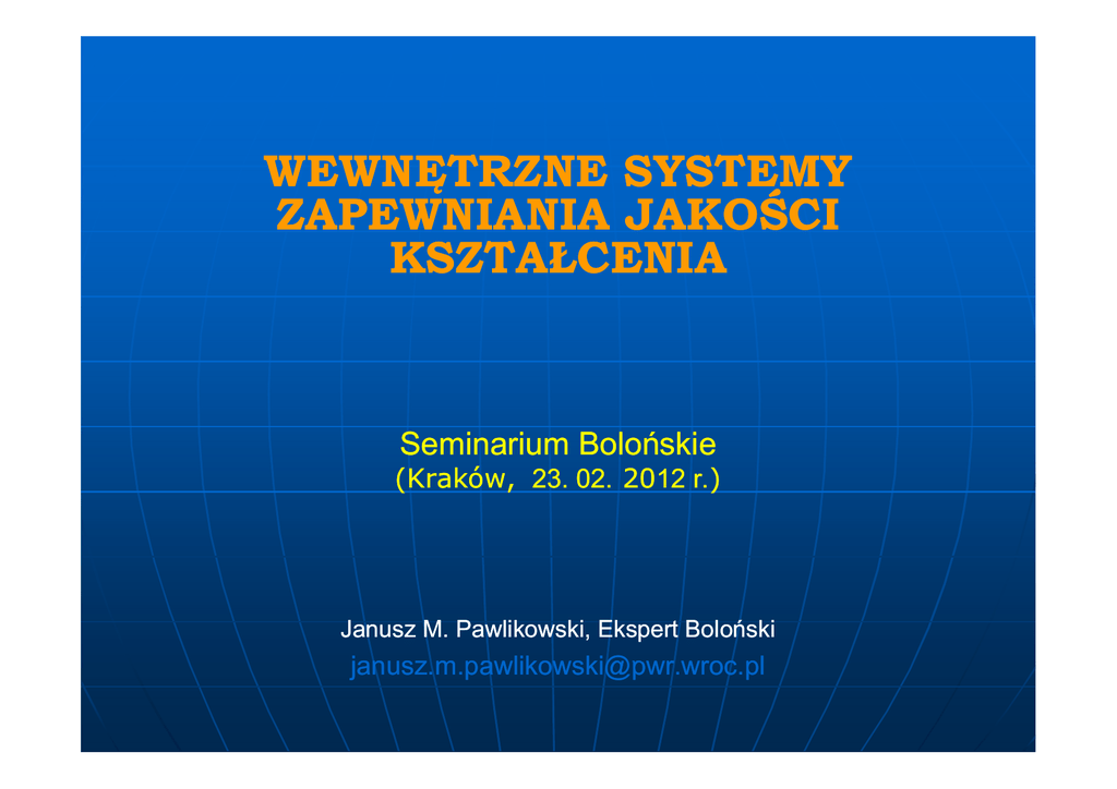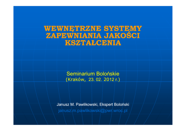 WEWNĘTRZNE SYSTEMY ZAPEWNIANIA JAKOŚCI KSZTAŁCENIA Seminarium Bolońskie (Kraków, (Kraków 23. 23 02 02. 20 2012 12 rr.) r.) Janusz M. Pawlikowski, Ekspert Boloński [email protected] janusz m pawlikowski@pwr wroc pl JMP KONTEKST PROBLEMU JAKOŚCI Trochę danych : „Fala umasawiania studiów” przetoczyła się tak tak:: USA : lata 60 – te te;; Kanada : lata 70 – te te;; Europa : lata 80 – te te;; Polska : lata 90 – te Rok akad akad.. uczelnie ogółem uczelnie niepubliczne 1992//1993 1992 124 18 2010//2011 2010 443 330 Rok akad akad.. studenci ogółem w uczelniach niepublicznych (w tyś) 1990//1991 1990 ok.. 400 ok ok.. 30 ok 2007//2008 2007 ok ok.. 1 930 ok ok.. 530 Ilu z tych studentów nadaje się na studia I, a ile na II stopnia ? 2 JMP Co z tym wszystkim zrobić ? Opinie są zgodne: jednolite studia magisterskie może podjąć i ukończyć w terminie około 8 -12 % populacji maturzystów (w aktualnych warunkach polskich jjest to liczba zbliżona do około 100 tysięcy). p y ę y) Co zrobić z pozostałą grupą „chętnych” kandydatów liczącą ok. 350 tysięcy ? ! nie obniżając przy tym poziomu uzyskanego wykształcenia – kwalifikacji osiągniętych na poziomie magisterium !!! Jak przy tym unowocześniać (zreformować !) szkolnictwo wyższe? Jak pogodzić aspiracje młodzieży z, dosyć powszechnym, słabym jej przygotowaniem t i d do podjęcia dj i studiów t dió ? Jak pogodzić wymagania rynku pracy (teraz – europejskiego ! ) z obecnymi kwalifikacjami uzyskanymi w procesie kształcenia na poziomie wyższym ? 3 JMP J Jakość k ść k kształcenia t ł i – o co tyle t l hałasu h ł ? Od kilkunastu lat mamy więc w Polsce zupełnie nowe elementy sytuacji : 1. Umasowienie kształcenia kształcenia,, w tym przede wszystkim na poziomie wyższym (współczynnik skolaryzacji brutto w UE wynosi obecnie około 52 %; w Polsce podobnie podobnie;; USA chcą osiągnąć w najbliższym czasie współczynnik 75 % ! Dyskusja – co to jest szkoła wyższa ?) ?).. 2. Zaniknęła w trakcie kształcenia relacja relacja:: mistrz – uczeń, która była ongiś gwarantem „odwzorowywania odwzorowywania mistrza mistrza” , a więc i prawdopodobieństwa dobrej jakości wykształcenia wykształcenia.. 3. Pojawił się wyraźny trend w zarządzaniu uczelniami uczelniami:: coraz mniej autonomii ; „naruszanej” z zewnątrz, ale i od wewnątrz (!?) 4. Obniżył y się ę bardzo znacząco ą p poziom wykształcenia y kandydatów y na studia,, przede wszystkim z przedmiotów ścisłych. ścisłych. 5. W obecnym systemie finansowania uczelnie nie sprzyjają jakości kształcenia ! 4 JMP Jakość kształcenia – o co tyle hałasu ? c. d. Uwagi.. Uwagi 1. O ile można osiągnąć dobrą jakość „pojedynczego produktu” wytwarzanego jednostkowo (np.. samochód Rolls (np Rolls--Royce, Royce doktorat,) doktorat ) o tyle w „produkcji produkcji masowej masowej” musimy stosować normy jakości, przestrzegane „bez indywidualizacji” indywidualizacji”.. Czy normy/standardy mogą zastąpić indywidualną/osobistą dbałość o jakość produktu (np (np.. ze strony promotora) ? 2. Ogromne znaczenie ma wybór „pola normowania normowania”” – czy są nim parametry „wejścia”, „wejścia”, czyli warunki w jakich powstaje produkt, produkt czy też parametry „wyjścia wyjścia” , czyli cechy owego produktu (lub obydwa) obydwa).. Tutaj wybór jest oczywisty – a jednak w praktyce polskiego szkolnictwa wyższego stosowane było tylko to pierwsze podejście !!! 3. Co można zrobić ? włączyć system zapewniania jakości kształcenia, jako ważny element, do reformy europejskiego szkolnictwa wyższego zwanej Procesem Bolońskim Bolońskim.. 5 JMP PODSTAWOWY CEL PROCESU BOLOŃSKIEGO Stworzenie Europejskiego Obszaru Szkolnictwa Wyższego Wyższego,, EOSW (powiązanego z Europejskim Obszarem Badań Naukowych, EOBN) EOBN) w którym funkcjonować będą wspólnie opracowane zasady d organizacji i ji k kształcenia t ł i na poziomie i i wyższym;; z poszanowaniem instytucji i tradycji krajów wyższym uczestniczących w tym procesie procesie.. Następnie - zwiększenie atrakcyjności oraz konkurencyjności EOSW (plus EOBN) w Europie i w całym świecie ! 6 JMP CELE DO ZREALIZOWANIA W RAMACH EOSW 1. Kształcenie na wysokim poziomie studentów dla potrzeb europejskiego ! i krajowych/regionalnych rynków pracy pracy.. 2. Przygotowywanie światłych obywateli demokratycznych państw, aktywnie dbających o swój ciągły rozwój (w tym – edukacyjny). 3. Promowanie wysokiej mobilności studentów i pracowników oraz wspieranie kształcenia ustawicznego („lifelong learning”, LLL) LLL).. 7 JMP NARZĘDZIA Ę REALIZACJI CELÓW 1. Europejska i Krajowe Ramy Kwalifikacji. Kwalifikacji. 2. Studia St di dwustopniowe d t i (t (trzystopniowe) (trzystopniowe). t i ). 3. Standardy i procedury zapewniania jakości kształcenia kształcenia.. 4. Punktowy P kt system t akumulacji k l ji i transferu t f osiągnięć i i ć studentów t d tó i absolwentów (ECTS) (ECTS).. 5. Suplement S l t do d dyplomu d l 6. inne 8 JMP JAKOŚĆ KSZTAŁCENIA JAKOŚĆ KSZTAŁCENIA OCENIANA MOŻE BYĆ JEDYNIE MIARĄ WZGLĘDNĄ ! Procedury ewaluacji jakości kształcenia : Przegląd (review, quality audit audit)); Ocena (assesment assesment)); Akredytacja (accreditation accreditation)). Ta ostatnia kontestowana często ze względu na skutki ! 9 JMP JAKOŚĆ KSZTAŁCENIA c. d. 1. Przegląd: systematyczne sprawdzanie, czy działania na Przegląd: rzecz jakości kształcenia oraz uzyskane rezultaty są zgodne z planowanymi, a także czy rezultaty te są wykorzystywane efektywnie y i odpowiednio p do p przyjętych yję y założeń. założeń. 2. Ocena : skoncentrowane na konkretnej działalności (tutaj – kształceniu) a u) o orzekanie a o ja jakości o tejj d działalności aa o w odniesieniu od u do postawionych przed nią celów celów.. 3. Akredytacja : proces, w którym uczelnia zdobywa prawo nad