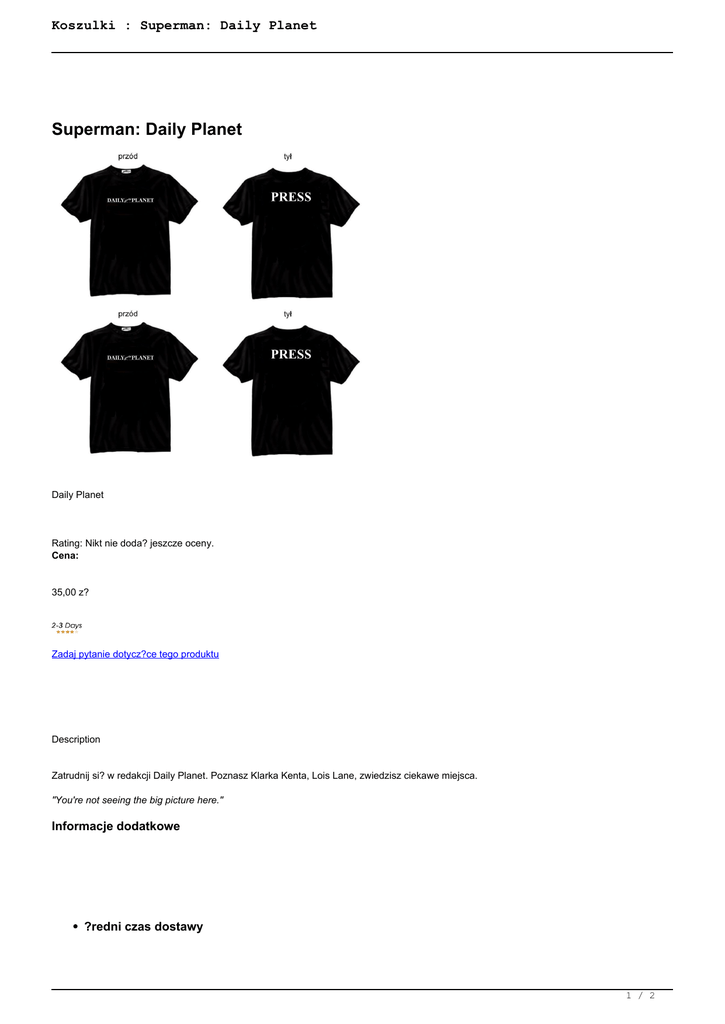 Koszulki : Superman: Daily Planet Superman: Daily Planet Daily Planet Rating: Nikt nie doda? jeszcze oceny. Cena: 35,00 z? Zadaj pytanie dotycz?ce tego produktu Description Zatrudnij si? w redakcji Daily Planet. Poznasz Klarka Kenta, Lois Lane, zwiedzisz ciekawe miejsca. "You're not seeing the big picture here." Informacje dodatkowe ?redni czas dostawy 1 / 2 Koszulki : Superman: Daily Planet 2-3 dni Dost?pne kolory: czarny Zwroty i reklamacja Wed?ug regulaminu sklepu Dost?pno?? Na terenie Polski Dost?pne ?rodki p?atno?ci Przedp?ata na konto / p?atno?ci elektroniczne online 2 / 2 Powered by TCPDF (www.tcpdf.org)