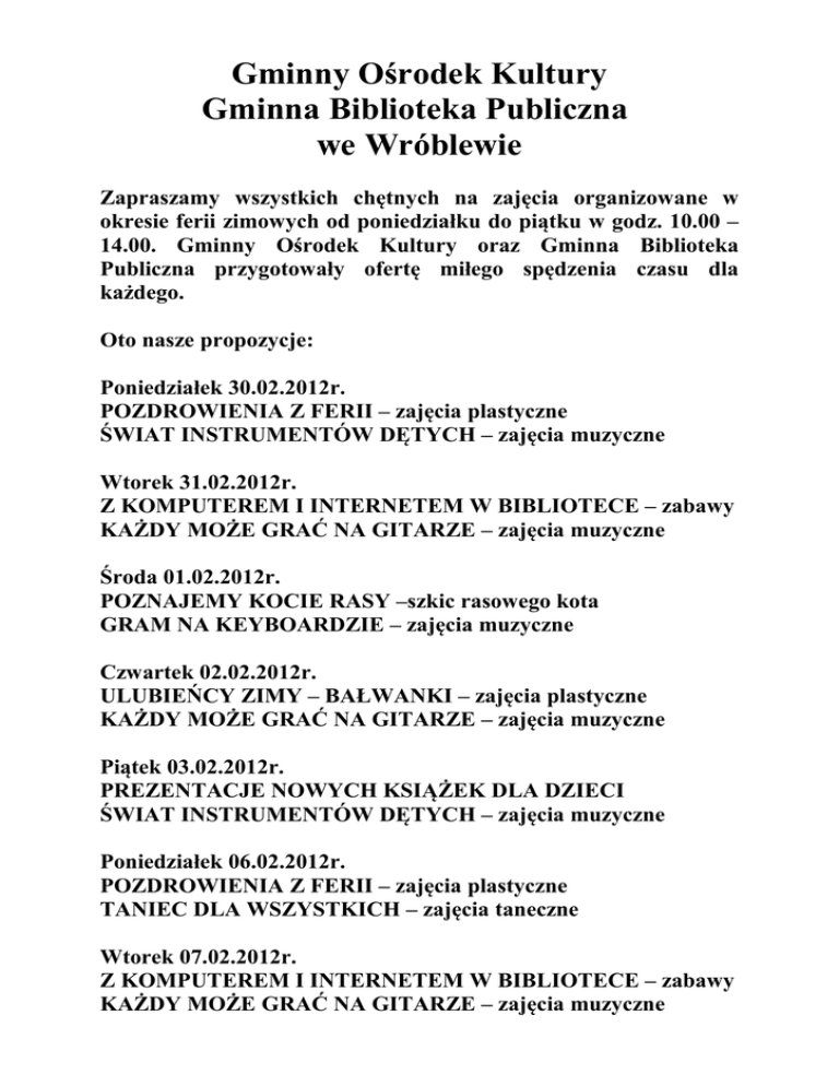 Gminny Ośrodek Kultury Gminna Biblioteka Publiczna we Wróblewie Zapraszamy wszystkich chętnych na zajęcia organizowane w okresie ferii zimowych od poniedziałku do piątku w godz. 10.00 – 14.00. Gminny Ośrodek Kultury oraz Gminna Biblioteka Publiczna przygotowały ofertę miłego spędzenia czasu dla każdego. Oto nasze propozycje: Poniedziałek 30.02.2012r. POZDROWIENIA Z FERII – zajęcia plastyczne ŚWIAT INSTRUMENTÓW DĘTYCH – zajęcia muzyczne Wtorek 31.02.2012r. Z KOMPUTEREM I INTERNETEM W BIBLIOTECE – zabawy KAŻDY MOŻE GRAĆ NA GITARZE – zajęcia muzyczne Środa 01.02.2012r. POZNAJEMY KOCIE RASY –szkic rasowego kota GRAM NA KEYBOARDZIE – zajęcia muzyczne Czwartek 02.02.2012r. ULUBIEŃCY ZIMY – BAŁWANKI – zajęcia plastyczne KAŻDY MOŻE GRAĆ NA GITARZE – zajęcia muzyczne Piątek 03.02.2012r. PREZENTACJE NOWYCH KSIĄŻEK DLA DZIECI ŚWIAT INSTRUMENTÓW DĘTYCH – zajęcia muzyczne Poniedziałek 06.02.2012r. POZDROWIENIA Z FERII – zajęcia plastyczne TANIEC DLA WSZYSTKICH – zajęcia taneczne Wtorek 07.02.2012r. Z KOMPUTEREM I INTERNETEM W BIBLIOTECE – zabawy KAŻDY MOŻE GRAĆ NA GITARZE – zajęcia muzyczne Środa 08.02.2012r. POZNAJEMY RASY PSÓW – szkice rasowych psów TANIEC DLA WSZYSTKICH – zajęcia taneczne Czwartek 09.02.2012r. ULUBIEŃCY ZIMY – rysowanie, wycinanie – zajęcia plastyczne GRAM NA KEYBOARDZIE – zajęcia muzyczne Piątek 10.02.2012r. PREZENTACJE NOWYCH KSIĄŻEK DLA DZIECI TANIEC DLA WSZYSTKICH –zajęcia taneczne W czasie ferii zimowych w szkołach z terenu naszej gminy będą organizowane dodatkowe zajęcia sportowe. I Turniej Tenisa Stołowego o Puchar Wójta Gminy Miejsce: Szkoła Podstawowa w Słomkowie Mokrym Termin: 01.02.2012r. Kategorie: - Szkoły Podstawowe – kategoria dziewcząt i chłopców - kategoria open Początek turnieju Szkół Podstawowych o godz. 12.00 Zapisy do godz. 11.00 tel. 667328797, e-mail: [email protected] Początek turnieju kategorii open o godz.17.00 Zapisy telefoniczne: 667328797, e-mail: [email protected]