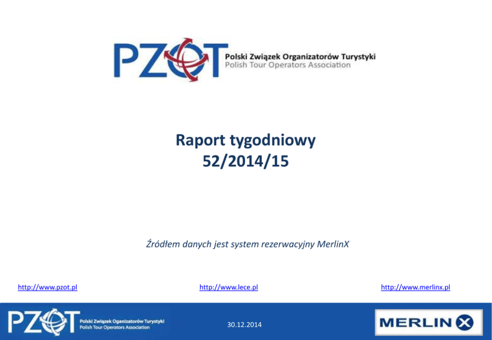 Raport tygodniowy 52/2014/15 Źródłem danych jest system rezerwacyjny MerlinX http://www.pzot.pl http://www.lece.pl 30.12.2014 http://www.merlinx.pl Ostatni tydzień – 52/2014, wyjazdy do 31.10.2015 w porównaniu z tygodniem 52 w 2013 r. -2,0% Book.+/-% Clients +/-% -29,9% -30,4% -7,0% -12,0% -17,0% -22,0% -27,0% -32,0% Układ dni świątecznych, wolnych od pracy sprawił, że biura podróży opustoszały. Spadki sprzedaży sięgnęły -30% 30.12.2014 Ostatni tydzień – 52/2014, wyjazdy do 31.10.2015 w porównaniu z tygodniem 52 w 2013 r. Clients +/-% Bus+hotel Own journey Shares % Flight Bus+hotel 5,4% -0,1% Own journey 8,6% -26,6% Flight 86,1% -32,7% Wszystkie rodzaje imprez zaliczyły tydzień na dużym minusie. Największe spadki dotyczyły imprez lotniczych -32,7% 30.12.2014 Lista przebojów 52-go tygodnia 2014 r. Lp. 1 2 3 4 5 6 7 8 9 10 11 12 13 14 15 16 17 18 19 20 Kierunek Hurgada Antalya Heraklion Marsa Alam Sharm El Sheikh Bodrum Rodos Korfu Kos Teneryfa Agadir Zakynthos Enfidha Fuerteventura Chania Paphos Dalaman Izmir Lanzarote Barcelona Cena/rez 6 203 8 770 7 727 5 998 5 763 7 160 7 368 7 866 8 302 7 966 5 138 7 843 6 746 7 791 8 138 5 640 8 364 9 392 7 115 6 421 Cena/osoba 2 347 2 899 2 868 2 424 2 385 2 676 2 730 2 825 2 733 3 317 2 414 2 779 2 333 3 141 3 056 2 250 2 930 3 110 3 070 2 693 30.12.2014 2 Lp. Kraj 1 3 Cena/rez. Cena/osoba 1 Grecja 7 519 2 749 2 Egipt 6 074 2 384 3 Turcja 8 018 2 774 4 Hiszpania 7 666 3 147 5 Włochy 5 060 2 081 6 Tunezja 6 395 2 279 7 Maroko 5 257 2 439 8 Bułgaria 5 515 2 012 9 Cypr 5 737 2 311 10 Portugalia 7 708 3 426 Średnia cena imprezy w roku turystycznym 2014/15 3 900 3 400 2 900 2 400 1 900 1 400 tydz 45 tydz 46 Antalya tydz 47 tydz 48 Heraklion tydz 49 Hurgada tydz 50 tydz 51 tydz 52 Teneryfa Wykres obrazuje zmianę średniej ceny imprezy za osobę w rezerwacjach założonych w ostatnich tygodniach, na przykładzie imprez turystycznych: Antalya, Heraklion, Hurgada i Teneryfa. 30.12.2014 Średnia cena rezerwacji i cena za osobę w 51. tygodniu 8 018 7 708 7 666 7 519 6 395 6 074 5 515 5 257 5 060 5 737 3 426 3 147 2 774 2 749 2 384 Grecja Egipt Turcja Hiszpania Włochy Cena/rez. 2 439 2 279 2 081 Tunezja Maroko Cena/osoba 30.12.2014 2 311 2 012 Bułgaria Cypr Portugalia Ostatnie 4 tygodnie sprzedaży oferty sezonu 2014/15 - klienci w porównaniu z 4-ma analogicznymi tygodniami w 2013/14 r. 15,0% 10,0% 9,8% 5,0% 1,9% 0,0% 49 -5,0% 50 -3,4% 51 52 -10,0% -15,0% -20,0% -25,0% -30,0% -30,4% -35,0% Wyraźnie widać jak świętowanie wpływa negatywnie na obroty biur podróży a przed nami kolejne dni wolne od pracy. 30.12.2014 Trend ostatnich 4-ech tygodni w sprzedaży w porównaniu z 4-ma analogicznymi tygodniami w 2013/14 r. Klienci +/- % 22,2% 25% 20% 15% 10% 5,4% 5% 0% Samolotem Bus + hotel Dojazd własny Razem -5% -5,1% -10% -7,9% Grudzień 2014 przyniósł spadek liczby nowych rezerwacji i liczby klientów rezerwujących Zimę i Lato 2015. 30.12.2014 Tygodniowa sprzedaż na tle poprzedniego roku turystycznego Rezerwacje wyjazdów 14/15 vs. 13/14 42 43 44 45 46 47 48 49 50 51 52 1 2 3 4 5 6 7 8 9 10 11 12 13 14 15 16 17 18 19 20 21 22 23 24 25 26 27 28 29 30 31 32 33 34 35 36 37 38 39 40 41 42 43 44 2014/15 30.12.2014 2013/14 Skumulowana sprzedaż 2014/15 w porównaniu ze sprzedażą 2013/14 w analogicznym okresie roku ubiegłego. Clients +/- % Bus+hotel 5,4% Shares % 26,3% Own journey 16,5% 9,2% 4,2% 1,9% Bus+hotel Own journey Flight Total Aktualny wzrost liczby klientów biur podróży na poziomie 4,2% 30.12.2014 Flight 78,0% Najpopularniejsze kraje i kierunki sezonu 2014/15 Rank 1 2 3 4 5 6 7 8 9 10 11 12 13 14 15 16 17 18 19 20 Country Egipt Grecja Hiszpania Turcja Włochy Tunezja Portugalia Maroko Bułgaria Austria Cypr Tajlandia Kuba Dominikana Tanzania Francja Chorwacja Niemcy Meksyk Czechy % PY 23,9% 4,2% -3,3% -5,0% 13,5% -20,6% -2,7% -37,8% -5,7% -15,4% 11,7% 173,8% ++ -9,1% ++ 24,3% -17,2% 63,4% ++ 5,3% Lp. 1 2 3 4 5 6 7 8 9 10 11 12 13 14 15 16 17 18 19 20 30.12.2014 Kierunek Hurgada Sharm El Sheikh Antalya Marsa Alam Teneryfa Fuerteventura Heraklion Bodrum Lanzarote Zakynthos Korfu Agadir Rodos Enfidha Kos Gran Canaria Funchal Paphos Dalaman Chania % 2014 45,9% 23,4% -22,3% 51,6% -9,1% -9,1% 27,4% 29,8% -9,6% 20,5% -9,1% -29,8% -19,8% 74,2% -0,4% 8,1% -7,0% 14,6% -9,3% -22,8% Szczegółowe raporty dostępne są dla członków PZOT Pytania dotyczące danych rynkowych proszę kierować do [email protected] Szczegółowe raporty dostępne są dla członków PZOT Pytania dotyczące danych rynkowych proszę kierować do [email protected] 30.12.2014