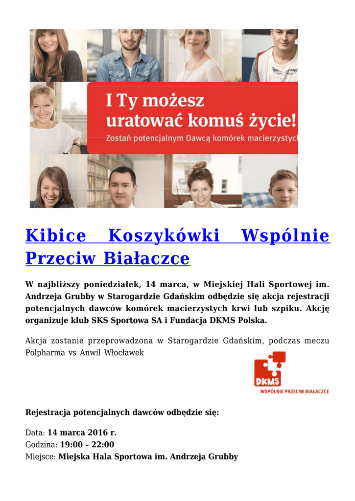 Kibice Koszykówki Przeciw Białaczce Wspólnie W najbliższy poniedziałek, 14 marca, w Miejskiej Hali Sportowej im. Andrzeja Grubby w Starogardzie Gdańskim odbędzie się akcja rejestracji potencjalnych dawców komórek macierzystych krwi lub szpiku. Akcję organizuje klub SKS Sportowa SA i Fundacja DKMS Polska. Akcja zostanie przeprowadzona w Starogardzie Gdańskim, podczas meczu Polpharma vs Anwil Włocławek Rejestracja potencjalnych dawców odbędzie się: Data: 14 marca 2016 r. Godzina: 19:00 – 22:00 Miejsce: Miejska Hala Sportowa im. Andrzeja Grubby Adres: ul. Olimpijczyków Starogardzkich 1, Starogard Gdański Kto może zostać dawcą? Zarejestrować może się każdy zdrowy człowiek pomiędzy 18 a 55 rokiem życia, ważący minimum 50 kg (bez dużej nadwagi). Zajmuje to tylko chwilę, polega na przeprowadzeniu wstępnego wywiadu medycznego, wypełnieniu formularza z danymi osobowymi oraz pobraniu wymazu z błony śluzowej z wewnętrznej strony policzka. Na podstawie pobranej próbki zostaną określone cechy zgodności antygenowej, a jeśli okaże się, że kod genetyczny dawcy zgadza się z kodem genetycznym chorego, wtedy dochodzi do przeszczepienia. Wszyscy, którzy chcą się zarejestrować, powinni mieć ze sobą dokument tożsamości z nr PESEL. Czy wiesz, że Twój 1% pomoże nam zarejestrować kolejnych potencjalnych dawców szpiku? Rejestracja dla dawców jest bezpłatna, ale jej koszt to 250 zł, które Fundacja DKMS Polska pokrywa dzięki wsparciu osób prywatnych lub firm. Ty również możesz dołożyć do tego przysłowiowa cegiełkę. Przekaż 1% swojego podatku na naszą działalność. Wpisz w swój formularz PIT nasz numer KRS: 0000318602 lub wypełnij go za pomocą programu dostępnego na naszej stronie: www.dkms.pl/pl/1procent. Każda, nawet najmniejsze wsparcie finansowe pozwoli nam pozyskać więcej potencjalnych Dawców. Wiedząc, że rejestracja w bazie jest bezpłatna, będziemy wdzięczni, jeśli pokryjesz choćby jej część przekazując darowiznę na konto o numerze: 86 1240 6292 1111 0010 4159 8437. Dziękujemy. Liczy się każde wsparcie. O Fundacji Fundacja DKMS Polska to aktualnie największa baza dawców szpiku w Polsce, w której zarejestrowanych jest i ponad 840 000 (styczeń 2016) potencjalnych dawców szpiku, a już 2 660 (styczeń 2016) osób oddało swoje komórki macierzyste lub szpik, dając szansę na życie pacjentom zarówno w Polsce, jak i na świecie. Statystyki Statystyki WMDA (Światowej Organizacji Dawców Szpiku) są alarmujące: co 35 sekund Ktoś na świecie zapada na raka krwi. Pośród chorób dziecięcych rak krwi jest najczęstszą przyczyną śmierci. W Polsce, co godzinę stawiana jest komuś diagnoza: białaczka, czyli nowotwór krwi. Dla wielu chorych jedyną szansą na wyzdrowienie jest przeszczepienie komórek macierzystych krwi lub szpiku. Jedynie 25 procent pacjentów ma szczęście znaleźć dawcę we własnej rodzinie. Większość przeszczepień odbywa się dzięki Dawcom niespokrewnionym, którzy jako ludzie dobrej woli zarejestrowali się, by bezinteresownie ratować życie każdego chorego, który potrzebuje przeszczepienia. Na świecie jest aktualnie zarejestrowanych ponad 25 milionów potencjalnych Dawców komórek macierzystych krwi lub szpiku. W tej liczbie 944.000 to Dawcy zarejestrowani w polskim rejestrze prowadzonym przez Poltransplant, w którym 840.000 to Dawcy z bazy Fundacji DKMS Polska. Jednak, mimo tylu zarejestrowanych potencjalnych Dawców, co piąty pacjent nie znajduje swojego bliźniaka genetycznego. Od 6 lat Fundacja DKMS Polska wraz z osobami zainteresowanymi propagowaniem idei dawstwa, organizuje w różnych miejscach Polski, Dni Dawców Szpiku. Akcje pod tym hasłem prowadzone są przez okrągły rok i zwiększają szansę na znalezienie Dawców dla każdego pacjenta potrzebującego przeszczepienia. Kontakt: Rafał Młodzikowski – Fundacja DKMS Baza Dawców Komórek Macierzystych Polska, [email protected], tel. Tel:. +48 22 882 95 57 Zapraszamy! I Ty możesz komuś uratować życie !