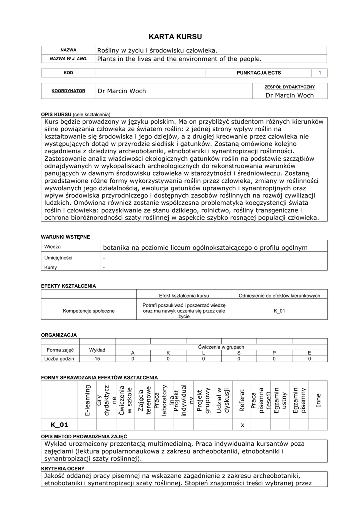 KARTA KURSU Rośliny w życiu i środowisku człowieka. Plants in the lives and the environment of the people. NAZWA NAZWA W J. ANG. PUNKTACJA ECTS KOD ZESPÓŁ DYDAKTYCZNY Dr Marcin Woch KOORDYNATOR 1 Dr Marcin Woch OPIS KURSU (cele kształcenia) Kurs będzie prowadzony w języku polskim. Ma on przybliżyć studentom różnych kierunków silne powiązania człowieka ze światem roślin: z jednej strony wpływ roślin na kształtowanie się środowiska i jego dziejów, a z drugiej kreowanie przez człowieka nie występujących dotąd w przyrodzie siedlisk i gatunków. Zostaną omówione kolejno zagadnienia z dziedziny archeobotaniki, etnobotaniki i synantropizacji roślinności. Zastosowanie analiz właściwości ekologicznych gatunków roślin na podstawie szczątków odnajdywanych w wykopaliskach archeologicznych do rekonstruowania warunków panujących w dawnym środowisku człowieka w starożytności i średniowieczu. Zostaną przedstawione różne formy wykorzystywania roślin przez człowieka, zmiany w roślinności wywołanych jego działalnością, ewolucja gatunków uprawnych i synantropijnych oraz wpływ środowiska przyrodniczego i dostępnych zasobów roślinnych na rozwój cywilizacji ludzkich. Omówiona również zostanie współczesna problematyka koegzystencji świata roślin i człowieka: pozyskiwanie ze stanu dzikiego, rolnictwo, rośliny transgeniczne i ochrona bioróżnorodności szaty roślinnej w aspekcie szybko rosnącej populacji człowieka. WARUNKI WSTĘPNE Wiedza botanika na poziomie liceum ogólnokształcącego o profilu ogólnym Umiejętności - Kursy - EFEKTY KSZTAŁCENIA Kompetencje społeczne Efekt kształcenia kursu Odniesienie do efektów kierunkowych Potrafi poszukiwać i poszerzać wiedzę oraz ma nawyk uczenia się przez całe życie K_01 ORGANIZACJA Forma zajęć Wykład Liczba godzin 15 A 0 K 0 Ćwiczenia w grupach L S 0 0 P 0 E 0 K_01 x OPIS METOD PROWADZENIA ZAJĘĆ Wykład urozmaicony prezentacją multimedialną. Praca indywidualna kursantów poza zajęciami (lektura popularnonaukowa z zakresu archeobotaniki, etnobotaniki i synantropizacji szaty roślinnej). KRYTERIA OCENY Jakość oddanej pracy pisemnej na wskazane zagadnienie z zakresu archeobotaniki, etnobotaniki i synantropizacji szaty roślinnej. Stopień znajomości treści wybranej przez Inne Egzamin pisemny Praca pisemna (esej) Egzamin ustny Referat Udział w dyskusji Zajęcia terenowe Praca laboratory jna Projekt indywidual ny Projekt grupowy Gry dydaktycz ne Ćwiczenia w szkole E-learning FORMY SPRAWDZANIA EFEKTÓW KSZTAŁCENIA uczestników książki popularnonaukowej. Obecność na zajęciach. UWAGI - TREŚCI MERYTORYCZNE (wykaz tematów) 1. Przedmiot, historia i zadania archeobotaniki. 2. Szczątki roślin jako materiał źródłowy w archeobotanice. 3. Rodzaj stanowiska archeologicznego a typ materiału roślinnego. 4. Datowanie szczątków roślinnych zachowanych na stanowiskach archeologicznych. 5. Zarys historii wybranych roślin upranych i synantropijnych. 6. Metody badań terenowych i laboratoryjnych: zbieranie materiału, laboratoryjne analizy karpologiczne i pyłkowe, rozpoznawanie organów spichrzowych roślin jako źródło pożywienia, zastosowanie analizy fitolitów, okrzemek i ziaren skrobii. 7. Interpretacja wyników badań archeobotanicznych: rekonstrukcja zbiorowisk roślinnych, rekonstrukcja procesów gospodarczych na podstawach botanicznych. 8. Znaczenie wyników badań archeobotanicznych dla innych dyscyplin naukowych. 9. Przedmiot, historia i zadania etnobotaniki. 10. Użytkowanie roślin leczniczych. 11. Użytkowanie roślin pokarmowych. 12. Użytkowanie roślin włókienniczych. 13. Użytkowanie roślin barwierskich. 14. Użytkowanie roślin obrzędowych i halucynogennych. 15. Dokumentowanie zapomnianego lub rzadko spotykanego użytkowania roślin i sposobów uprawy, tzw. roślin głodowych, a także wiedzy o roślinach we współczesnych społeczeństwach. 16. Dynamika występowania gatunków synantropijnych – migracje historyczne i współczesne 17. Miasto jako szczególny układ siedlisk antropogenicznych i biocenoz synantropijnych 18. Problem roślin inwazyjnych i transgenicznych. 19. Specyfika florystyczna wybranych siedlisk antropogenicznych: siedliska ruderalne, rośliny szczelin murów, dachów, schodów, płyt chodnikowych i asfaltu, rośliny hałd pogórniczych i poprzemysłowych, rośliny wydepczysk, przydroży, poboczy ulic i autostrad, rośliny torowisk kolejowych i tramwajowych, rośliny wysypisk śmieci, rośliny portów, dworców, otoczenia elewatorów i młynów, upraw zbożowych i okopowych, chwasty upraw roślin pastewnych i przemysłowych, relikty dawnych upraw, rośliny rodzime i obce uprawiane współcześnie i dziczejące. 20. Klasyfikacja zbiorowisk synantropijnych i wybranych zbiorowisk półnaturalnych. 21. Problematyka wyżywienia rosnącej populacji ludzkiej i zachowania bioróżnorodności w krajobrazie kulturowym. WYKAZ LITERATURY PODSTAWOWEJ Lityńska-Zając M., Wasylikowa K. 2005. Przewodnik do badań archeobotanicznych. Vademecum Geobotanicum J. B. Faliński (red. serii). Sorus. Poznań. ss. 563. Łuczaj Ł. 2011. Dziko rosnące rośliny jadalne użytkowane w Polsce od połowy XIX w. do czasów współczesnych. Etnobiologia Polska, 1: 57-125. Sudnik-Wójcikowska B. 2011. Flora Polski. Rośliny synantropijne. Multico. Oficyna Wydawnicza, Warszawa. WYKAZ LITERATURY UZUPEŁNIAJĄCEJ Lityńska-Zając M. 2005. Chwasty w uprawach roślinnych w pradziejach i wczesnym średniowieczu. Instytut Archeologii i Etnologii PAN. ss. 444. Łuczaj Ł. 2013 Dzika kuchnia Łukasza Łuczaj [Łukasz Łuczaj's Wild Cuisine]- Nasza Księgarnia, Warszawa, 320 pp. Łuczaj Ł. 2010 W dziką stronę [Into the Wild Side, in Polish]- Krośnieńska Oficyna Wydawnicza, Krosno, 187 pp. Łuczaj Ł. 2002 Dzikie rośliny jadalne Polski. Przewodnik survivalowy. [Wild Edible Plants of Poland, in Polish]- Chemigrafia, Krosno, 236 pp. Mueller-Bieniek A. (red.). Roślin