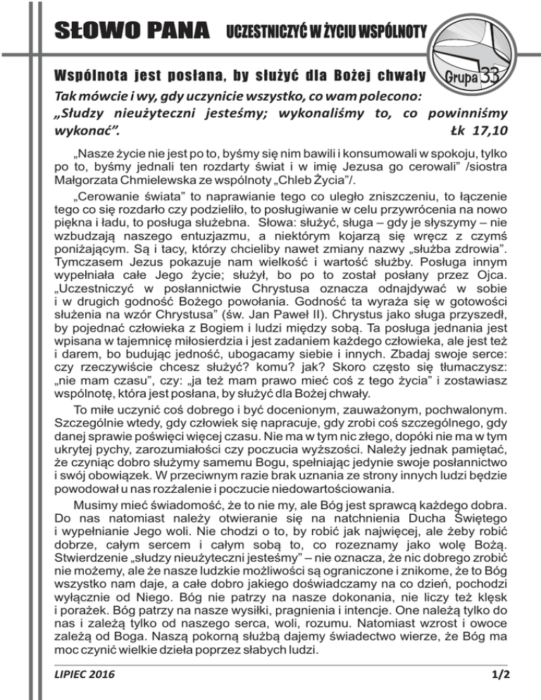 SŁOWO PANA UCZESTNICZYĆ W ŻYCIU WSPÓLNOTY Wspólnota jest posłana, by służyć dla Bożej chwały Tak mówcie i wy, gdy uczynicie wszystko, co wam polecono: „Słudzy nieużyteczni jesteśmy; wykonaliśmy to, co powinniśmy wykonać”. Łk 17,10 „Nasze życie nie jest po to, byśmy się nim bawili i konsumowali w spokoju, tylko po to, byśmy jednali ten rozdarty świat i w imię Jezusa go cerowali” /siostra Małgorzata Chmielewska ze wspólnoty „Chleb Życia”/. „Cerowanie świata” to naprawianie tego co uległo zniszczeniu, to łączenie tego co się rozdarło czy podzieliło, to posługiwanie w celu przywrócenia na nowo piękna i ładu, to posługa służebna. Słowa: służyć, sługa – gdy je słyszymy – nie wzbudzają naszego entuzjazmu, a niektórym kojarzą się wręcz z czymś poniżającym. Są i tacy, którzy chcieliby nawet zmiany nazwy „służba zdrowia”. Tymczasem Jezus pokazuje nam wielkość i wartość służby. Posługa innym wypełniała całe Jego życie; służył, bo po to został posłany przez Ojca. „Uczestniczyć w posłannictwie Chrystusa oznacza odnajdywać w sobie i w drugich godność Bożego powołania. Godność ta wyraża się w gotowości służenia na wzór Chrystusa” (św. Jan Paweł II). Chrystus jako sługa przyszedł, by pojednać człowieka z Bogiem i ludzi między sobą. Ta posługa jednania jest wpisana w tajemnicę miłosierdzia i jest zadaniem każdego człowieka, ale jest też i darem, bo budując jedność, ubogacamy siebie i innych. Zbadaj swoje serce: czy rzeczywiście chcesz służyć? komu? jak? Skoro często się tłumaczysz: „nie mam czasu”, czy: „ja też mam prawo mieć coś z tego życia” i zostawiasz wspólnotę, która jest posłana, by służyć dla Bożej chwały. To miłe uczynić coś dobrego i być docenionym, zauważonym, pochwalonym. Szczególnie wtedy, gdy człowiek się napracuje, gdy zrobi coś szczególnego, gdy danej sprawie poświęci więcej czasu. Nie ma w tym nic złego, dopóki nie ma w tym ukrytej pychy, zarozumiałości czy poczucia wyższości. Należy jednak pamiętać, że czyniąc dobro służymy samemu Bogu, spełniając jedynie swoje posłannictwo i swój obowiązek. W przeciwnym razie brak uznania ze strony innych ludzi będzie powodował u nas rozżalenie i poczucie niedowartościowania. Musimy mieć świadomość, że to nie my, ale Bóg jest sprawcą każdego dobra. Do nas natomiast należy otwieranie się na natchnienia Ducha Świętego i wypełnianie Jego woli. Nie chodzi o to, by robić jak najwięcej, ale żeby robić dobrze, całym sercem i całym sobą to, co rozeznamy jako wolę Bożą. Stwierdzenie „słudzy nieużyteczni jesteśmy” – nie oznacza, że nic dobrego zrobić nie możemy, ale że nasze ludzkie możliwości są ograniczone i znikome, że to Bóg wszystko nam daje, a całe dobro jakiego doświadczamy na co dzień, pochodzi wyłącznie od Niego. Bóg nie patrzy na nasze dokonania, nie liczy też klęsk i porażek. Bóg patrzy na nasze wysiłki, pragnienia i intencje. One należą tylko do nas i zależą tylko od naszego serca, woli, rozumu. Natomiast wzrost i owoce zależą od Boga. Naszą pokorną służbą dajemy świadectwo wierze, że Bóg ma moc czynić wielkie dzieła poprzez słabych ludzi. LIPIEC 2016 1/2 SŁOWO PANA UCZESTNICZYĆ W ŻYCIU WSPÓLNOTY Tak mówcie i wy, gdy uczynicie wszystko, co wam polecono: „Słudzy nieużyteczni jesteśmy; wykonaliśmy to, co powinniśmy wykonać”. Łk 17,10 Jak żyć tym słowem? Greckie słowo „diakonia” oznacza nieodpłatną służbę. Służba ta może odbywać się na różne sposoby, może to być np. modlitwa, opieka nad chorymi, pomoc ubogim. Bóg włożył w nasze serca pewne zainteresowania, pasje, pragnienia i marzenia. To właśnie może stanowić pewną wskazówkę, w jaki sposób powinienem służyć. Dlatego nie należy lekceważyć swoich zainteresowań, ale zastanowić się, jak mogę ich użyć dla Bożej chwały. Każdy rodzaj posługi znajduje swoje wyjaśnienie tylko w świetle czystej intencji serca – dla Boga. Nasza postawa wobec Boga i wobec bliźniego powinna przyjąć postawę sługi, który nie oczekuje zapłaty, ale pragnie swoimi czynami i poświęceniem uwielbiać Boga. Kościół jako wspólnota powinien być budowany nie na doskonałym współgraniu jej członków, ale na Chrystusie, który często domaga się otwarcia na ludzi wykluczonych. S. Małgorzata Chmielewska mówi, że „VIP-em we wspólnocie chrześcijańskiej jest najsłabszy. Chory, stary, bezdomny, chory psychicznie, ubogi i trędowaty - bo z nim przede wszystkim identyfikuje się Chrystus, gdyż taki człowiek jest niejako przykładem bólu i rozdarcia świata, które wziął na siebie nasz Pan”. Jakże trudno służyć w pojedynkę, samemu, a często tak właśnie bywa. Kończy się przyjęcie, zabawa, spotkanie, wszyscy odchodzą, a ty sprzątasz, zmywasz, wycierasz. A ileż razy stajemy wobec sytuacji gdy trzeba podjąć trudną decyzję, coś przygotować, coś zorganizować. W takich chwilach wsparcie wspólnoty jest błogosławieństwem. Dobra rada, czy zdolności innych, konkretna pomoc czy też tylko obecność są szczególnym wsparciem. Nawet najmniejsze zadanie możemy wykonać razem i wtedy upodabniamy się do samego Boga, bowiem wszystko co czyni Ojciec czyni i Syn (por. J 5, 19-20): są i działają RAZEM w Duchu Świętym. To doskonała wspólnota miłości, którą mamy wielbić i naśladować. Świadectwo Nasza mała Grupa istnieje już 10 lat. Z perspektywy minionego czasu możemy stwierdzić, że na początku byliśmy ludźmi zamkniętymi, nieufnymi, bardziej nastawionymi na to, aby brać niż dawać. Stopniowo, dzięki Bożej łasce i byciu we wspólnocie zaczęliśmy się otwierać na potrzeby innych. Znalazło to wyraz w różnorakich posługach, takich jak: przygotowanie liturgii, praca nad Słowem Pana, udział w przygotowaniu jasełek, zbiórki w ramach „Banku żywno