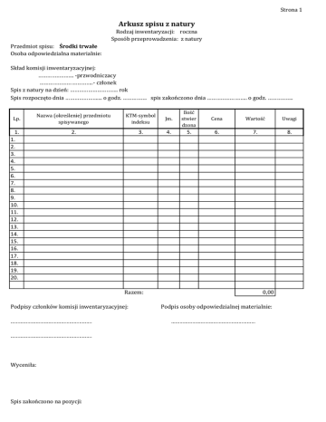 Strona 1 Arkusz spisu z natury Przedmiot spisu: Środki trwałe Osoba odpowiedzialna materialnie: Rodzaj inwentaryzacji: roczna Sposób przeprowadzenia: z natury Skład komisji inwentaryzacyjnej: …………………... -przwodniczacy ……………………………...- członek Spis z natury na dzień: ………………………….. rok Spis rozpoczęto dnia ………………….... o godz. ……………. spis zakończono dnia ……………………... o godz. …………….. Lp. 1. 1. 2. 3. 4. 5. 6. 7. 8. 9. 10. 11. 12. 13. 14. 15. 16. 17. 18. 19. 20. Nazwa (określenie) przedmiotu spisywanego 2. KTM-symbol indeksu 3. Razem: Podpisy członków komisji inwentaryzacyjnej: …………………………………………………. …………………………………………………. Wyceniła: Spis zakończono na pozycji: Jm. 4. Ilość stwier dzona 5. Cena 6. Wartość 7. 0,00 Podpis osoby odpowiedzialnej materialnie: …………………………………………………… Uwagi 8.