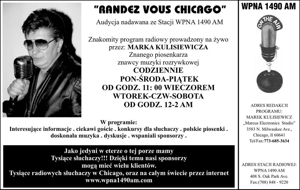 ”RANDEZ VOUS CHICAGO” WPNA 1490 AM Audycja nadawana ze Stacji WPNA 1490 AM Znakomity program radiowy prowadzony na ¿ywo przez: MARKA KULISIEWICZA Znanego piosenkarza znawcy muzyki rozrywkowej CODZIENNIE PON-ŒRODA-PI¥TEK OD GODZ. 11: 00 WIECZOREM WTOREK-CZW-SOBOTA OD GODZ. 12-2 AM W programie: Interesuj¹ce informacje . ciekawi goœcie . konkursy dla s³uchaczy . polskie piosenki . doskona³a muzyka . dyskusje . wspaniali sponsorzy . Jako jedyni w eterze o tej porze mamy Tysi¹ce s³uchaczy!!! Dziêki temu nasi sponsorzy mog¹ mieæ wielu klientów. Tysi¹ce radiowych s³uchaczy w Chicago, oraz na ca³ym œwiecie przez internet www.wpna1490am.com ADRES REDAKCJI PROGRAMU: MAREK KULISIEWICZ „Marcus Electronics Studio” 3583 N. Milwaukee Ave., Chicago, Il 60641 Tel/Fax:773-685-3634 ADRES STACJI RADIOWEJ: WPNA 1490 AM 408 S. Oak Park Ave. Fax:(708) 848 - 9220