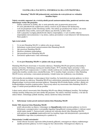 ULOTKA DLA PACJENTA: INFORMACJA DLA UŻYTKOWNIKA Humalog® Mix50 100 jednostek/ml, zawiesina do wstrzykiwań we wkładzie insulina lizpro Należy uważnie zapoznać się z treścią ulotki przed zastosowaniem leku, ponieważ zawiera ona informacje ważne dla pacjenta. Należy zachować tę ulotkę, aby w razie potrzeby móc ją ponownie przeczytać. W razie jakichkolwiek wątpliwości należy zwrócić się do lekarza lub farmaceuty. Lek ten przepisano ściśle określonej osobie. Nie należy go przekazywać innym. Lek może zaszkodzić innej osobie, nawet jeśli objawy jej choroby są takie same. Jeśli u pacjenta wystąpią jakiekolwiek objawy niepożądane, w tym wszelkie objawy niepożądane niewymienione w tej ulotce, należy powiedzieć o tym lekarzowi lub farmaceucie. Patrz punkt 4. Spis treści ulotki 1. 2. 3. 4. 5. 6. Co to jest Humalog Mix50 i w jakim celu się go stosuje Informacje ważne przed zastosowaniem leku Humalog Mix50 Jak stosować Humalog Mix50 Możliwe działania niepożądane Jak przechowywać Humalog Mix50 Zawartość opakowania i inne informacje 1. Co to jest Humalog Mix50 i w jakim celu się go stosuje Humalog Mix50 jest stosowany w leczeniu cukrzycy. Humalog Mix50 jest gotową mieszanką w postaci zawiesiny. Substancją czynną jest insulina lizpro. 50 % insuliny lizpro zawartej w leku Humalog Mix50 jest rozpuszczone w wodzie i działa szybciej niż zwykła insulina ludzka, ponieważ cząsteczka insuliny została nieco zmodyfikowana. 50 % insuliny lizpro zawartej w leku Humalog Mix50 tworzy zawiesinę z siarczanem protaminy i dzięki temu ma wydłużony czas działania. Jeśli trzustka nie produkuje wystarczającej ilości insuliny, by kontrolować poziom glukozy we krwi, człowiek choruje na cukrzycę. Humalog Mix50 jest substytutem naturalnej insuliny stosowanym do długotrwałego wyrównywania poziomu glukozy. Humalog Mix50 działa bardzo szybko i dłużej niż krótkodziałająca insulina rozpuszczalna. Zazwyczaj zaleca się stosowanie leku Humalog Mix50 w ciągu 15 minut przed posiłkiem lub po posiłku. Lekarz może zalecić stosowanie leku Humalog Mix50 oraz dłużej działającej insuliny. Do każdego rodzaju insuliny dołączona jest inna ulotka dla pacjenta. Nie należy zmieniać insuliny, o ile tak nie zaleca lekarz. Zmieniając jednak insulinę, należy zachować dużą ostrożność. 2. Informacje ważne przed zastosowaniem leku Humalog Mix50 Kiedy NIE stosować leku Humalog Mix50 jeżeli odczuwalne są objawy wskazujące na hipoglikemię (niski poziom glukozy we krwi). Informacje o postępowaniu w przypadku łagodnej hipoglikemii zostaną podane w dalszej części ulotki (patrz punkt 3: Zastosowanie większej niż zalecana dawki leku Humalog Mix50). jeśli pacjent ma uczulenie (nadwrażliwość) na insulinę lizpro lub którykolwiek z pozostałych składników tego leku (wymienionych w punkcie 6). Ostrzeżenia i środki ostrożności • Jeżeli obecne leczenie zapewnia dobrą kontrolę glikemii, ostrzegawcze objawy nadmiernego spadku poziomu glukozy we krwi mogą nie być odczuwalne. Ostrzegawcze objawy są 1 • • • • • wymienione w dalszej części ulotki. Należy zaplanować dokładnie pory posiłków, częstość podejmowania aktywności fizycznej i ogólny poziom aktywności. Należy także często kontrolować stężenie glukozy we krwi wykonując badanie poziomu glukozy. Niektóre osoby, u których po zmianie rodzaju insuliny ze zwierzęcej na ludzką występowała hipoglikemia, zgłaszały że objawy zapowiadające hipoglikemię były słabiej zaznaczone lub zupełnie inne niż wcześniej. Jeżeli hipoglikemia pojawia się często lub występują trudności z rozpoznaniem objawów zapowiadających hipoglikemię, należy skonsultować się z lekarzem. Należy poinformować lekarza prowadzącego, farmaceutę lub pielęgniarkę z poradni cukrzycowej w razie: ostatnio przebytej choroby; choroby wątroby lub nerek; zwiększonego wysiłku fizycznego. Zapotrzebowanie na insulinę może także zmieniać się pod wpływem alkoholu. Należy powiedzieć lekarzowi, farmaceucie lub pielęgniarce z poradni cukrzycowej o planowanym wyjeździe za granicę. Różnica stref czasowych może wiązać się z koniecznością wykonywania wstrzykiwań i spożywania posiłków o innej porze. U części pacjentów długotrwale leczonych z powodu cukrzycy typu 2., u których występuje choroba serca lub w przeszłości wystąpił udar, zgłaszano przypadki niewydolności serca po jednoczesnym stosowaniu pioglitazonu i insuliny. Należy jak najszybciej poinformować lekarza, jeżeli wystąpią objawy niewydolności serca takie jak zadyszka, nagłe zwiększenie masy ciała lub miejscowy obrzęk. Humalog Mix50 a inne leki Zapotrzebowanie organizmu na insulinę może zmienić się pod wpływem • doustnych środków antykoncepcyjnych, • kortykosteroidów, • leczenia substytucyjnego hormonami tarczycy, • doustnych leków obniżających stężenie glukozy we krwi, • kwasu acetylosalicylowego, • sulfonamidów, • oktreotydu, • selektywnych agonistów receptora beta2-adrenergicznego (np. ritodryny, salbutamolu, terbutaliny), • beta-adrenolityków, • niektórych leków przeciwdepresyjnych (inhibitorów monoaminooksydazy lub selektywnych inhibitorów wychwytu zwrotnego serotoniny), • danazolu, • niektórych inhibitorów konwertazy angiotensyny (np. kaptoprylu, enalaprylu) i • antagonistów receptora angiotensyny II. Należy powiedzieć lekarzowi o wszystkich lekach przyjmowanych przez pacjenta obecnie lub ostatnio, również tych, które wydawane są bez recepty (patrz punkt „Ostrzeżenia i środki ostrożności”). Ciąża i karmienie piersią Jeżeli pacjentka jest w ciąży, planuje ciążę lub karmi piersią: zapotrzebowanie organizmu na insulinę zwykle zmniejsza się w pierwszych trzech miesiącach ciąży i wzrasta przez następne 6 miesięcy. U kobiet karmiących piersią może być konieczna zmiana dawki insuliny lub sposobu odży