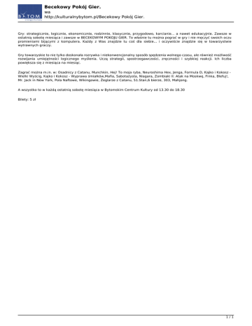 Becekowy Pokój Gier. wa http://kulturalnybytom.pl/Becekowy Pokój Gier. Gry: strategicznie, logicznie, ekonomicznie, rodzinnie, klasycznie, przygodowo, karcianie... a nawet edukacyjnie. Zawsze w ostatnią sobotę miesiąca i zawsze w BECEKOWYM POKOJU GIER. To właśnie tu można pograć w gry i nie męczyć swoich oczu promieniami bijącymi z komputera. Każdy z Was znajdzie tu coś dla siebie... i oczywiście znajdzie się w towarzystwie wytrawnych graczy. Gry towarzyskie to nie tylko doskonała rozrywka i niekonwencjonalny sposób spędzenia wolnego czasu, ale również możliwość rozwijania umiejętności logicznego myślenia. Uczą strategii, spostrzegawczości, zręczności i szybkiej reakcji. Ich liczba powiększa się z miesiąca na miesiąc. Zagrać można m.in. w: Osadnicy z Catanu, Munchkin, Hej! To moja ryba, Neuroshima Hex, Jenga, Formula D, Kajko i Kokosz Wielki Wyścig, Kajko i Kokosz - Wyprawa śmiałków,Mafia, Sabotażysta, Niagara, Zombiaki II: Atak na Moskwę, Finka, Blefuj!, Mr. Jack in New York, Pola Naftowe, Wikingowie, Żeglarze z Catanu, 51.Stan,6 bierze, 303, Mahjong. A wszystko to w każdą ostatnią sobotę miesiąca w Bytomskim Centrum Kultury od 13.30 do 18.30 Bilety: 5 zł 1/1 Powered by TCPDF (www.tcpdf.org)