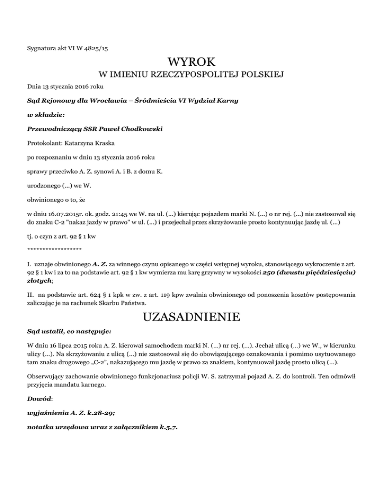 Sygnatura akt VI W 4825/15 WYROK W IMIENIU RZECZYPOSPOLITEJ POLSKIEJ Dnia 13 stycznia 2016 roku Sąd Rejonowy dla Wrocławia – Śródmieścia VI Wydział Karny w składzie: Przewodniczący SSR Paweł Chodkowski Protokolant: Katarzyna Kraska po rozpoznaniu w dniu 13 stycznia 2016 roku sprawy przeciwko A. Z. synowi A. i B. z domu K. urodzonego (...) we W. obwinionego o to, że w dniu 16.07.2015r. ok. godz. 21:45 we W. na ul. (...) kierując pojazdem marki N. (...) o nr rej. (...) nie zastosował się do znaku C-2 "nakaz jazdy w prawo" w ul. (...) i przejechał przez skrzyżowanie prosto kontynuując jazdę ul. (...) tj. o czyn z art. 92 § 1 kw ****************** I. uznaje obwinionego A. Z. za winnego czynu opisanego w części wstępnej wyroku, stanowiącego wykroczenie z art. 92 § 1 kw i za to na podstawie art. 92 § 1 kw wymierza mu karę grzywny w wysokości 250 (dwustu pięćdziesięciu) złotych; II. na podstawie art. 624 § 1 kpk w zw. z art. 119 kpw zwalnia obwinionego od ponoszenia kosztów postępowania zaliczając je na rachunek Skarbu Państwa. UZASADNIENIE Sąd ustalił, co następuje: W dniu 16 lipca 2015 roku A. Z. kierował samochodem marki N. (...) nr rej. (...). Jechał ulicą (...) we W., w kierunku ulicy (...). Na skrzyżowaniu z ulicą (...) nie zastosował się do obowiązującego oznakowania i pomimo usytuowanego tam znaku drogowego „C-2”, nakazującego mu jazdę w prawo za znakiem, kontynuował jazdę prosto ulicą (...). Obserwujący zachowanie obwinionego funkcjonariusz policji W. S. zatrzymał pojazd A. Z. do kontroli. Ten odmówił przyjęcia mandatu karnego. Dowód: wyjaśnienia A. Z. k.28-29; notatka urzędowa wraz z załącznikiem k.5,7. A. Z. w złożonych w toku postępowania jurysdykcyjnego w złożonych wyjaśnieniach potwierdził okoliczności zdarzenia drogowego wskazując na fakty zgodne z ustalonym stanem faktycznym. Sąd dał wiarę wyjaśnieniom obwinionego, brak bowiem okoliczności, które mogłyby negatywnie wpłynąć na ocenę tego dowodu. A. Z. szczegółowo opisał sposób poruszania się samochodem na ulicy (...) potwierdzając fakt kontynuowania jazdy na wprost, pomimo oznakowania nakazującego mu wykonanie skrętu w prawo (za znakiem). Okoliczność ta stanowiła bezpośrednią przyczynę zatrzymania jego samochodu do kontroli drogowej przez funkcjonariuszy Wydziału Ruchu Drogowego, co znalazło swoje odzwierciedlenie w treści sporządzonej przez nich notatki urzędowej. Powołane dowody nie zawierają zatem żadnej sprzeczności i tworzą jednolitą całość uzasadniającą przypisanie A. Z. popełnienia wykroczenia z art. 92§1 kw. Nagminność tego rodzaju wykroczeń na obszarze miasta, miejsce i czas jego popełnienia, to okoliczności które Sąd miał na względzie wymierzając A. Z. karę grzywny. Kara ta nie jest nadmiernie surowa, a jednocześnie w pełni adekwatna do stopnia winy oraz społecznej szkodliwości przedmiotowego czynu, uwzględnia jego sytuację materialną i pozwoli na osiągnięcie celu kary w zakresie wychowawczego oddziaływania na obwinionego. Uzmysłowi również obwinionemu karygodność jego zachowania. Uwzględniono ponadto społeczne oddziaływanie oraz cele zapobiegawcze orzeczonej kary, które mają stanowić adekwatną względem popełnionego czynu represję wobec sprawcy oraz piętnować w oczach społeczeństwa zachowanie, którego obwiniony się dopuścił. Sąd wyraża jednocześnie przekonanie, iż orzeczona kara spełni swoje zadania w zakresie prewencji szczególnej i pomoże zrozumieć A. Z. niewłaściwość jego zachowania. Wobec faktu, że obwiniony uiścił już, pomimo nieprawomocności orzeczenia zapadłego w dniu 23 października 2015 roku, kwotę z niego wynikającą (180 złotych), zostanie ona zaliczona mu na poczet wymierzonej grzywny (250 złotych). Obwiniony zostanie zatem wezwany do zapłacenia 70 złotych. Orzeczenie o kosztach postępowania oparto o przepis art. 118§ 2 k.p.w. i przepis art. 616§2 k.p.k. w zw. z art. 119 k.p.w.