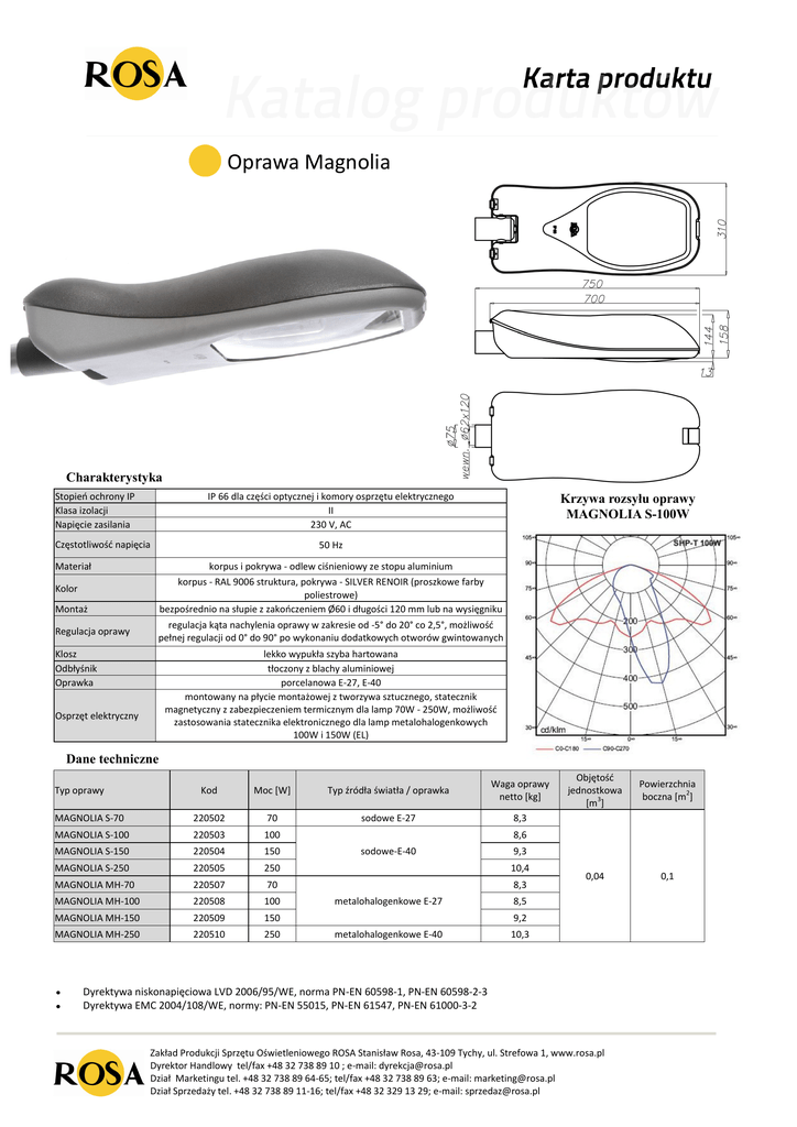 Oprawa Magnolia Charakterystyka Stopieo ochrony IP Klasa izolacji Napięcie zasilania Częstotliwośd napięcia 50 Hz Materiał korpus i pokrywa - odlew ciśnieniowy ze stopu aluminium korpus - RAL 9006 struktura, pokrywa - SILVER RENOIR (proszkowe farby poliestrowe) bezpośrednio na słupie z zakooczeniem Ø60 i długości 120 mm lub na wysięgniku Kolor Montaż Regulacja oprawy Krzywa rozsyłu oprawy MAGNOLIA S-100W IP 66 dla części optycznej i komory osprzętu elektrycznego II 230 V, AC regulacja kąta nachylenia oprawy w zakresie od -5° do 20° co 2,5°, możliwośd pełnej regulacji od 0° do 90° po wykonaniu dodatkowych otworów gwintowanych Klosz Odbłyśnik Oprawka lekko wypukła szyba hartowana tłoczony z blachy aluminiowej porcelanowa E-27, E-40 montowany na płycie montażowej z tworzywa sztucznego, statecznik magnetyczny z zabezpieczeniem termicznym dla lamp 70W - 250W, możliwośd zastosowania statecznika elektronicznego dla lamp metalohalogenkowych 100W i 150W (EL) Osprzęt elektryczny Dane techniczne Kod Moc [W] Typ źródła światła / oprawka Waga oprawy netto [kg] MAGNOLIA S-70 220502 70 sodowe E-27 8,3 MAGNOLIA S-100 220503 100 MAGNOLIA S-150 220504 150 MAGNOLIA S-250 220505 250 10,4 MAGNOLIA MH-70 220507 70 8,3 MAGNOLIA MH-100 220508 100 MAGNOLIA MH-150 220509 150 MAGNOLIA MH-250 220510 250 Typ oprawy Objętośd jednostkowa [m3] Powierzchnia boczna [m2] 0,04 0,1 8,6 sodowe-E-40 metalohalogenkowe E-27 9,3 8,5 9,2 metalohalogenkowe E-40 10,3 Dyrektywa niskonapięciowa LVD 2006/95/WE, norma PN-EN 60598-1, PN-EN 60598-2-3 Dyrektywa EMC 2004/108/WE, normy: PN-EN 55015, PN-EN 61547, PN-EN 61000-3-2 Zakład Produkcji Sprzętu Oświetleniowego ROSA Stanisław Rosa, 43-109 Tychy, ul. Strefowa 1, www.rosa.pl Dyrektor Handlowy tel/fax +48 32 738 89 10 ; e-mail: [email protected] Dział Marketingu tel. +48 32 738 89 64-65; tel/fax +48 32 738 89 63; e-mail: [email protected] Dział Sprzedaży tel. +48 32 738 89 11-16; tel/fax +48 32 329 13 29; e-mail: [email protected]