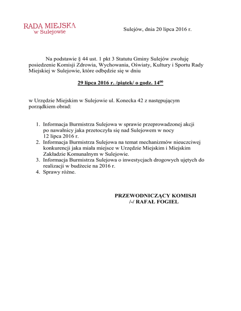 Sulejów, dnia 20 lipca 2016 r. Na podstawie § 44 ust. 1 pkt 3 Statutu Gminy Sulejów zwołuję posiedzenie Komisji Zdrowia, Wychowania, Oświaty, Kultury i Sportu Rady Miejskiej w Sulejowie, które odbędzie się w dniu 29 lipca 2016 r. /piątek/ o godz. 1400 w Urzędzie Miejskim w Sulejowie ul. Konecka 42 z następującym porządkiem obrad: 1. Informacja Burmistrza Sulejowa w sprawie przeprowadzonej akcji po nawałnicy jaka przetoczyła się nad Sulejowem w nocy 12 lipca 2016 r. 2. Informacja Burmistrza Sulejowa na temat mechanizmów nieuczciwej konkurencji jaka miała miejsce w Urzędzie Miejskim i Miejskim Zakładzie Komunalnym w Sulejowie. 3. Informacja Burmistrza Sulejowa o inwestycjach drogowych ujętych do realizacji w budżecie na 2016 r. 4. Sprawy różne. PRZEWODNICZĄCY KOMISJI /-/ RAFAŁ FOGIEL