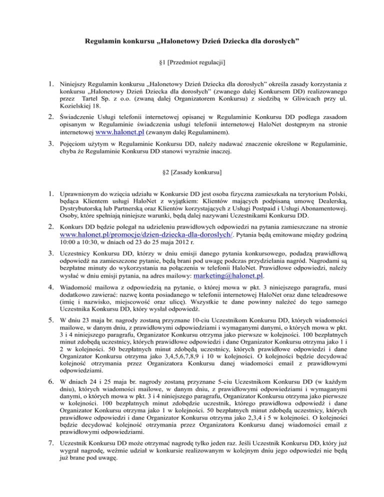 Regulamin konkursu „Halonetowy Dzień Dziecka dla dorosłych” §1 [Przedmiot regulacji] 1. Niniejszy Regulamin konkursu „Halonetowy Dzień Dziecka dla dorosłych” określa zasady korzystania z konkursu „Halonetowy Dzień Dziecka dla dorosłych” (zwanego dalej Konkursem DD) realizowanego przez Tartel Sp. z o.o. (zwaną dalej Organizatorem Konkursu) z siedzibą w Gliwicach przy ul. Kozielskiej 18. 2. Świadczenie Usługi telefonii internetowej opisanej w Regulaminie Konkursu DD podlega zasadom opisanym w Regulaminie świadczenia usługi telefonii internetowej HaloNet dostępnym na stronie internetowej www.halonet.pl (zwanym dalej Regulaminem). 3. Pojęciom użytym w Regulaminie Konkursu DD, należy nadawać znaczenie określone w Regulaminie, chyba że Regulaminie Konkursu DD stanowi wyraźnie inaczej. §2 [Zasady konkursu] 1. Uprawnionym do wzięcia udziału w Konkursie DD jest osoba fizyczna zamieszkała na terytorium Polski, będąca Klientem usługi HaloNet z wyjątkiem: Klientów mających podpisaną umowę Dealerską, Dystrybutorską lub Partnerską oraz Klientów korzystających z Usługi Postpaid i Usługi Abonamentowej. Osoby, które spełniają niniejsze warunki, będą dalej nazywani Uczestnikami Konkursu DD. 2. Konkurs DD będzie polegał na udzieleniu prawidłowych odpowiedzi na pytania zamieszczane na stronie www.halonet.pl/promocje/dzien-dziecka-dla-doroslych/. Pytania będą emitowane między godziną 10:00 a 10:30, w dniach od 23 do 25 maja 2012 r. 3. Uczestnicy Konkursu DD, którzy w dniu emisji danego pytania konkursowego, podadzą prawidłową odpowiedź na zamieszczone pytanie, będą brani pod uwagę podczas przydzielania nagród. Nagrodami są bezpłatne minuty do wykorzystania na połączenia w telefonii HaloNet. Prawidłowe odpowiedzi, należy wysłać w dniu emisji pytania, na adres mailowy: [email protected]. 4. Wiadomość mailowa z odpowiedzią na pytanie, o której mowa w pkt. 3 niniejszego paragrafu, musi dodatkowo zawierać: nazwę konta posiadanego w telefonii internetowej HaloNet oraz dane teleadresowe (imię i nazwisko, miejscowość oraz ulicę). Wszystkie te dane powinny należeć do tego samego Uczestnika Konkursu DD, który wysłał odpowiedź. 5. W dniu 23 maja br. nagrody zostaną przyznane 10-ciu Uczestnikom Konkursu DD, których wiadomości mailowe, w danym dniu, z prawidłowymi odpowiedziami i wymaganymi danymi, o których mowa w pkt. 3 i 4 niniejszego paragrafu, Organizator Konkursu otrzyma jako pierwsze w kolejności. 100 bezpłatnych minut zdobędą uczestnicy, których prawidłowe odpowiedzi i dane Organizator Konkursu otrzyma jako 1 i 2 w kolejności. 50 bezpłatnych minut zdobędą uczestnicy, których prawidłowe odpowiedzi i dane Organizator Konkursu otrzyma jako 3,4,5,6,7,8,9 i 10 w kolejności. O kolejności będzie decydować kolejność otrzymania przez Organizatora Konkursu danej wiadomości email z prawidłowymi odpowiedziami. 6. W dniach 24 i 25 maja br. nagrody zostaną przyznane 5-ciu Uczestnikom Konkursu DD (w każdym dniu), których wiadomości mailowe, w danym dniu, z prawidłowymi odpowiedziami i wymaganymi danymi, o których mowa w pkt. 3 i 4 niniejszego paragrafu, Organizator Konkursu otrzyma jako pierwsze w kolejności. 100 bezpłatnych minut zdobędzie uczestnik, którego prawidłowa odpowiedź i dane Organizator Konkursu otrzyma jako 1 w kolejności. 50 bezpłatnych minut zdobędą uczestnicy, których prawidłowe odpowiedzi i dane Organizator Konkursu otrzyma jako 2,3,4 i 5 w kolejności. O kolejności będzie decydować kolejność otrzymania przez Organizatora Konkursu danej wiadomości email z prawidłowymi odpowiedziami. 7. Uczestnik Konkursu DD może otrzymać nagrodę tylko jeden raz. Jeśli Uczestnik Konkursu DD, który już wygrał nagrodę, weźmie udział w konkursie realizowanym w kolejnym dniu jego odpowiedzi nie będą już brane pod uwagę. 8. 1 czerwca br. wszyscy nagrodzeni w dniach 23-25 maja br. Uczestnicy Konkursu DD wezmą udział w Finale Konkursu DD tzn. otrzymają drogą e-mailową wysłane w tym samym momencie (między 11:00 a 12:00), 4 pytania finałowe. Uczestnik Konkursu DD, który jako pierwszy w tym dniu wyśle prawidłowe odpowiedzi na minimum 3 z ww. pytań, otrzyma nagrodę główną tj. bramkę Cisco SPA112 w promocyjnej cenie 1 zł z VAT. Uczestnicy Konkursu DD którzy wyślą prawidłowe odpowiedzi na minimum 3 pytania i których odpowiedzi będą 2,3,4 lub 5 w kolejności otrzymają 100 minut bezpłatnych rozmów do wykorzystania na połączenia w telefonii HaloNet. Prawidłowe odpowiedzi należy przesłać na adres email: [email protected]. O kolejności będzie decydować kolejność otrzymania przez Organizatora Konkursu danej wiadomości email z prawidłowymi odpowiedziami. 9. Uczestnik Konkursu DD może wysłać w danym dniu tylko jedną wiadomość mailową z odpowiedziami i pełnymi danymi (pozostałe wiadomości mailowe nie będą brane pod uwagę). Organizator Konkursu nie odpowiada za brak dotarcia lub dotarcie z opóźnieniem wiadomości mailowej z przyczyn niezależnych od Organizatora Konkursu, w szczególności leżących po stronie dostawcy usług internetowych lub wynikających z działania siły wyższej. 10. Uczestnicy Konkursu DD, którym zostaną przyznane nagrody, o których mowa w pkt. 5, 6 i 8 niniejszego paragrafu, zostaną powiadomieni o tym w ciągu 48 godzin (dotyczy tylko dni roboczych) od dnia przyznania nagrody. Powiadomienie zostanie wysłane na adres e-mail, należący do Uczestnika Konkursu DD, z którego wysyłał odpowiedzi na pytania konkursowe. Powiadomienie będzie zawierało informację o przyznanej nagrodzie oraz sposobie jej realizacji. 11. Wzięcie udziału w Konkursie DD jest równoznaczne z wyrażeniem zgody na przetwarzanie danych osobowych dla potrzeb niezbędnych do realizacji tego Konkursu (zgodnie z ustawą z dnia 29.08.97 o Ochronie Danych Osobowych Dz. Ust. Nr 133, Pozycja 883 z późn. zmianami). Dodatkowo Organizator Kon