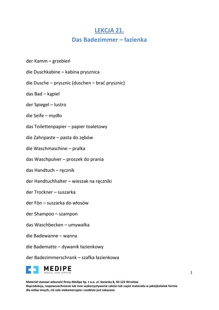 LEKCJA 21. Das Badezimmer – łazienka der Kamm – grzebień die Duschkabine – kabina prysznica die Dusche – prysznic (duschen – brać prysznic) das Bad – kąpiel der Spiegel – lustro die Seife – mydło das Toilettenpapier – papier toaletowy die Zahnpaste – pasta do zębów die Waschmaschine – pralka das Waschpulver – proszek do prania das Handtuch – ręcznik der Handtuchhalter – wieszak na ręczniki der Trockner – suszarka der Fön – suszarka do włosów der Shampoo – szampon das Waschbecken – umywalka die Badewanne – wanna die Badematte – dywanik łazienkowy der Badezimmerschrank – szafka łazienkowa 1 Materiał stanowi własność firmy Medipe Sp. z o.o. ul. Szewska 8, 50-122 Wrocław Reprodukcja, rozpowszechnianie lub inne wykorzystywanie całości lub części materiału w jakiejkolwiek formie dla celów innych, niż cele niekomercyjne i osobiste jest zakazane die Körperpflege – higiena osobista die Waage – waga die Toilette – wc baden – kąpać się sich waschen – myć się waschen – prać Przysłowia: Dem Glücklichen schlagt keine Stunde. – Szczęśliwi czasu nie liczą. Heiße Bitte, kalter Dank. – Gorąca prośba, zimne podziękowanie. 2 Materiał stanowi własność firmy Medipe Sp. z o.o. ul. Szewska 8, 50-122 Wrocław Reprodukcja, rozpowszechnianie lub inne wykorzystywanie całości lub części materiału w jakiejkolwiek formie dla celów innych, niż cele niekomercyjne i osobiste jest zakazane